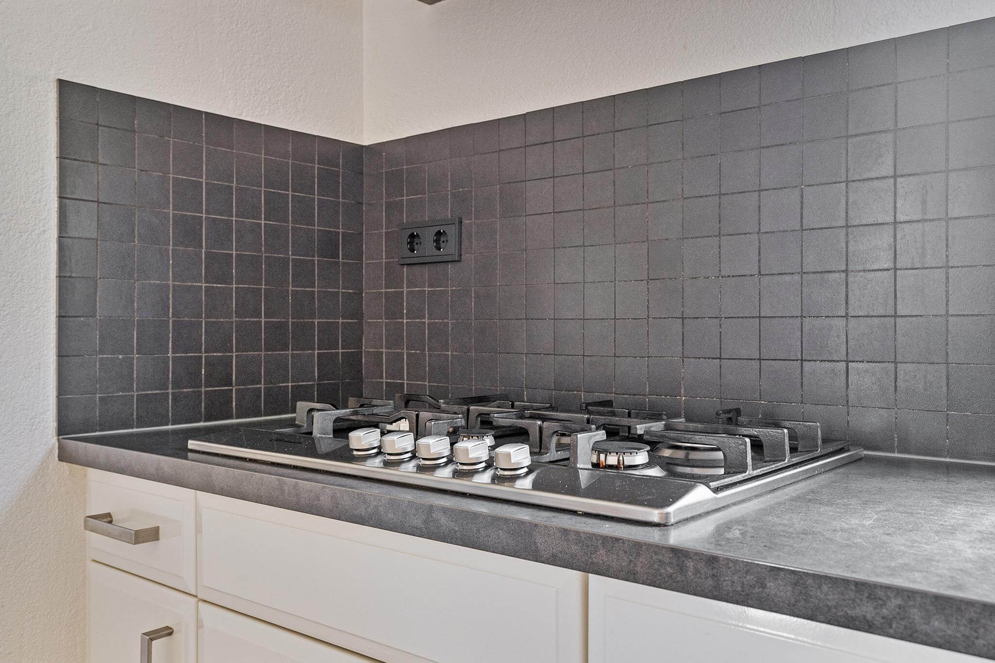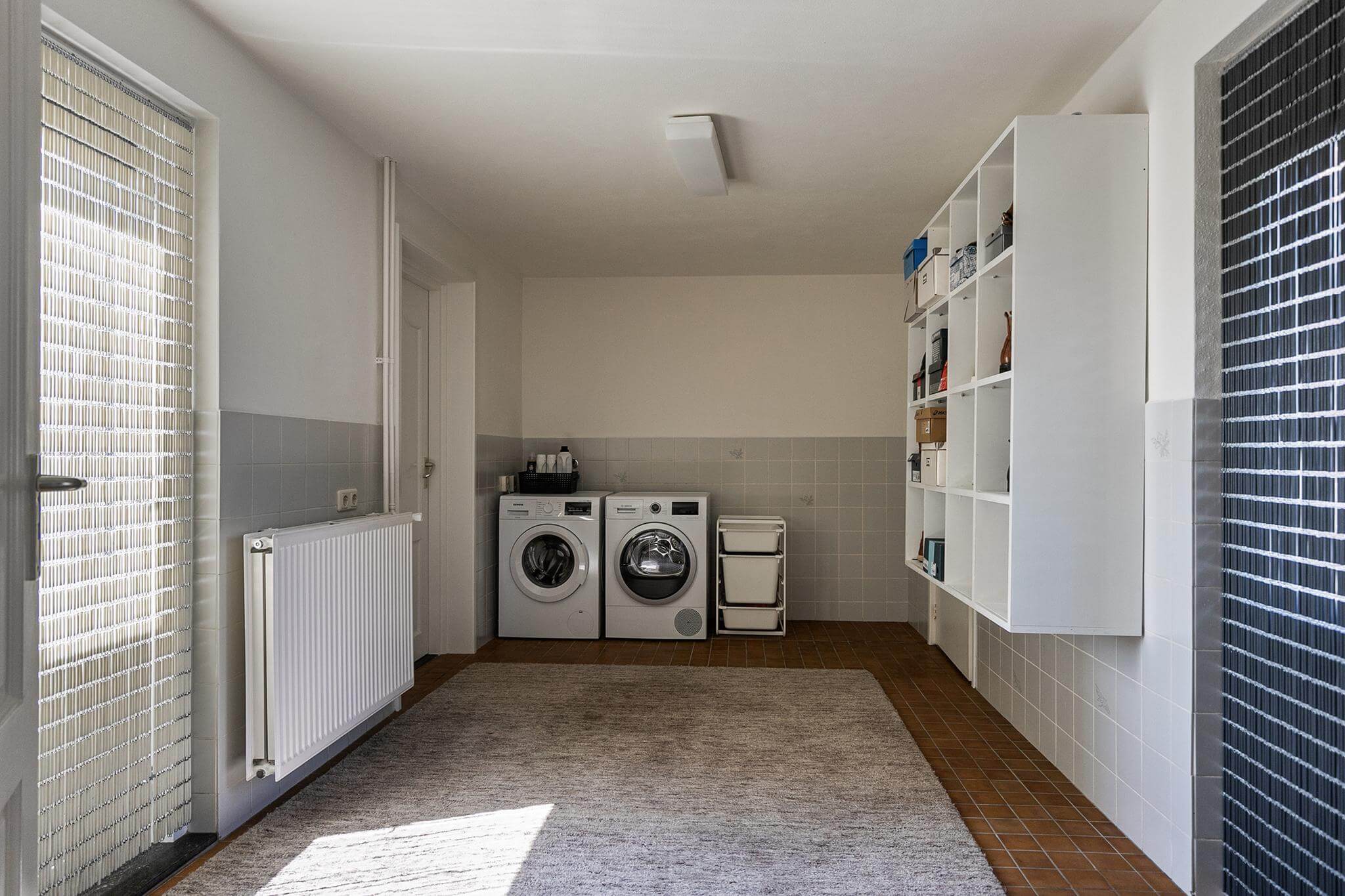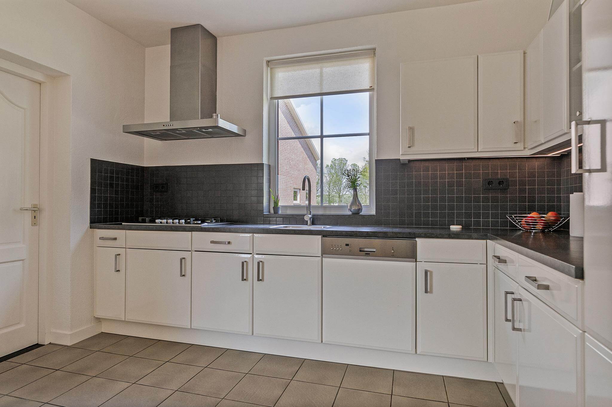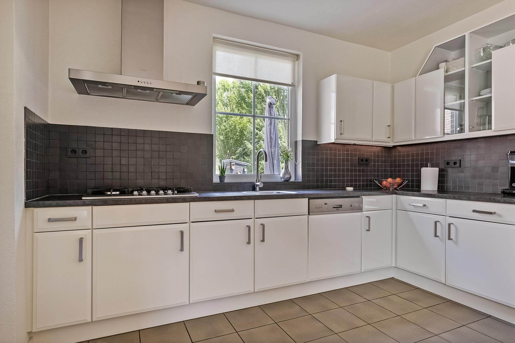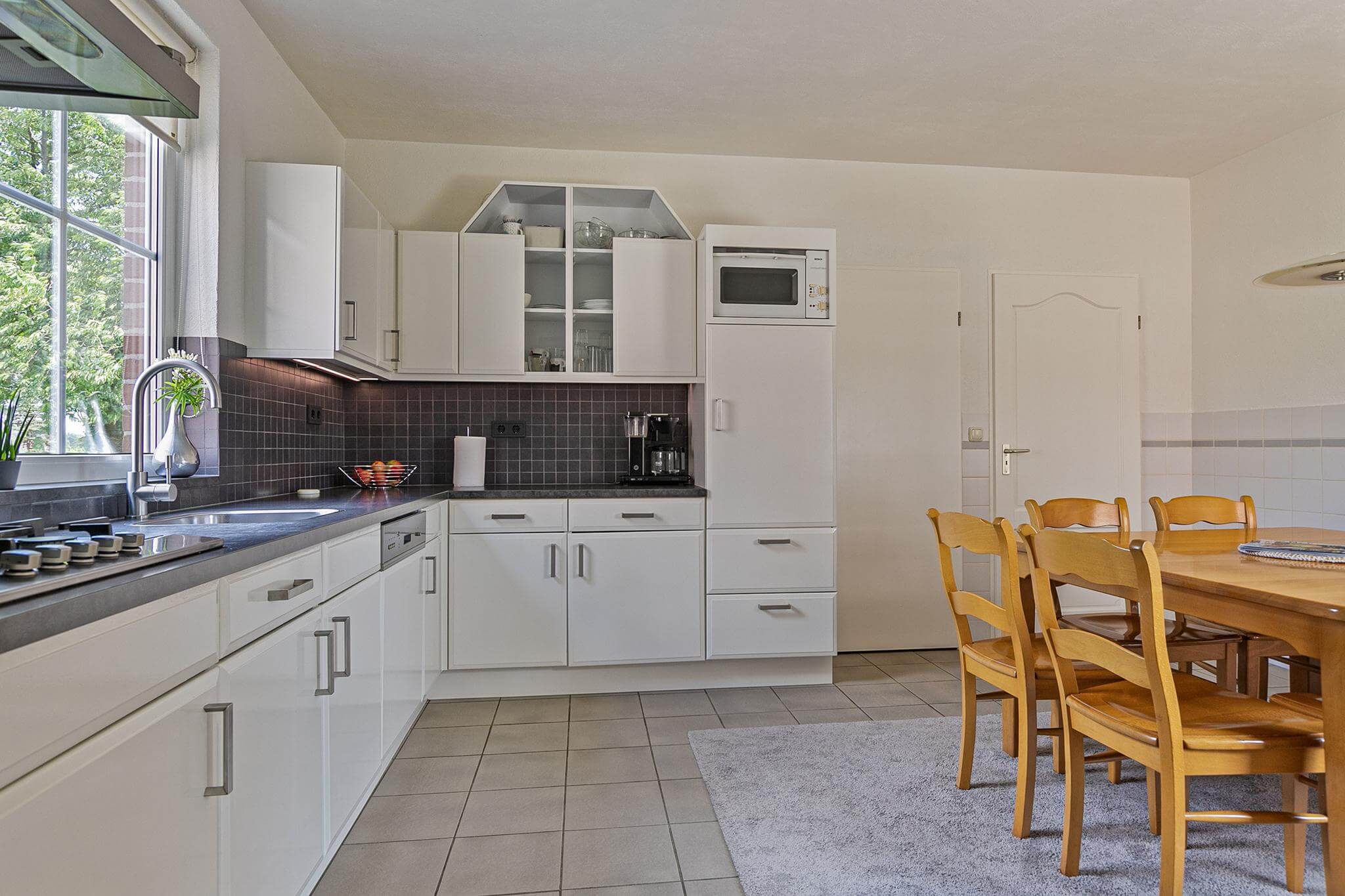 De ruime leefkeuken is in hoek opgesteld en voorzien van diverse inbouwapparatuur zoals een koelkast, magnetron, vaatwasser, 5-pits gasfornuis en een afzuigkap. De aangrenzende bijkeuken biedt extra functionaliteit met een uitstortbak en aansluitingen voor witgoed. Via de bijkeuken bereikt u het terras, kantoor en de studieruimte.