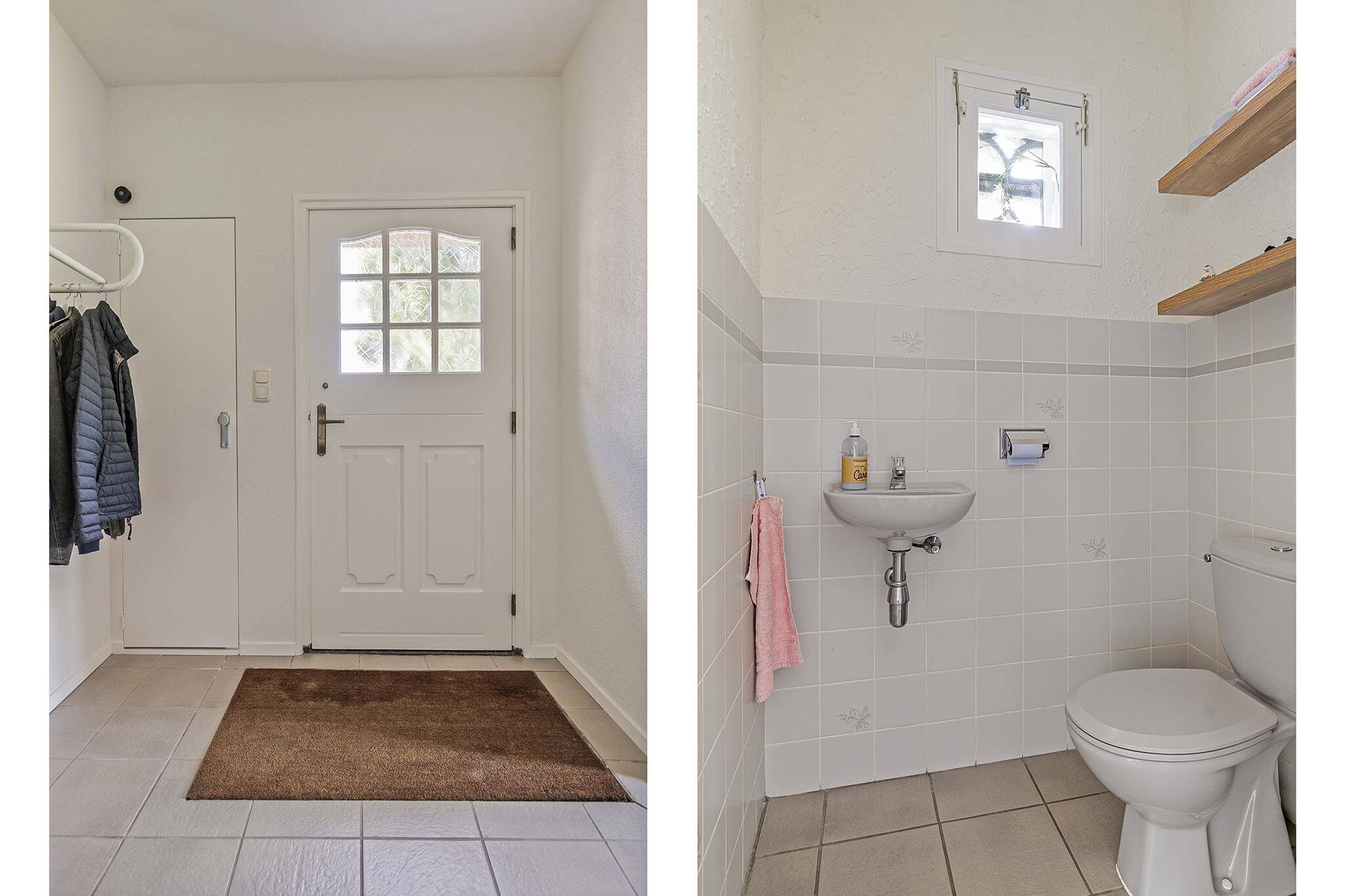 Via de ruime oprit bereikt u de entree van de woning. Bij binnenkomst verwelkomt de ruime entree u met een fraaie trapopgang, een modern toilet met fonteintje, en de meterkast. De entree geeft toegang tot de woonkamer.