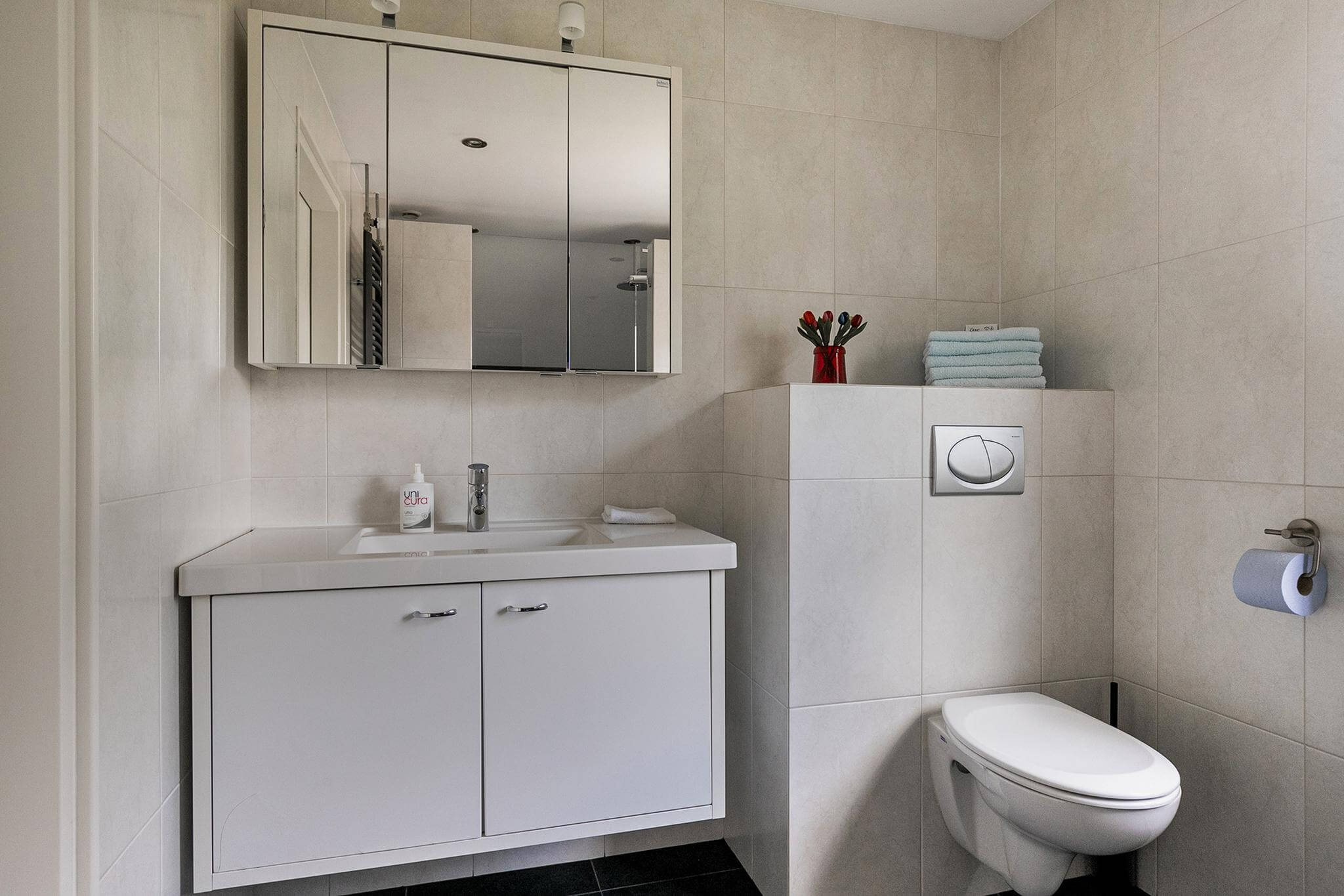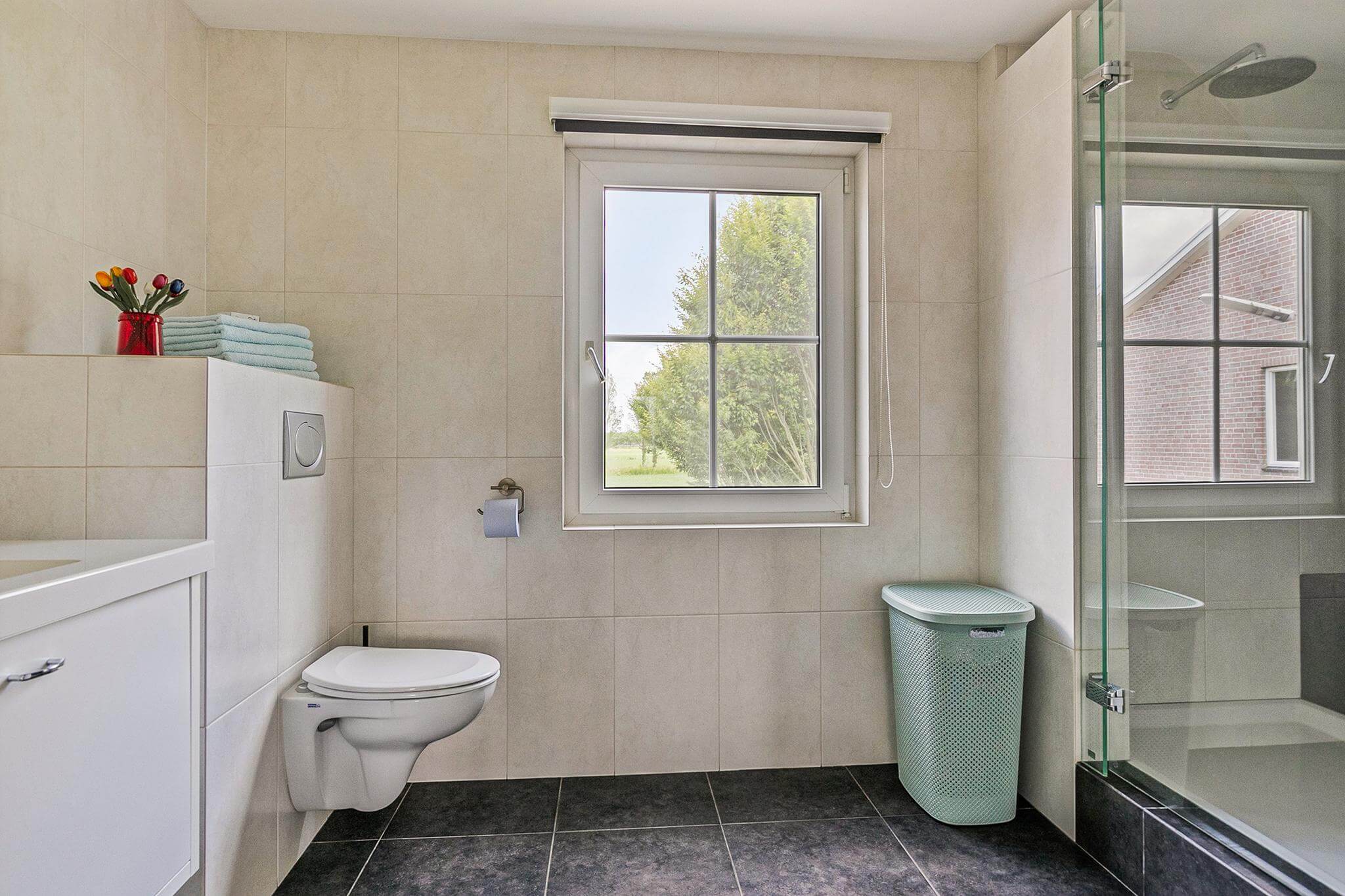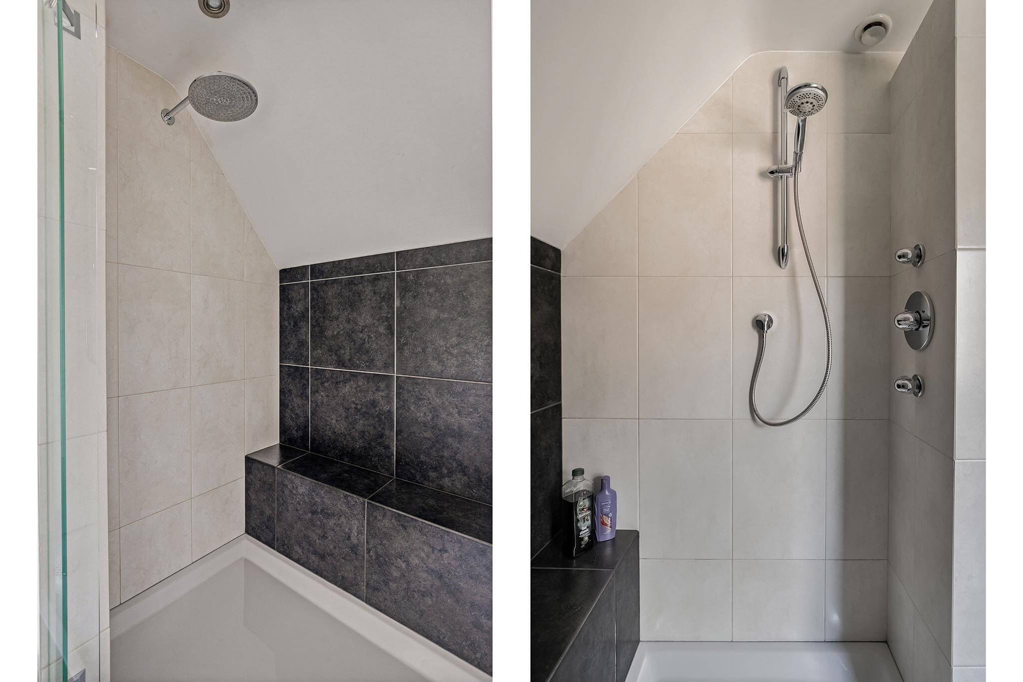 De moderne badkamer is uitgerust met een grote dubbele douche voorzien van regen- en handdouche, een design radiator, toilet, stijlvolle wastafel met meubel en een spiegelkast. Het gebruik van donkere vloertegels en lichte wandtegels, gecombineerd met sfeervolle inbouwspotjes, maakt deze badkamer een waar genot.