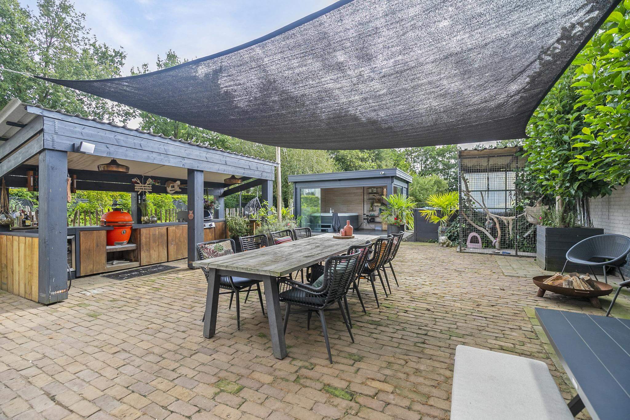 De tuin van de woning is voorzien van een buitenkeuken, een overdekte jacuzzi met daartussen een royaal zonneterras.