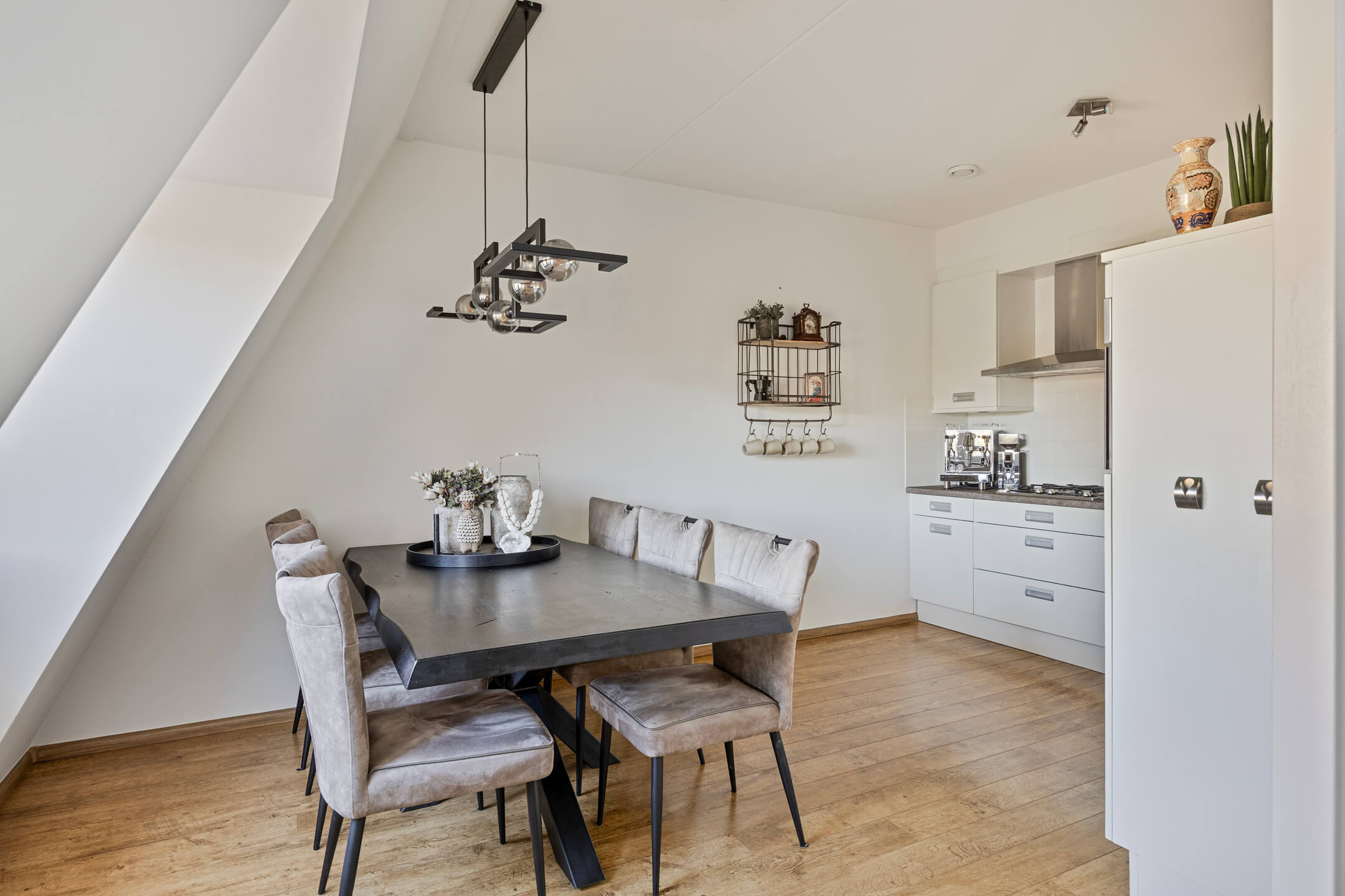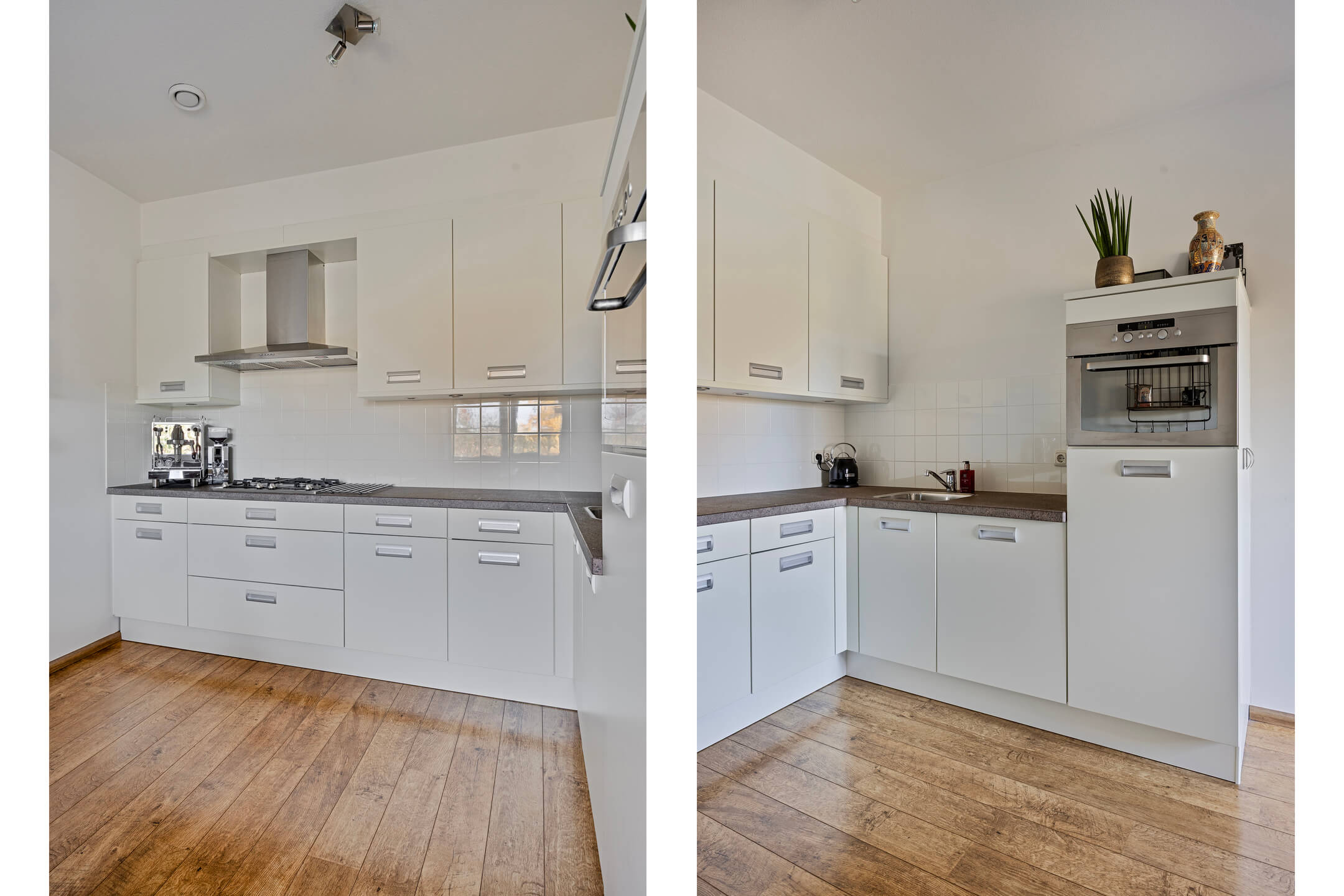 De keuken mag er zijn: strak uitgevoerd in een hoekopstelling. Diverse boven- en onderkasten met inbouwapparatuur, te weten: gaskookplaat, combi-magnetron, koelkast, spoelbak en een vaatwasser. Alles wat je nodig hebt – en iets meer.