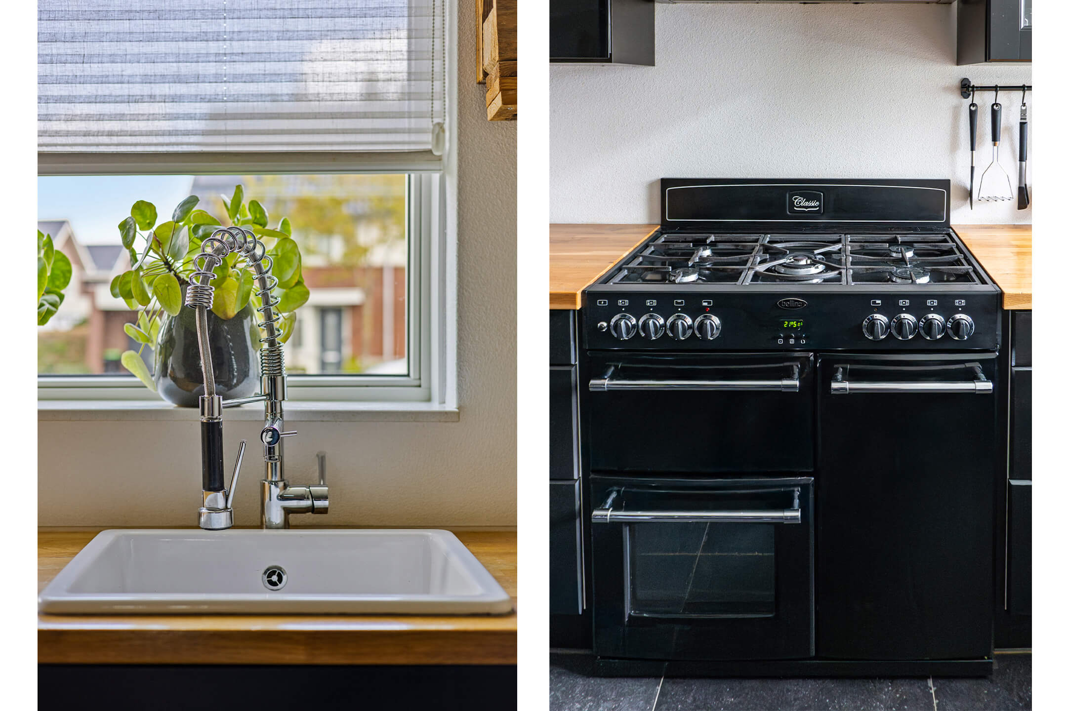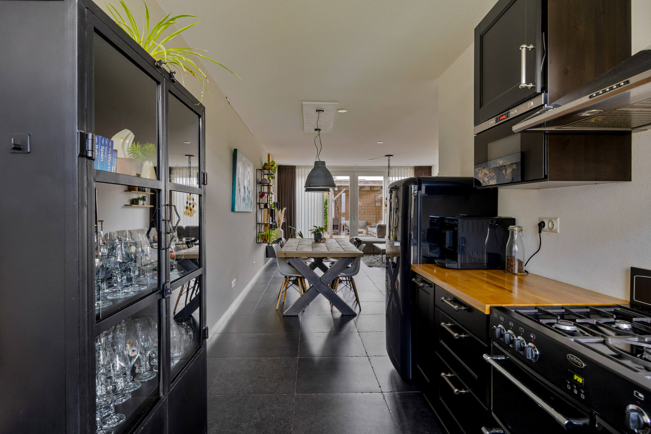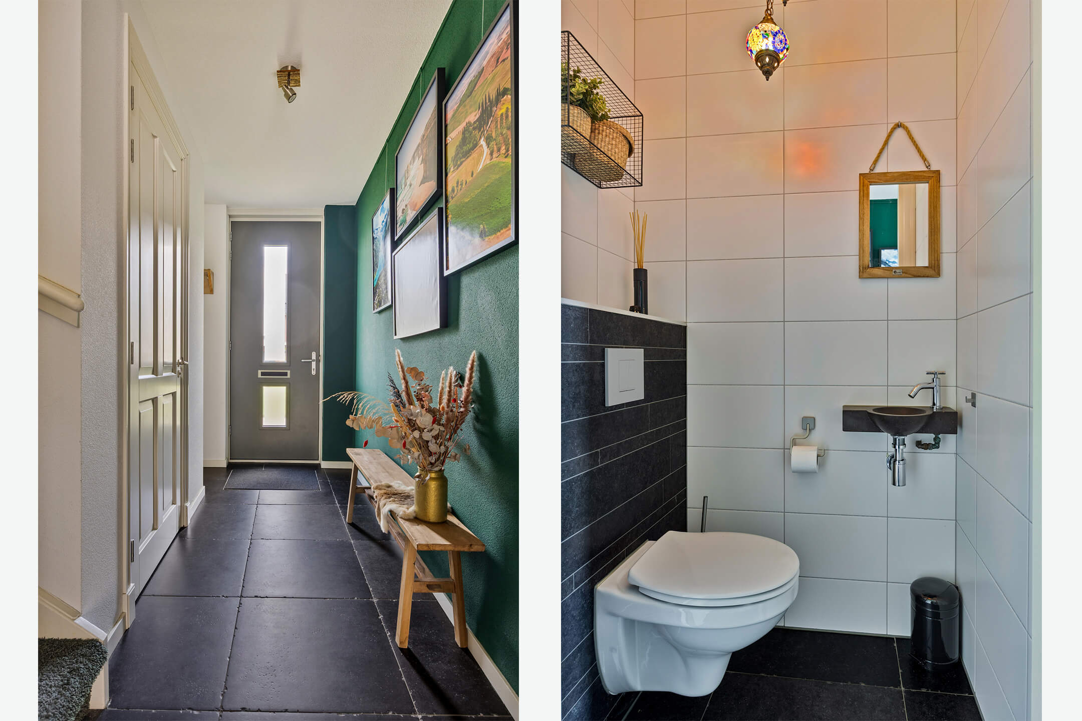 De gehele begane grond is voorzien van vloerverwarming. Je komt binnen in de hal met meterkast, toilet met fontein en trap naar boven. Vanuit de hal bereik je de royale, uitgebouwde woonkamer met voorraadkast en een open keuken aan de voorzijde. De keuken is uitgerust met complete inbouwapparatuur en biedt mooi zicht op het groen in de wijk. Aan de achterzijde zorgen twee schuifdeuren voor een fijne verbinding met de tuin.