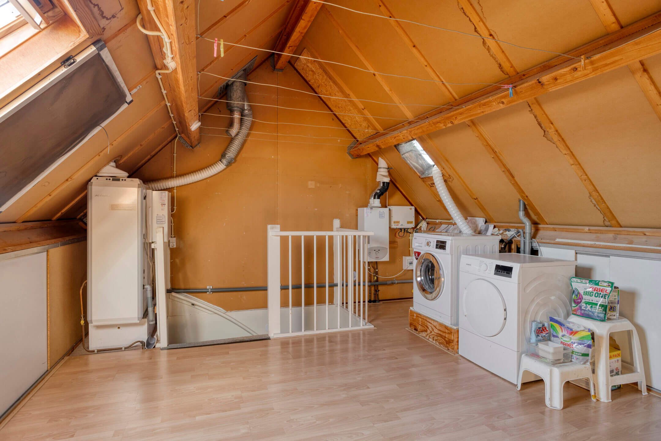 Een volwaardige verdieping (middels vaste trap bereikbaar) met volop mogelijkheden, bijvoorbeeld voor het realiseren van een vierde slaapkamer of werkkamer. Hier bevinden zich tevens de CV-installatie, de aansluitingen voor witgoedapparatuur en extra opbergruimte.