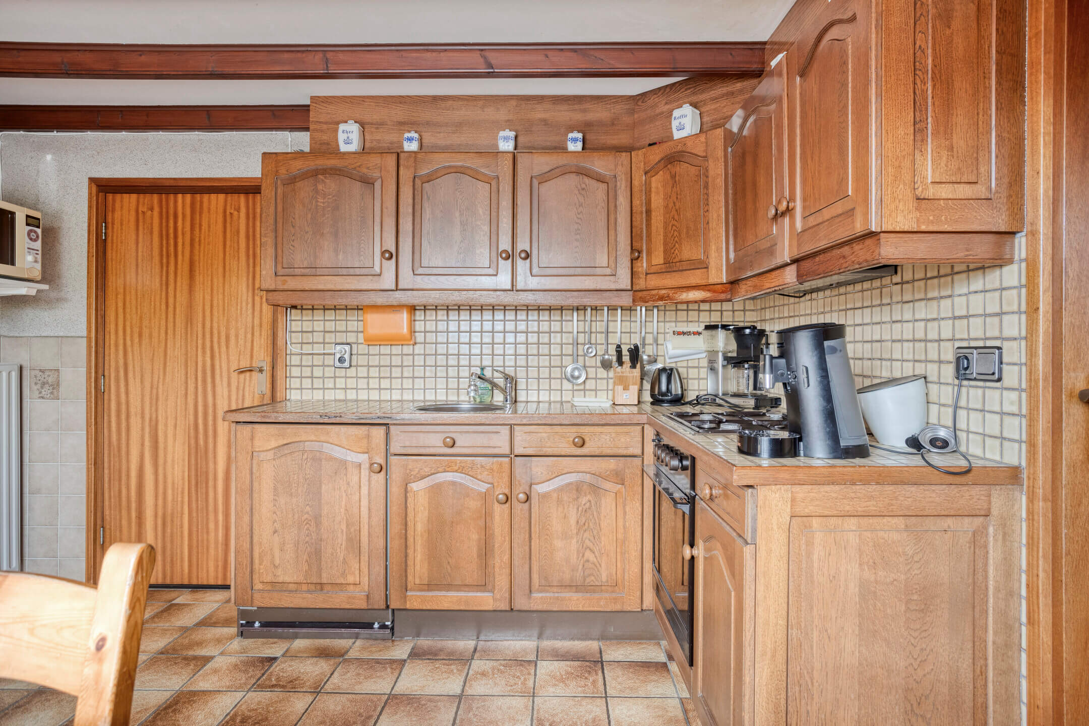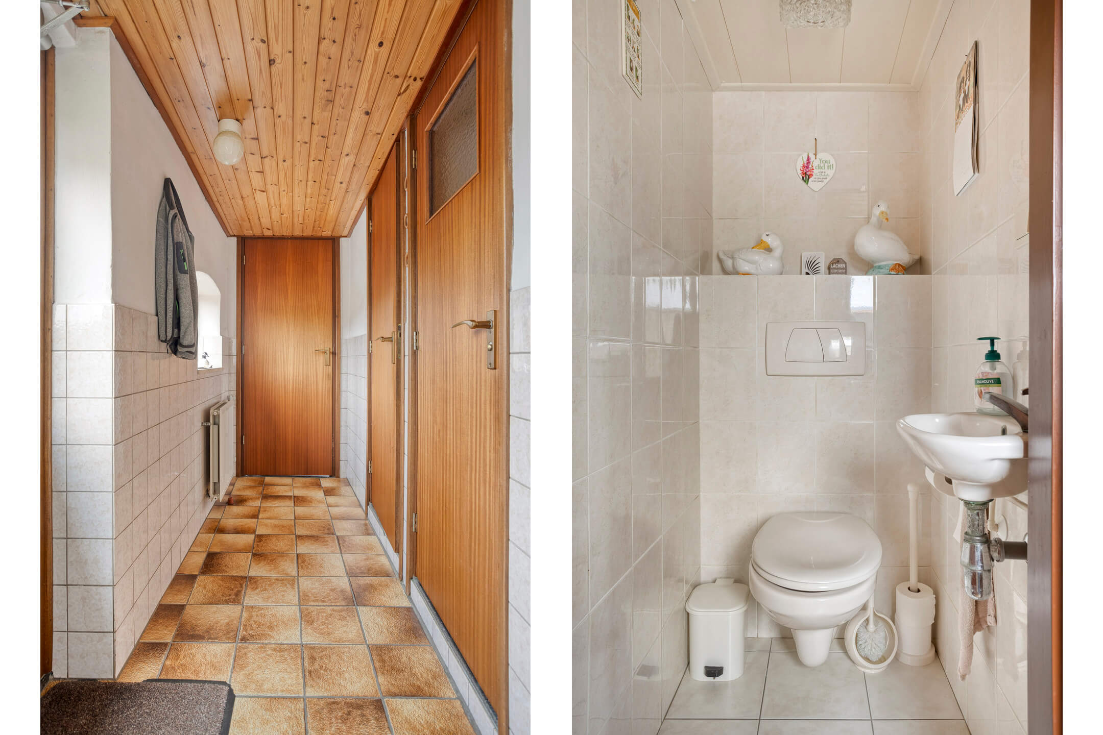 De woonkeuken is uitgerust met een degelijke houten keukenopstelling met onder andere een gasfornuis, oven, koelkast en spoelbak. Aangrenzend bevindt zich een hal met toegang tot het toilet (met hangcloset en fonteintje), de praktische wasruimte met witgoedaansluitingen, en het achterhuis.