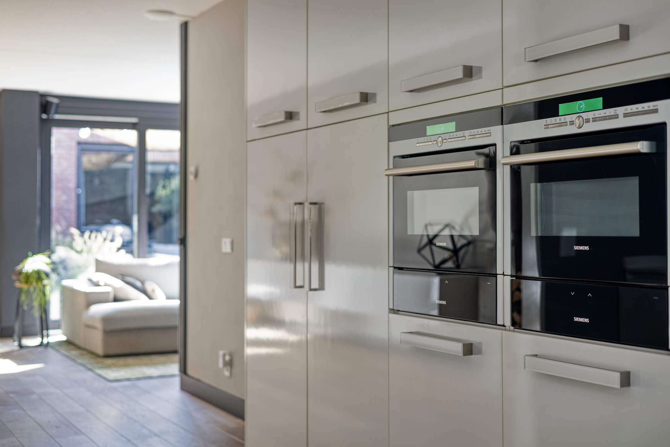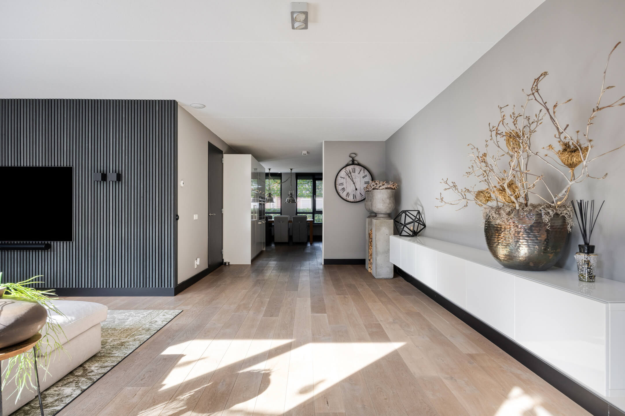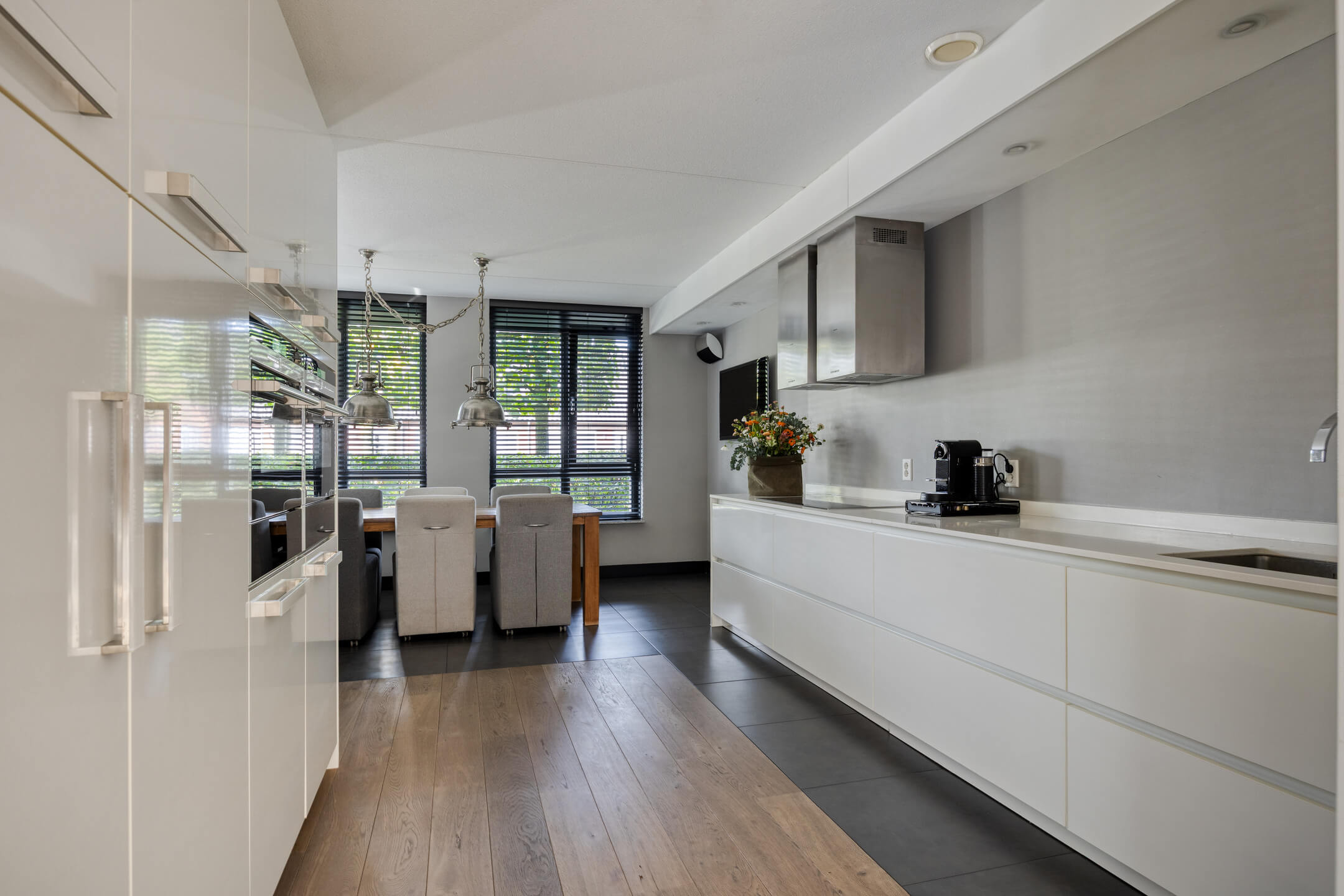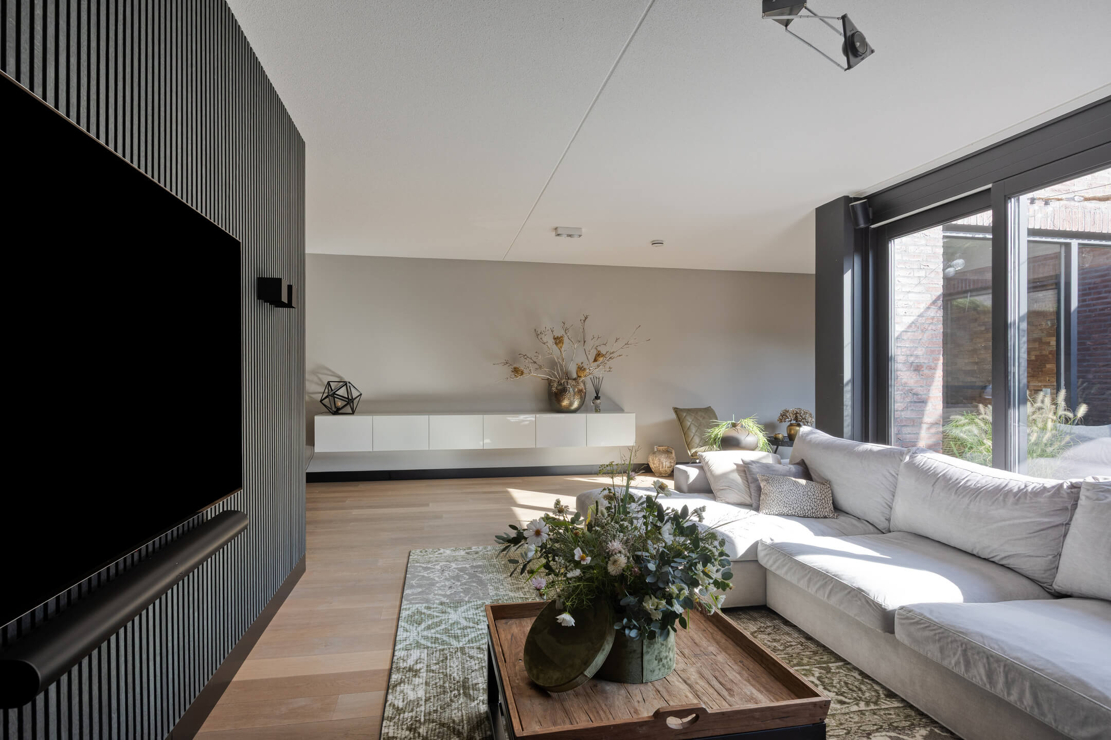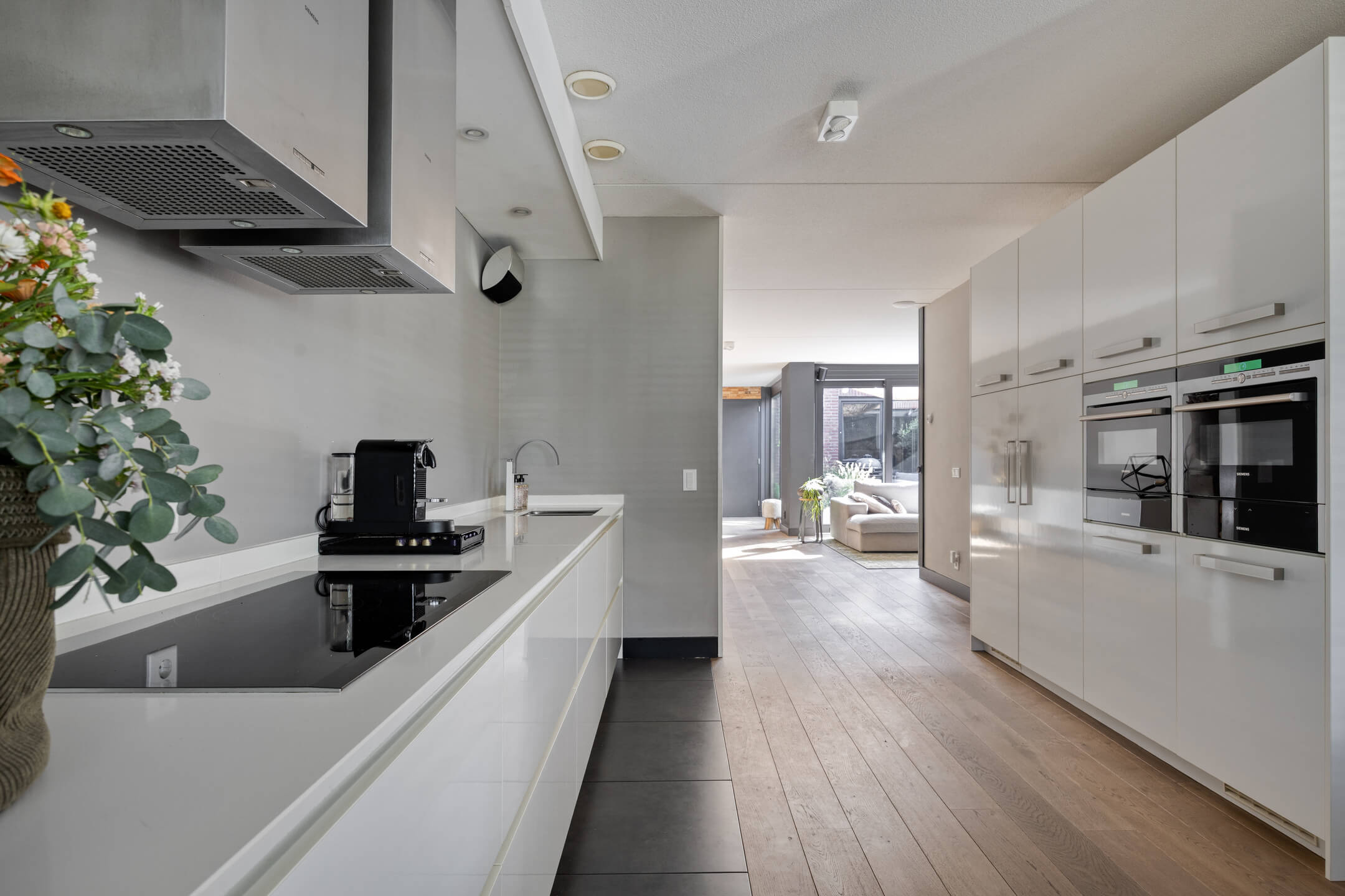 De royale woonkamer is een heerlijke leefruimte met akoestische wandpanelen, een grote zithoek en volop daglicht dankzij de schuifpui naar de patio. De woonkamer staat in halfopen verbinding met de ruime leefkeuken aan de voorzijde. Deze moderne keuken is uitgerust met een inductiekookplaat (met flexzones én wok), dubbele afzuiging, 1,5 RVS-spoelbak, vaatwasser, koelkast, dubbele combi-oven, warmhoudlades en een vriezer.