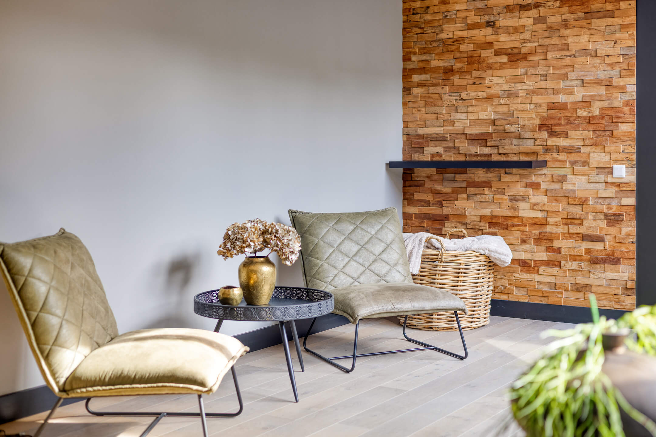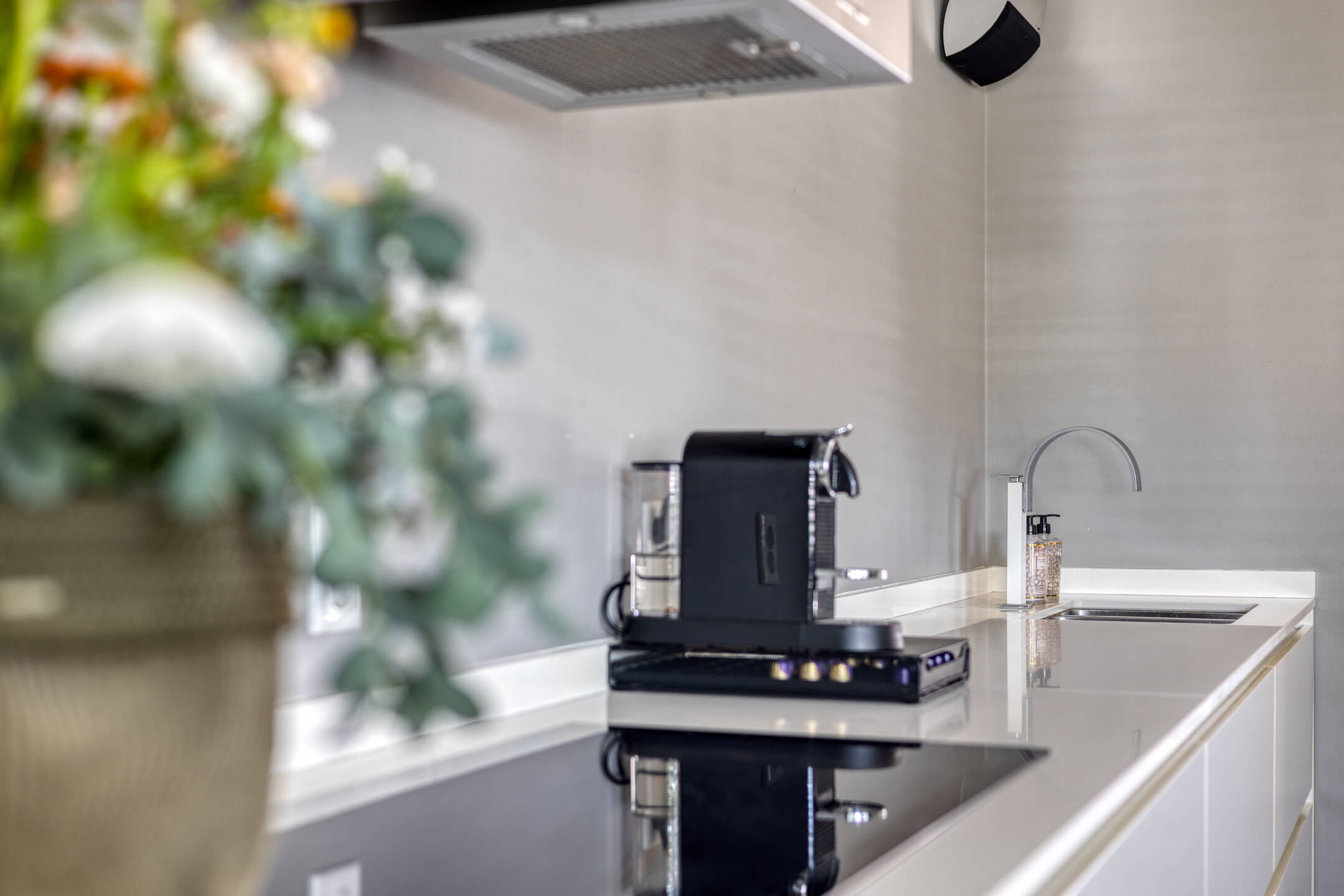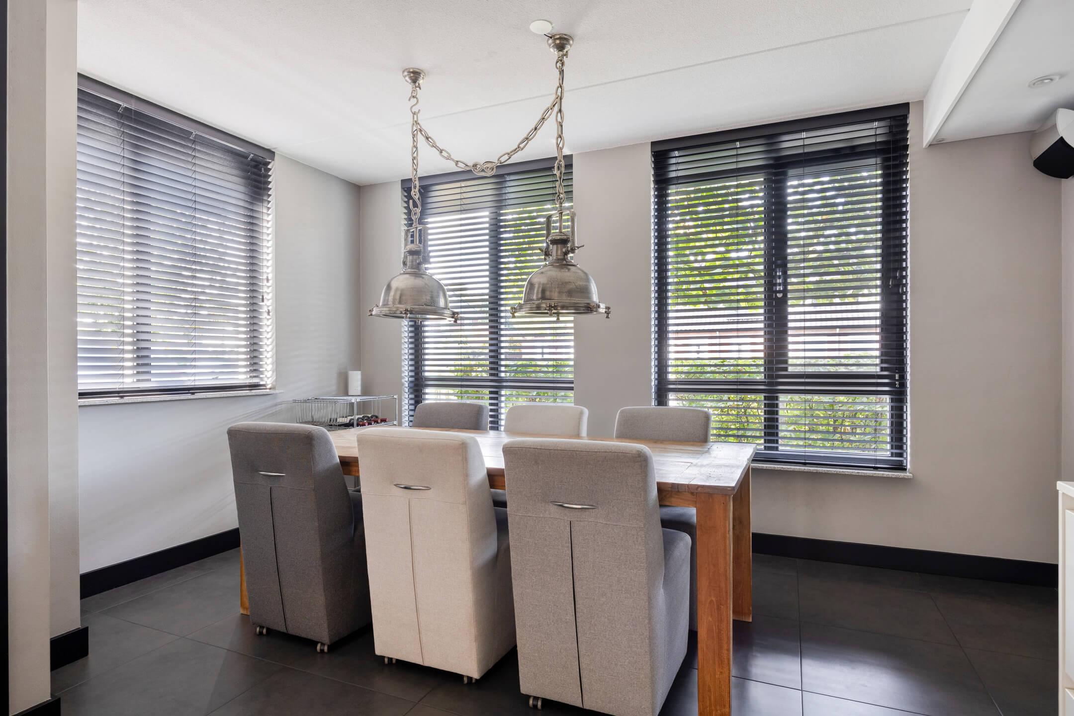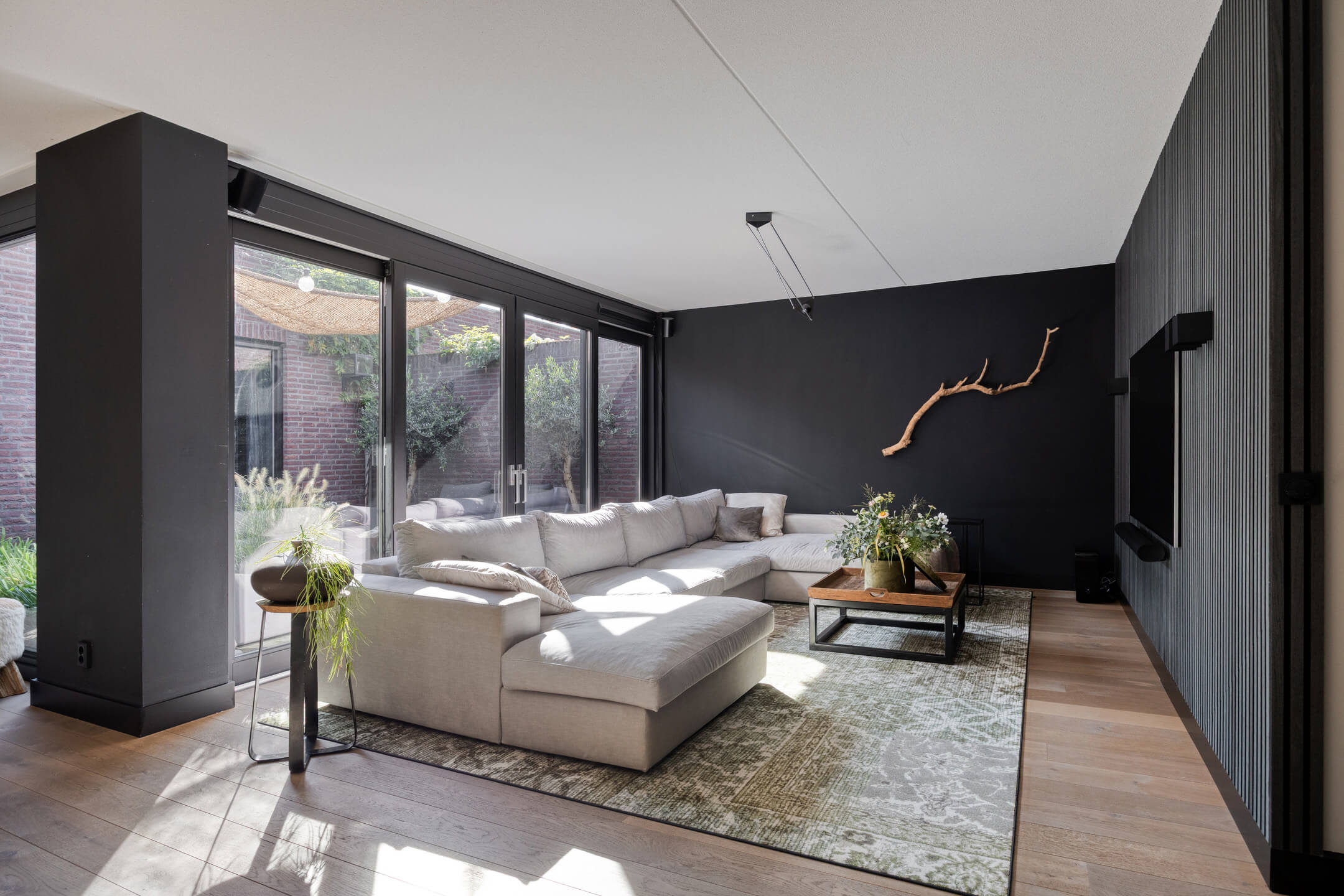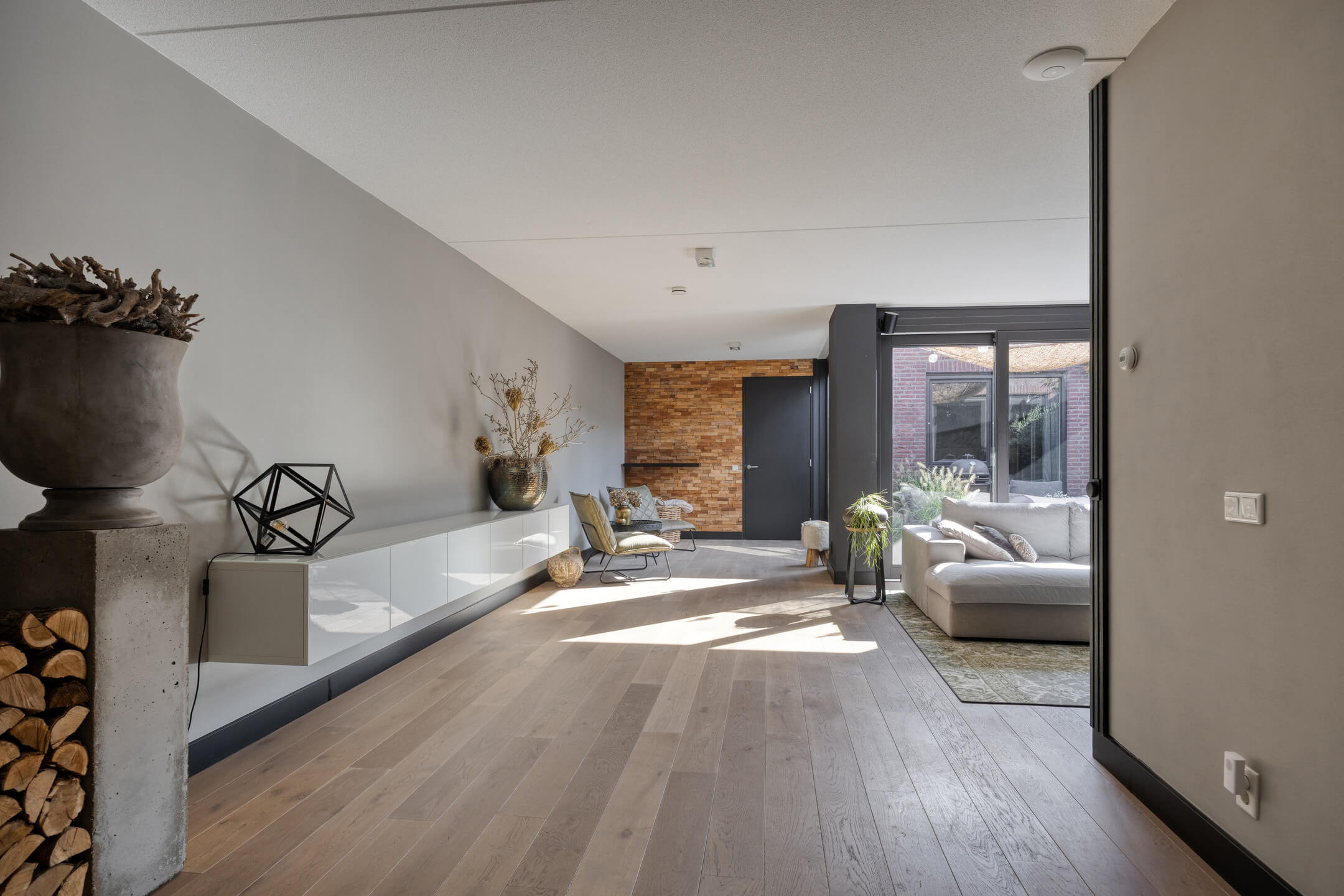 De royale woonkamer is een heerlijke leefruimte met akoestische wandpanelen, een grote zithoek en volop daglicht dankzij de schuifpui naar de patio. De woonkamer staat in halfopen verbinding met de ruime leefkeuken aan de voorzijde. Deze moderne keuken is uitgerust met een inductiekookplaat (met flexzones én wok), dubbele afzuiging, 1,5 RVS-spoelbak, vaatwasser, koelkast, dubbele combi-oven, warmhoudlades en een vriezer.