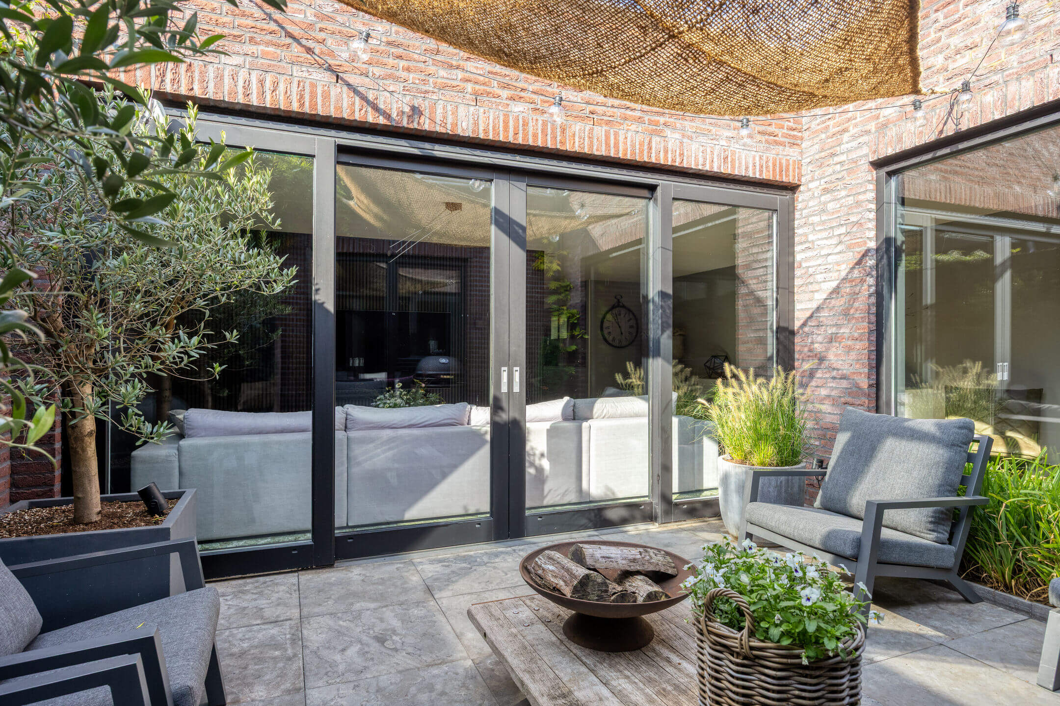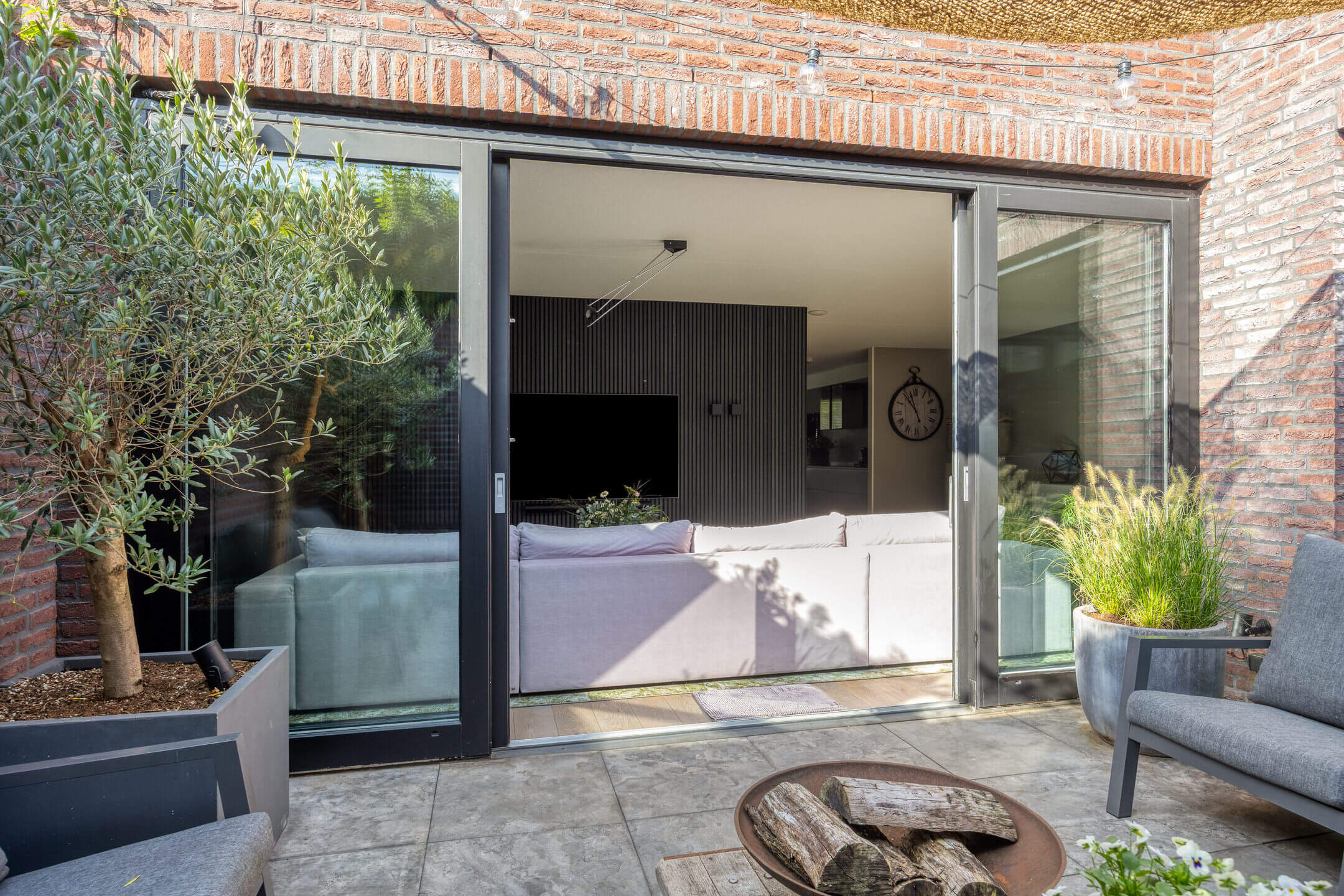 De patio is modern en onderhoudsvriendelijk aangelegd met grote grijze tegels en sfeervolle verlichting: een plek om het hele jaar door van te genieten.