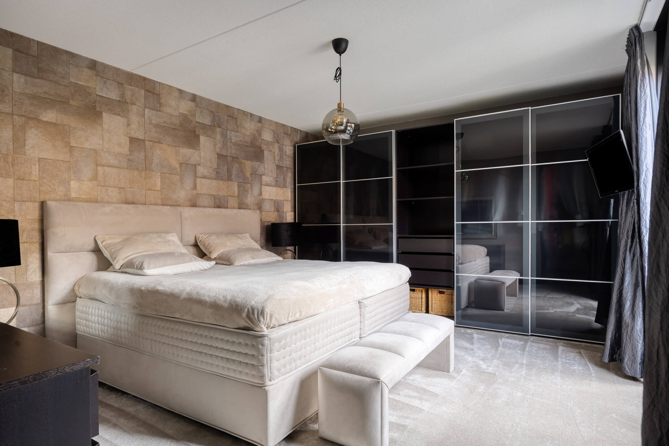 Via een hal aan de achterzijde bereikt u de masterbedroom, badkamer en wasruimte. De slaapkamer is heerlijk ruim, licht en voorzien van luxe afwerking en een airco.