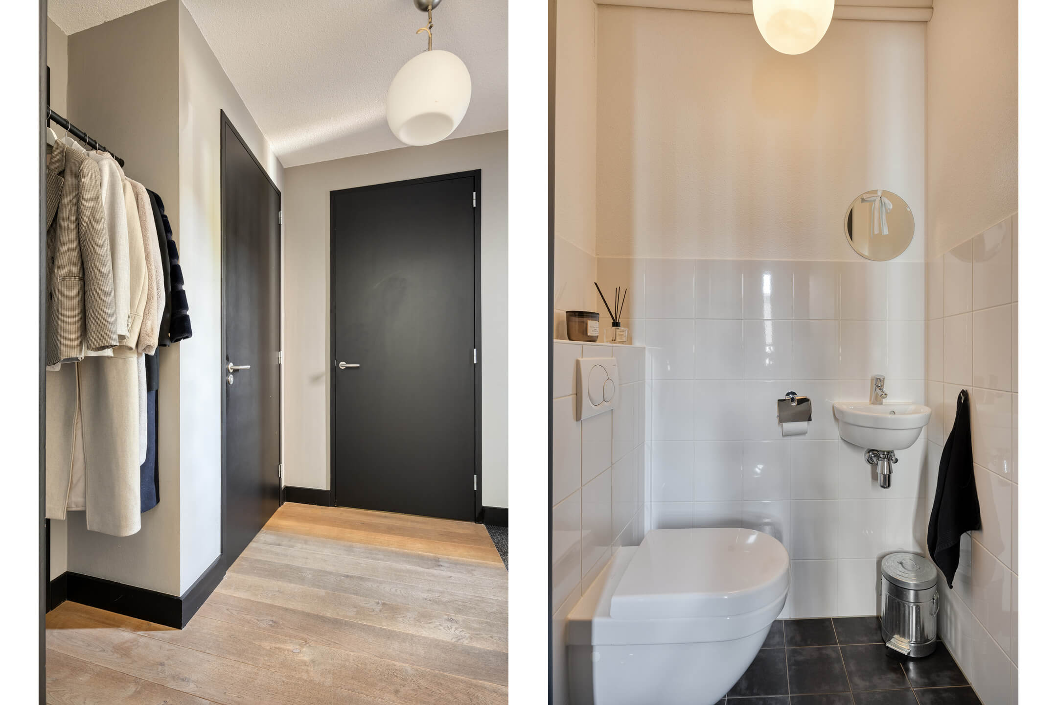 Bij binnenkomst in de ruime entree valt direct de strakke afwerking op. Hier vindt u de garderobenis met daarachter de meterkast en een moderne toiletruimte met fonteintje en automatische verlichting. Aan de voorzijde bevindt zich de berging waar met gemak plaats is voor 2 fietsen. In deze berging hangt de omvormer voor de 14 zonnepanelen.