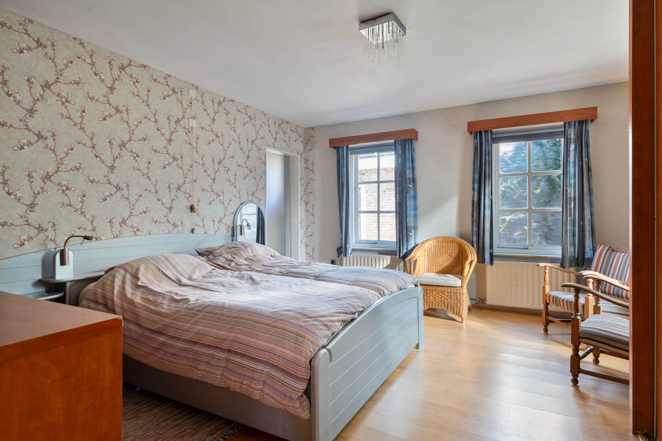 De ruime woonkamer ademt sfeer dankzij het rustieke balkenplafond, de houten vloer en de sfeervolle schouw met houtkachel. Grote ramen en openslaande deuren naar de serre zorgen voor een prachtige lichtinval en een natuurlijke verbinding met de tuin.