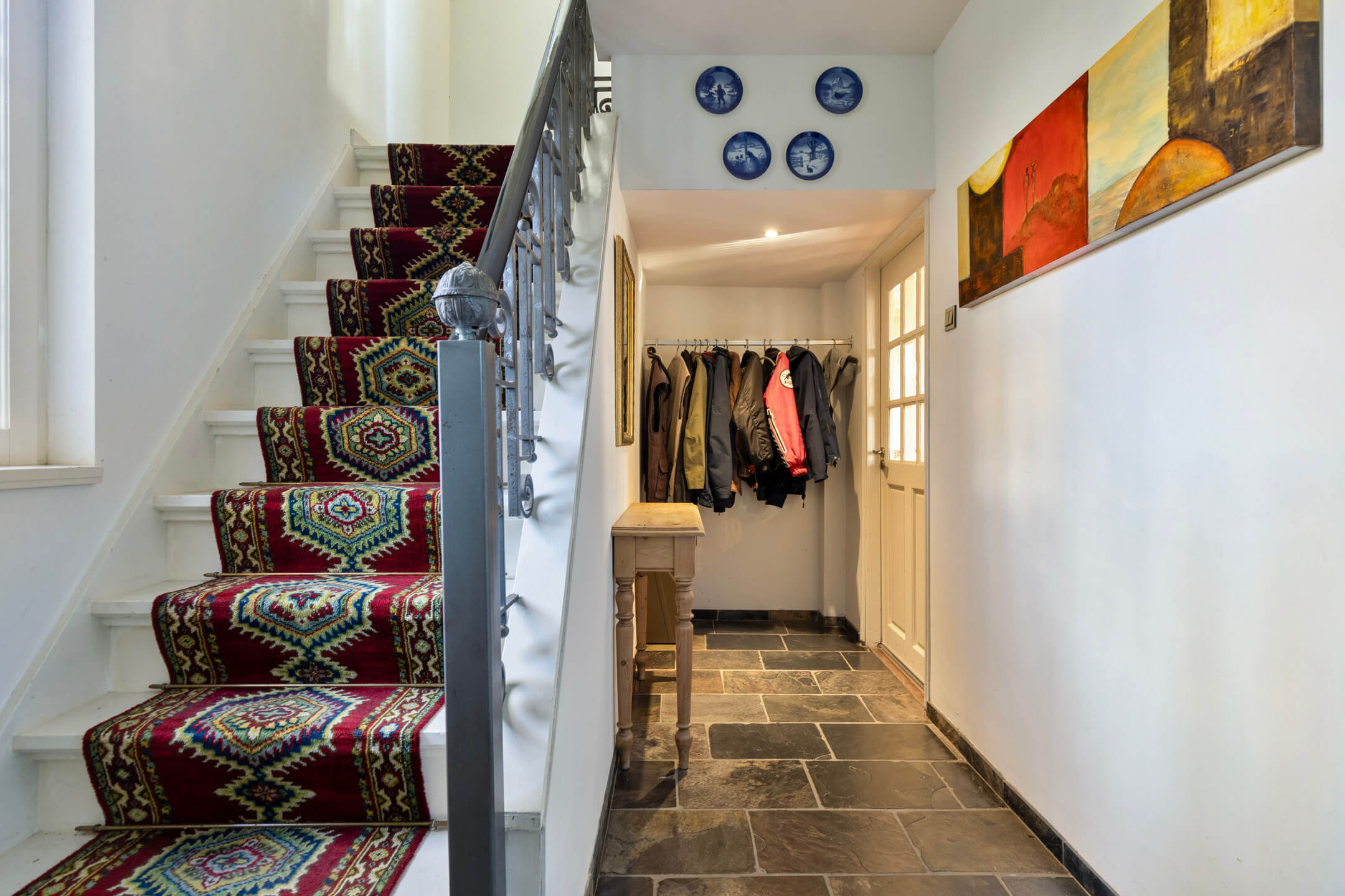 Bij binnenkomst via de karakteristieke entree wordt u direct omarmd door de warme ambiance. De imposante trapopgang met sierhekwerk, de garderobe en het praktische toilet met fontein en raam zorgen voor een stijlvolle en functionele entree.