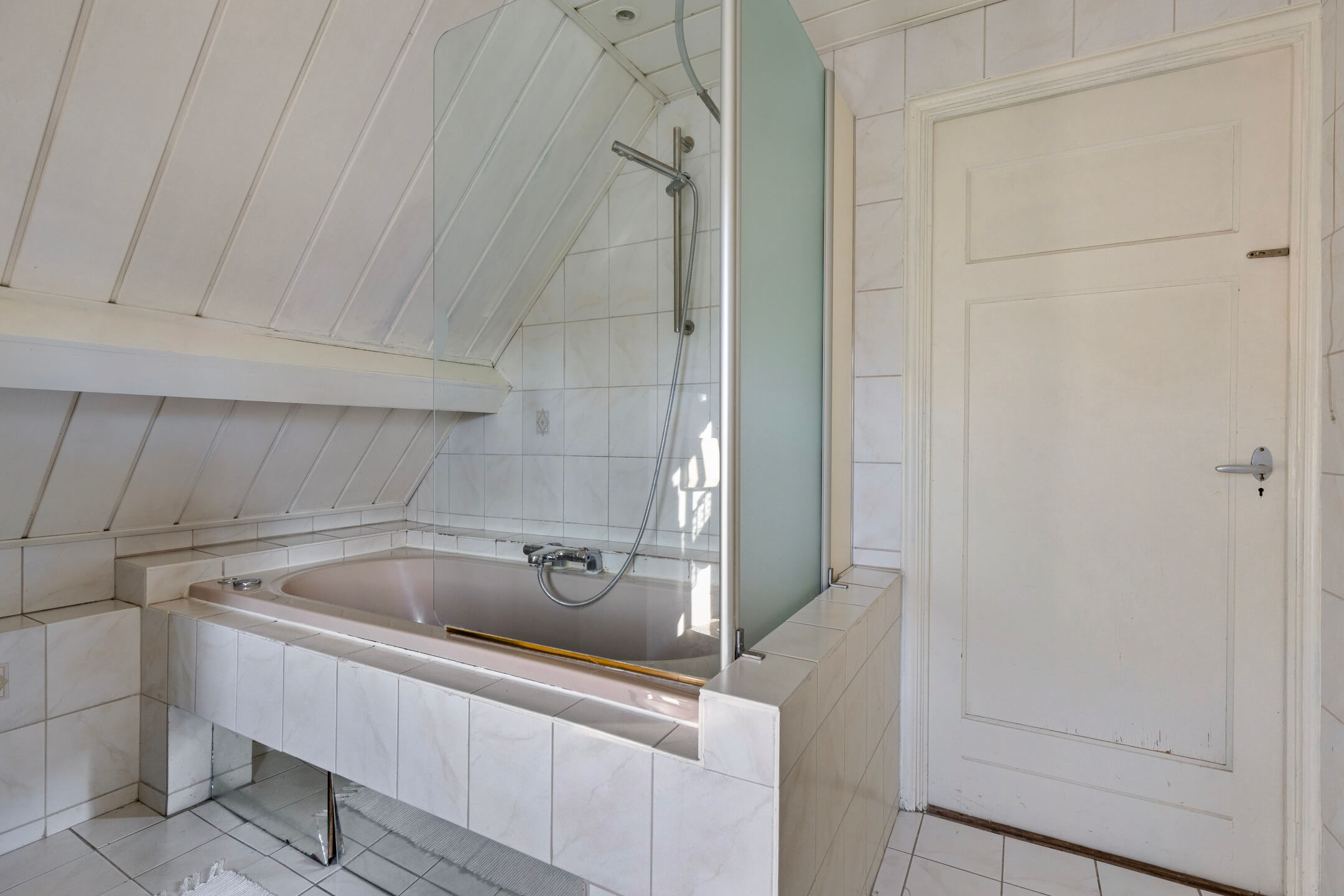 Via de trapopgang bereikt u de overloop met een praktische inbouwkast. Hier bevinden zich drie ruime slaapkamers, elk met een laminaatvloer en afwerkingen die perfect passen bij de stijl van de woning. De tweede badkamer beschikt over een ligbad met douche, wastafel en toilet.