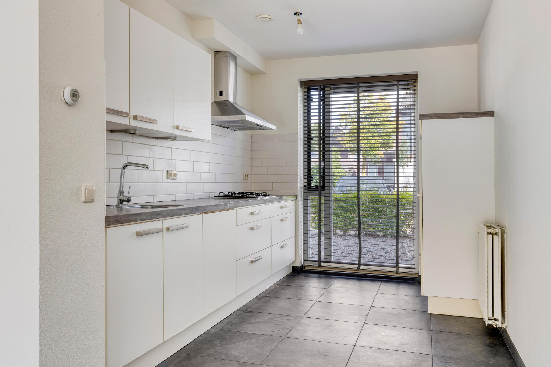 De open keuken is voorzien van een rechte opstelling met diverse inbouwapparatuur, te weten een vaatwasser, 4-pits gasfornuis en afzuigkap. Diverse bovenkasten zorgen voor voldoende bergruimte.