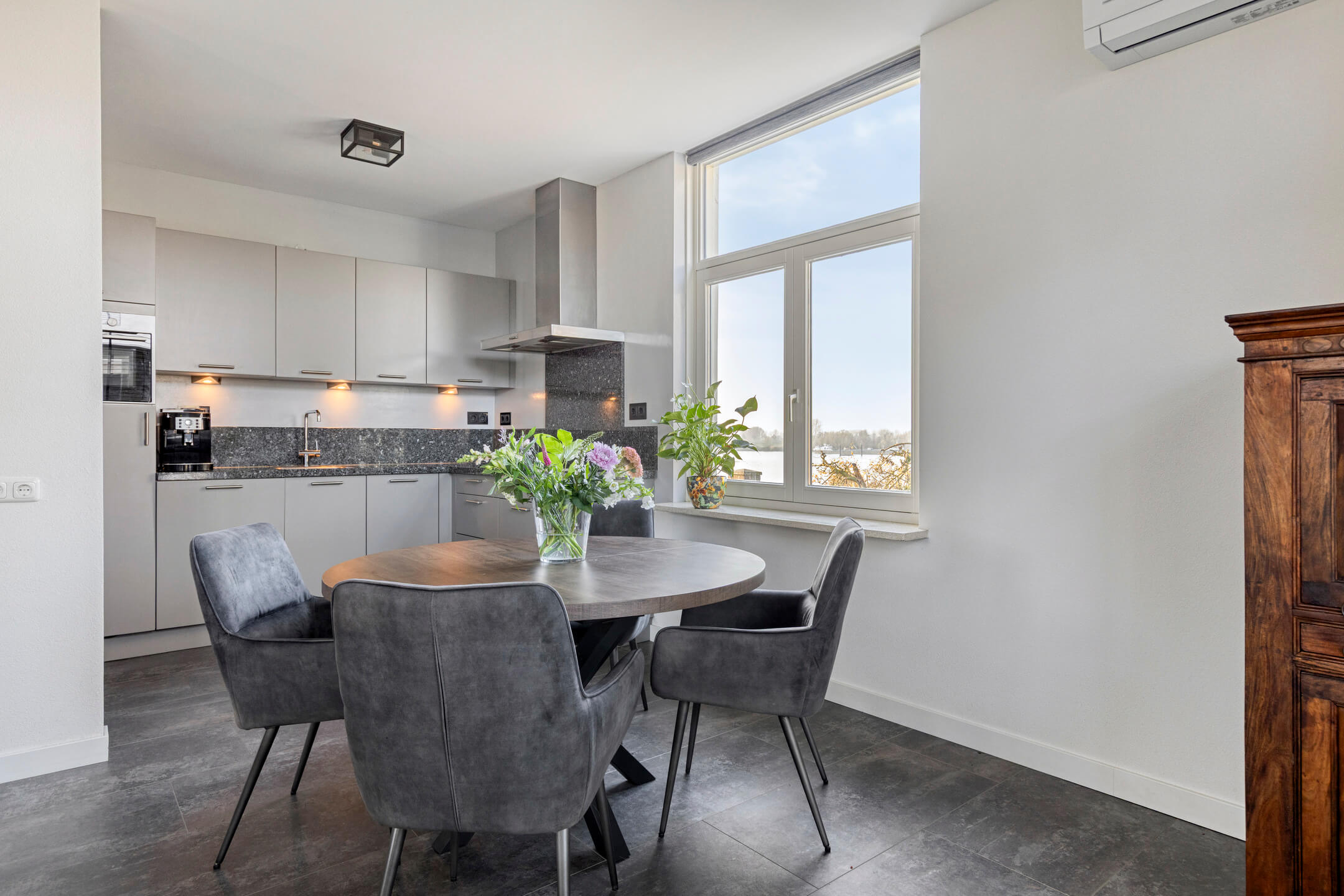 De begane grond (dijkniveau) vormt het sfeervolle hart van de woning en wordt gekenmerkt door veel licht en een fraai uitzicht op zowel de Maas als de dijk. De woonkamer is ruim opgezet en voorzien van een pelletkachel en airco, waardoor het hier het hele jaar door comfortabel verblijven is. Aansluitend ligt de open, hoekopgestelde keuken met natuurstenen werkblad en complete inbouwapparatuur, waaronder een inductiekookplaat, vaatwasser, koelkast en combimagnetron. De afwerking met PVC-vloer, strak stucwerk en subtiele plintverwarming zorgt voor een verzorgde en hoogwaardige uitstraling.