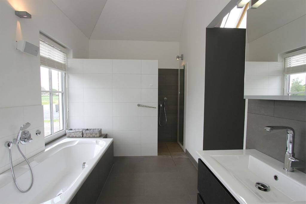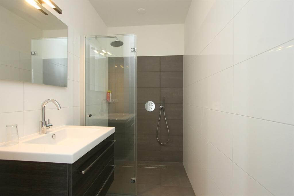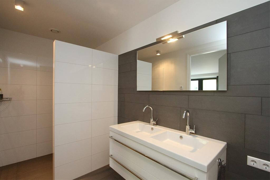 Houten vaste trap naar 1ste verdieping. Overloop met bergkast, 2 slaapkamers, badkamer met inloopdouche en wastafelmeubel, separate toiletruimte met wandcloset en fontein. De 1ste verdieping is voorzien van laminaatvloer in houtlook.