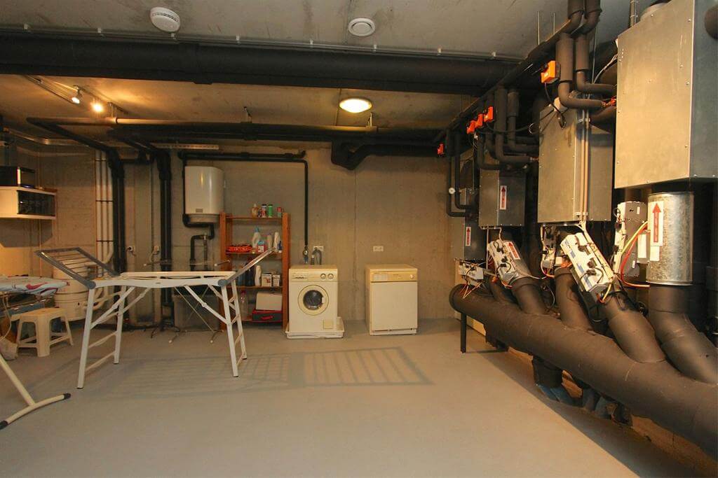 Vaste trap naar het souterrain. Zeer royale installatieruimte/opslagruimte van ca. 123 m2 met openslaande deuren naar de patio.