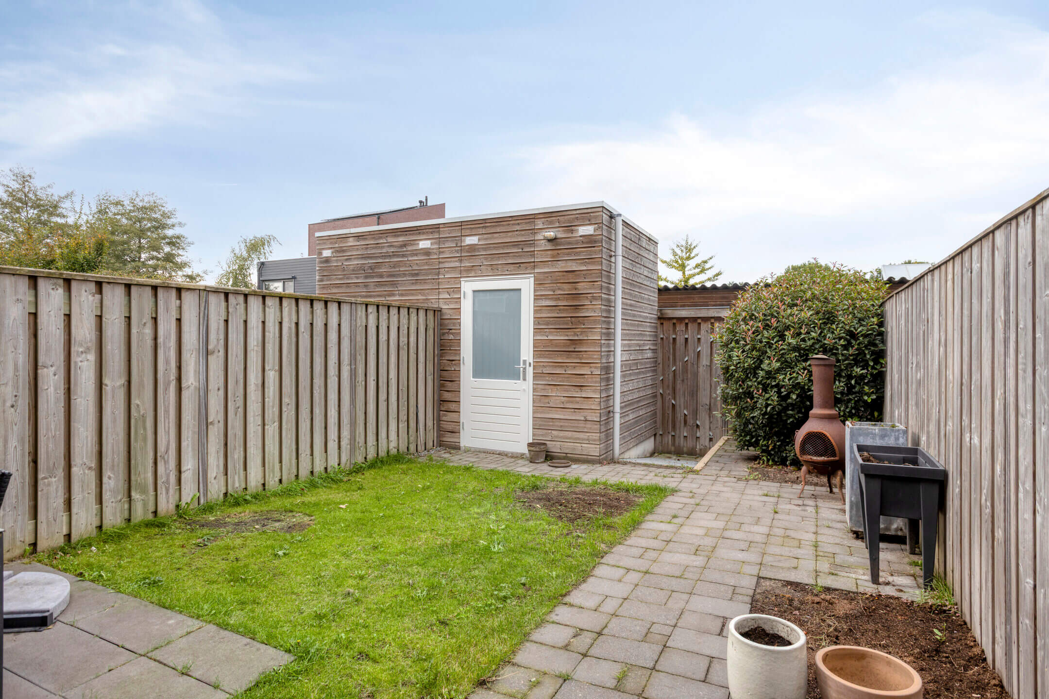 De woning beschikt over een verzorgd aangelegde voortuin en een zonnige achtertuin op het noordwesten. De achtertuin is bereikbaar via een eigen achterom en is voorzien van een ruime houten berging met elektra, ideaal voor het opslaan van bijvoorbeeld fietsen en tuingereedschap.