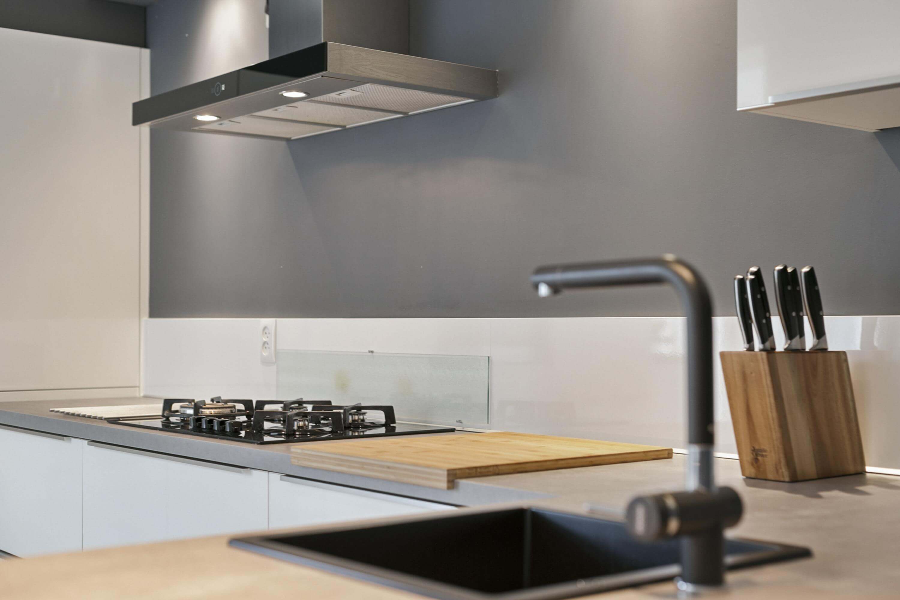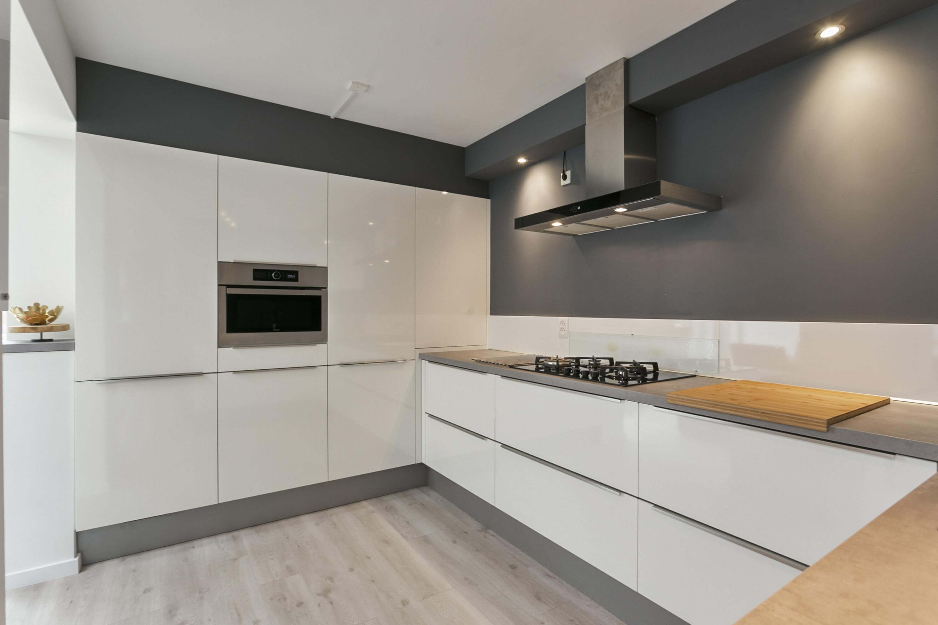 Keuken: de moderne keuken is in 2018 vernieuwd en geplaatst in hoekopstelling. De keuken is uitgevoerd in hoogglans wit met een grijs betonlook kunststof aanrechtblad. Er is een 4-pit gasfornuis, rvs afzuigkap, vaatwasser, koelkast, combi oven en spoelbak met mengkraan. Ook bevinden zich in het aanrechtblad diverse stopcontacten.