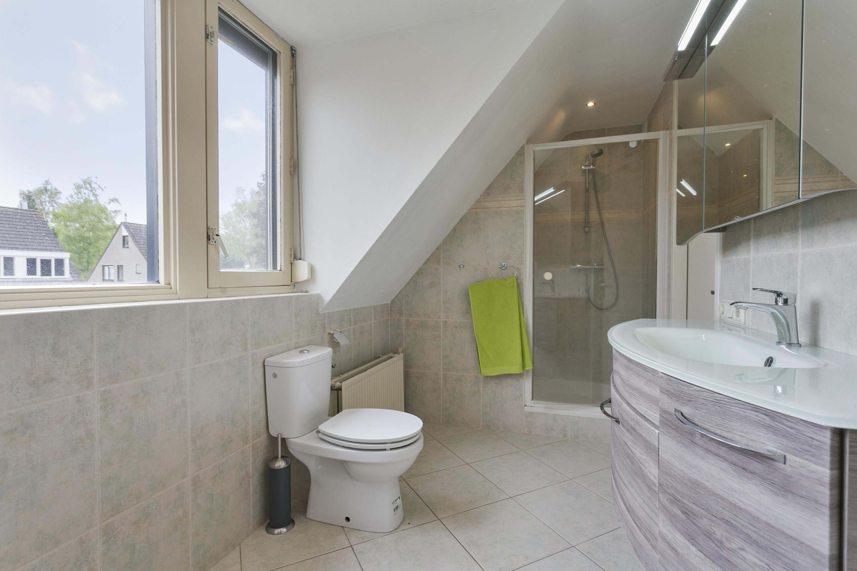 Badkamer: zeer ruime, geheel betegelde badkamer voorzien van een ligbad, douchecabine, 2e toilet, wastafel en dakkapel met rolluik. De badkamer is verder tevens voorzien van diverse inbouwspots.