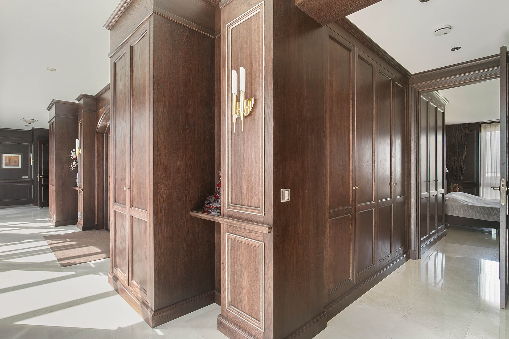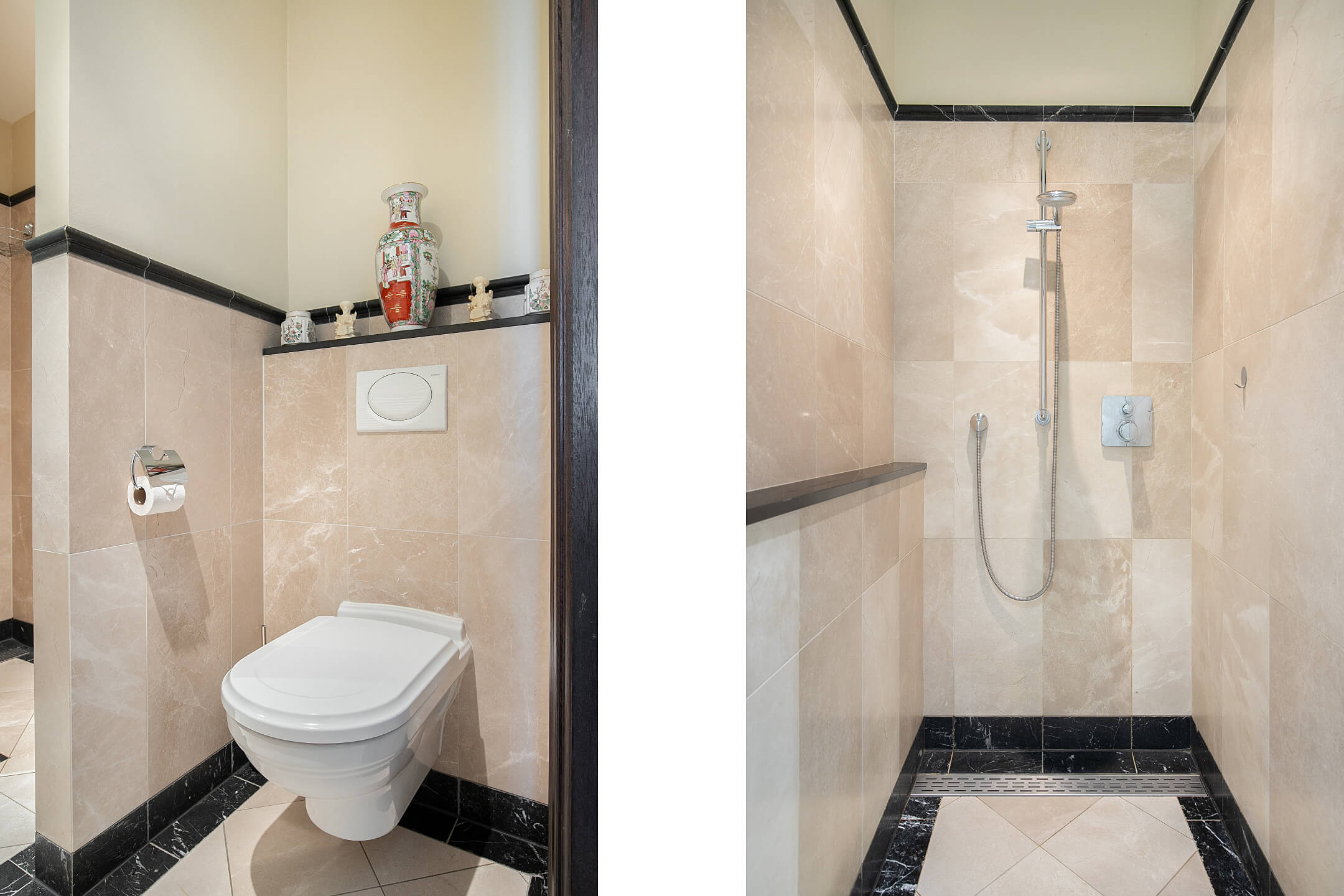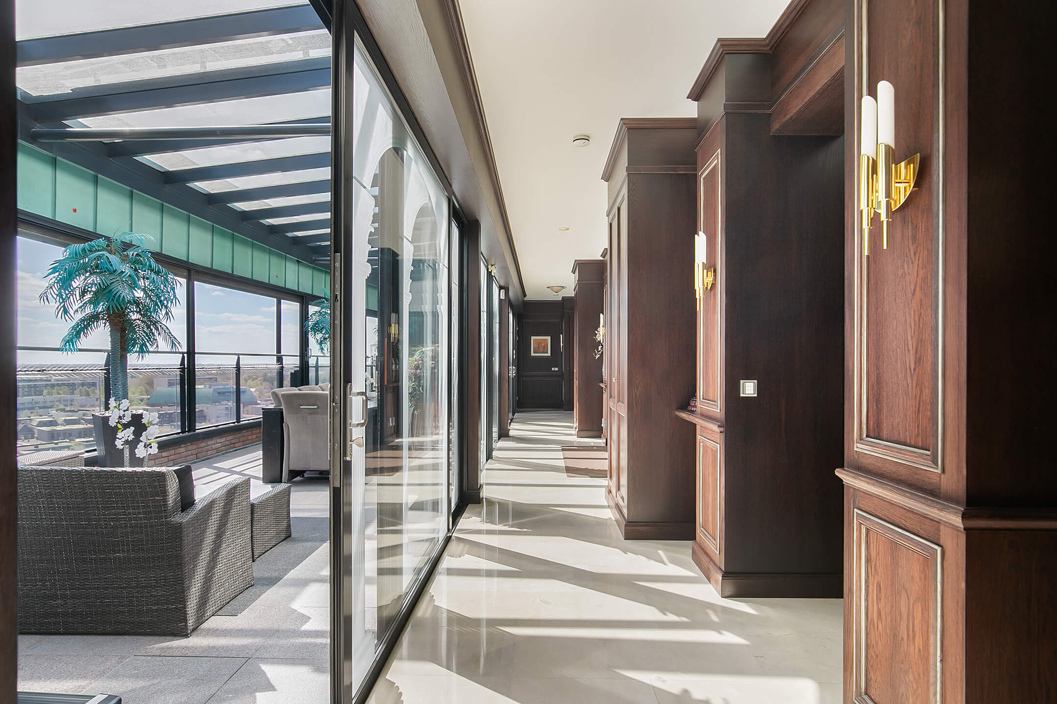 Het gehele penthouse is afgewerkt met een hoogwaardige marmeren vloer met vloerverwarming, hardhouten wandbekleding en een tal van op maat gemaakte luxueuze kasten.