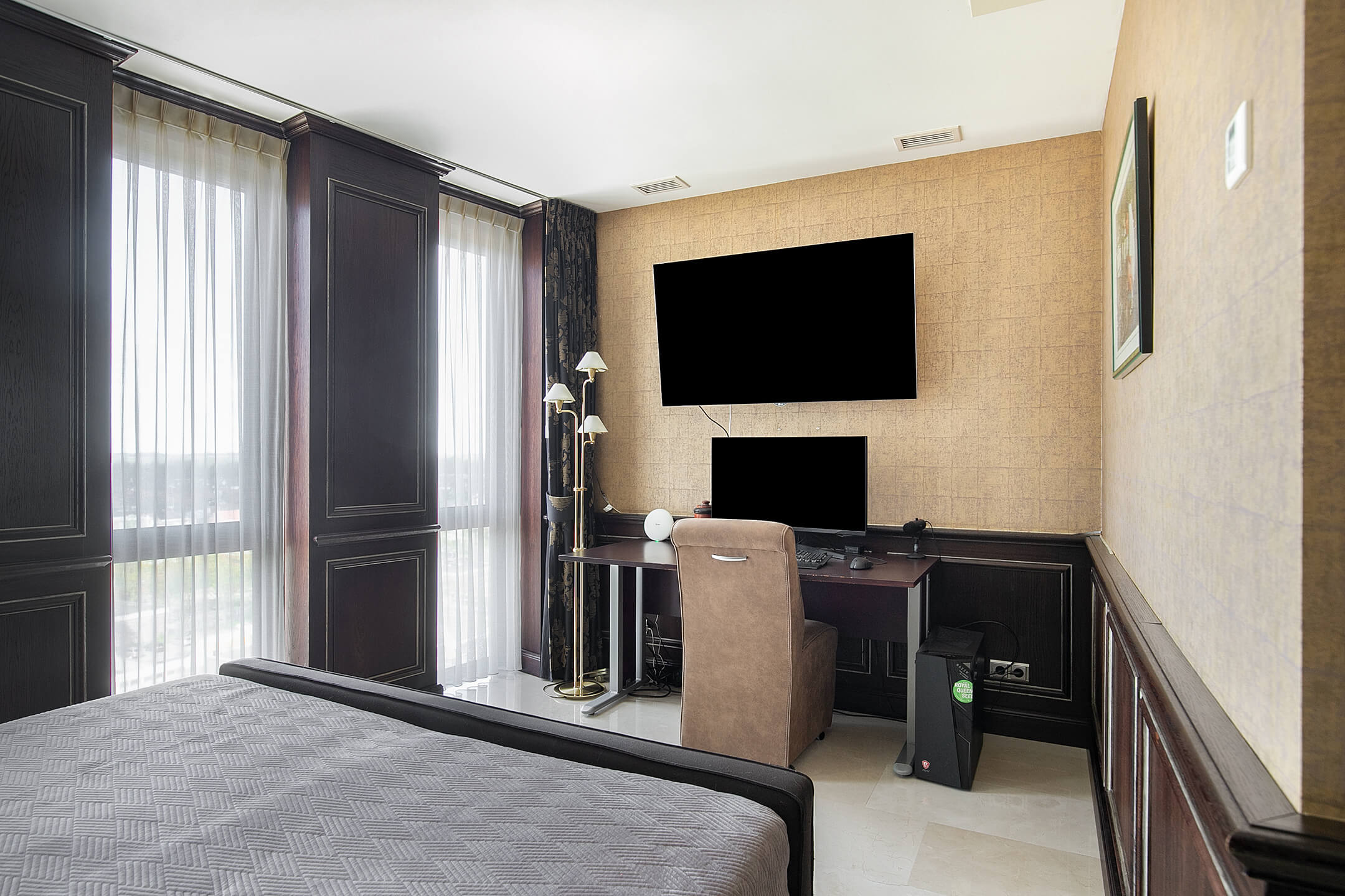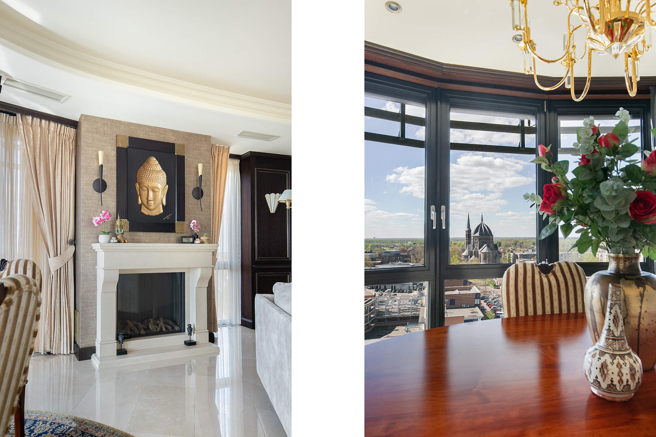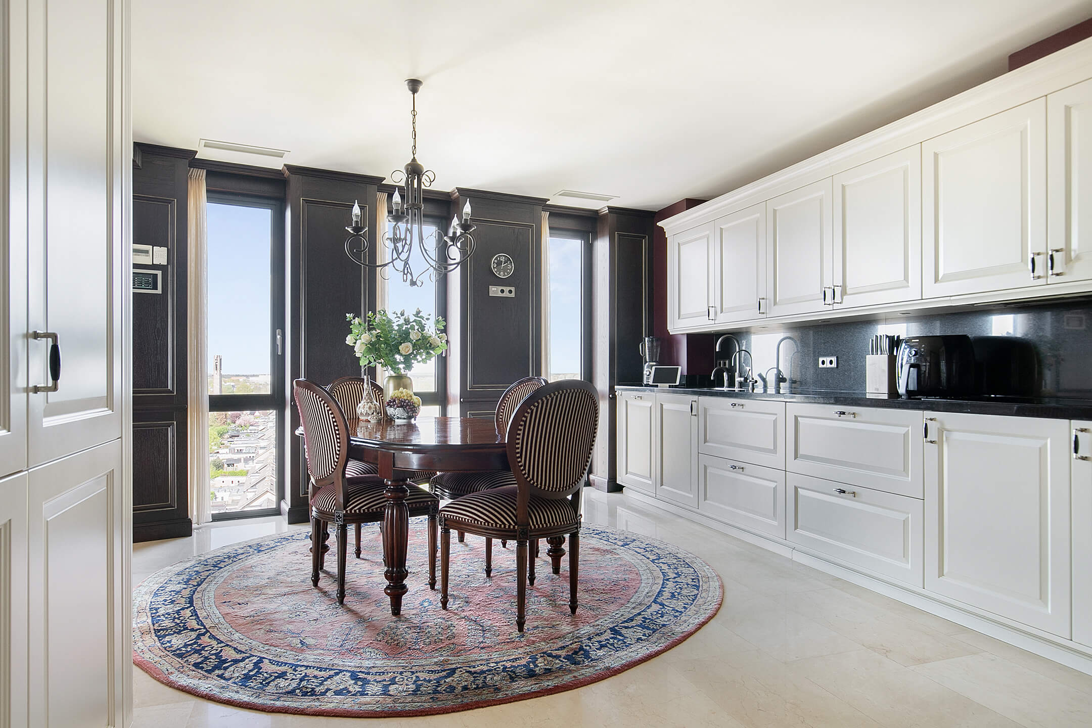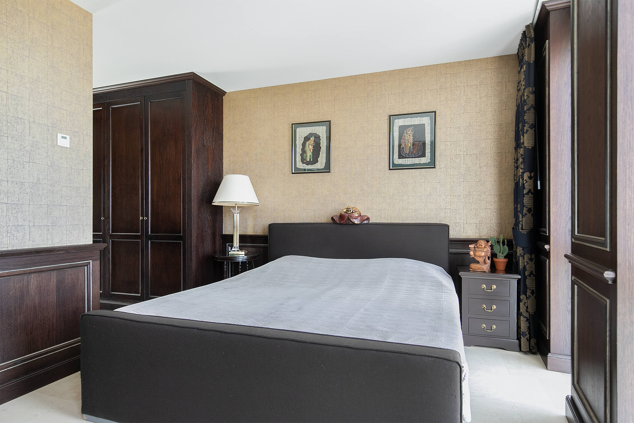 Het gehele penthouse is afgewerkt met een hoogwaardige marmeren vloer met vloerverwarming, hardhouten wandbekleding en een tal van op maat gemaakte luxueuze kasten.