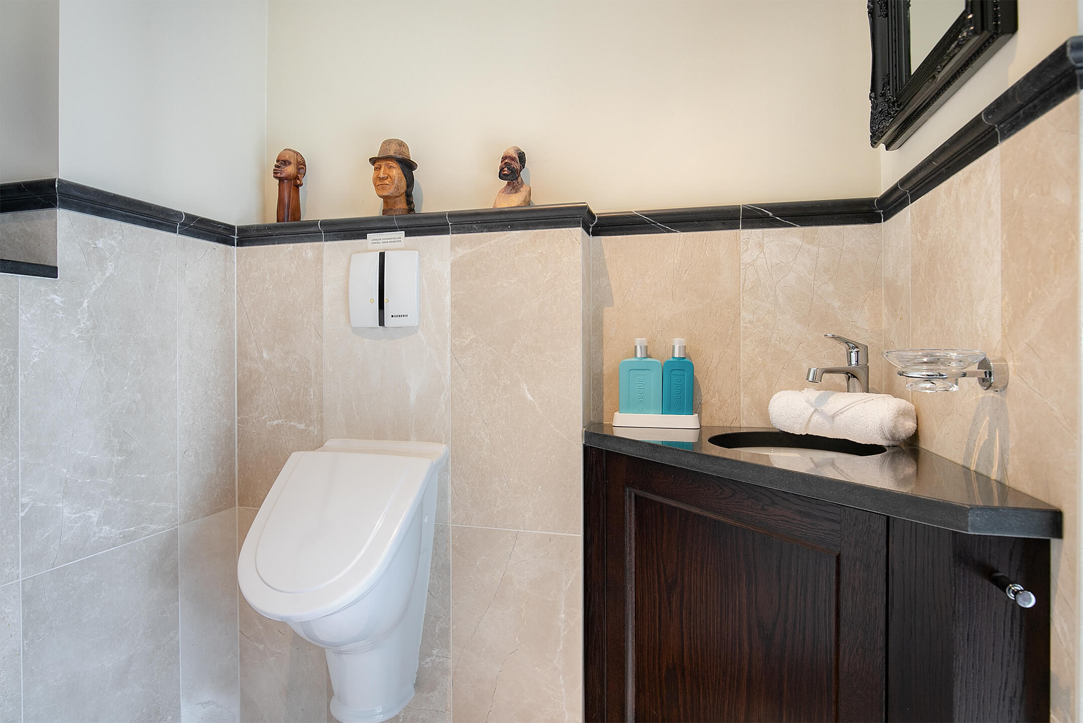 Het toilet beschikt over een hangtoilet, urinoir, fonteintje met meubel en mechanische afzuiging.