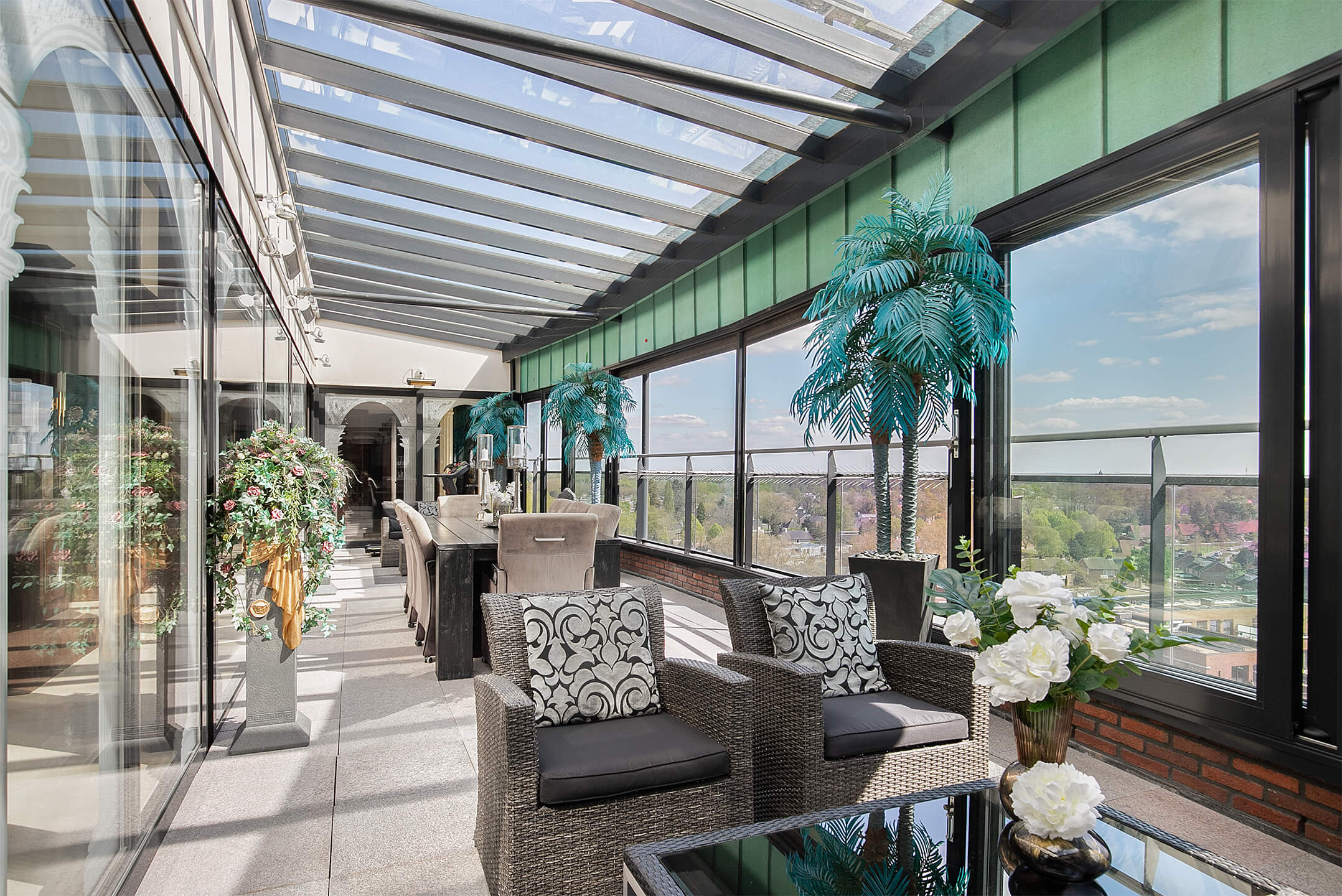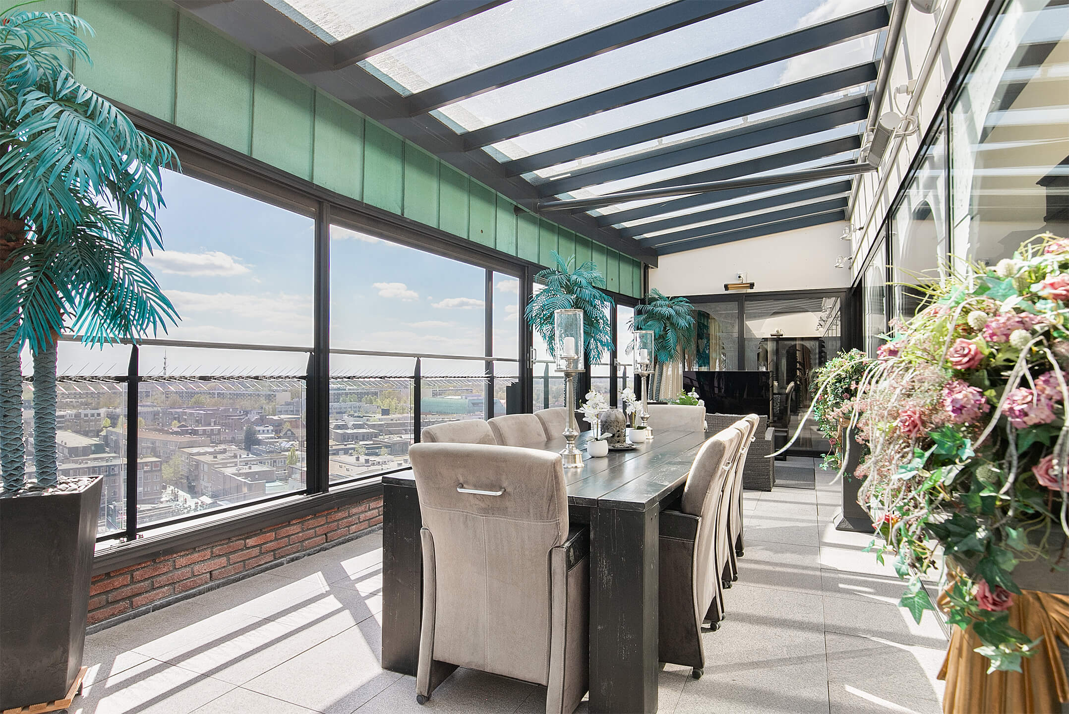 Het bijzonder ruime terras is middels twee grote schuifpuien te bereiken. Het terras is voorzien van glaspanelen die u kunt sluiten, waardoor deze ruimte het hele jaar door te gebruiken is. Of u nu in de zomer buiten wenst te zitten of in de winter; Beleef de seizoenen, prachtige zonsondergangen en de vergezichten. Het terras is gelegen op het westen, voorzien van terrastegels, terrasverwarming, glazen overkapping met screens en verlichting.