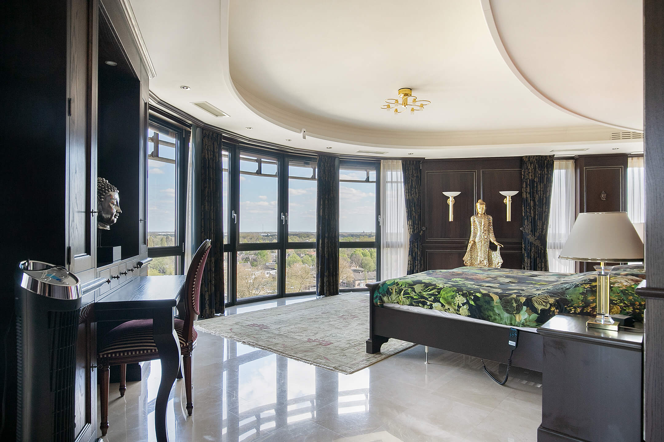 De masterbedroom, een echte suite, heeft een fenomenaal uitzicht met de rondingen geheel van glas. Dit betreft de noordzijde van het penthouse. Hier kijkt u uit op het bevrijdingspark. Deze slaapkamer is uniek in zijn formaat. Vanuit deze ruimte bereikt u de kledingruimte en de badkamer. De kledingruimte beschikt over luxueuze op maat gemaakte kasten met automatische verlichting.