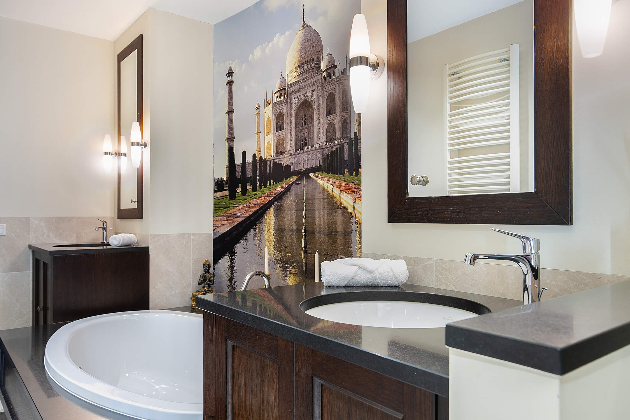 De luxe badkamer is middels twee zijdes te bereiken. Ook hier ziet u de op maat gemaakte inbouwkasten terugkomen. Voorziet in een ligbad, dubbele wastafel met meubel, inloopdouche met handdouche en toilet.