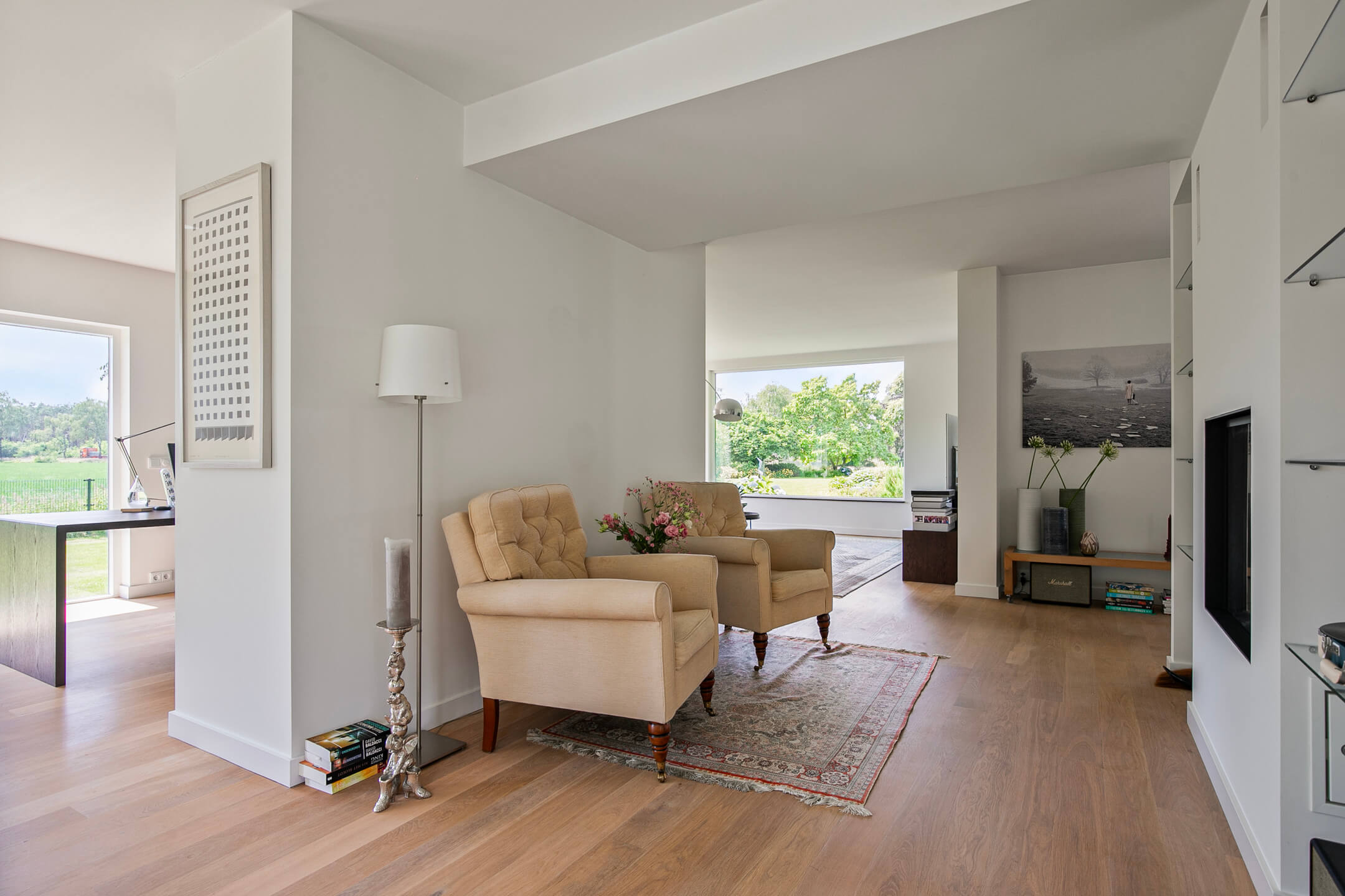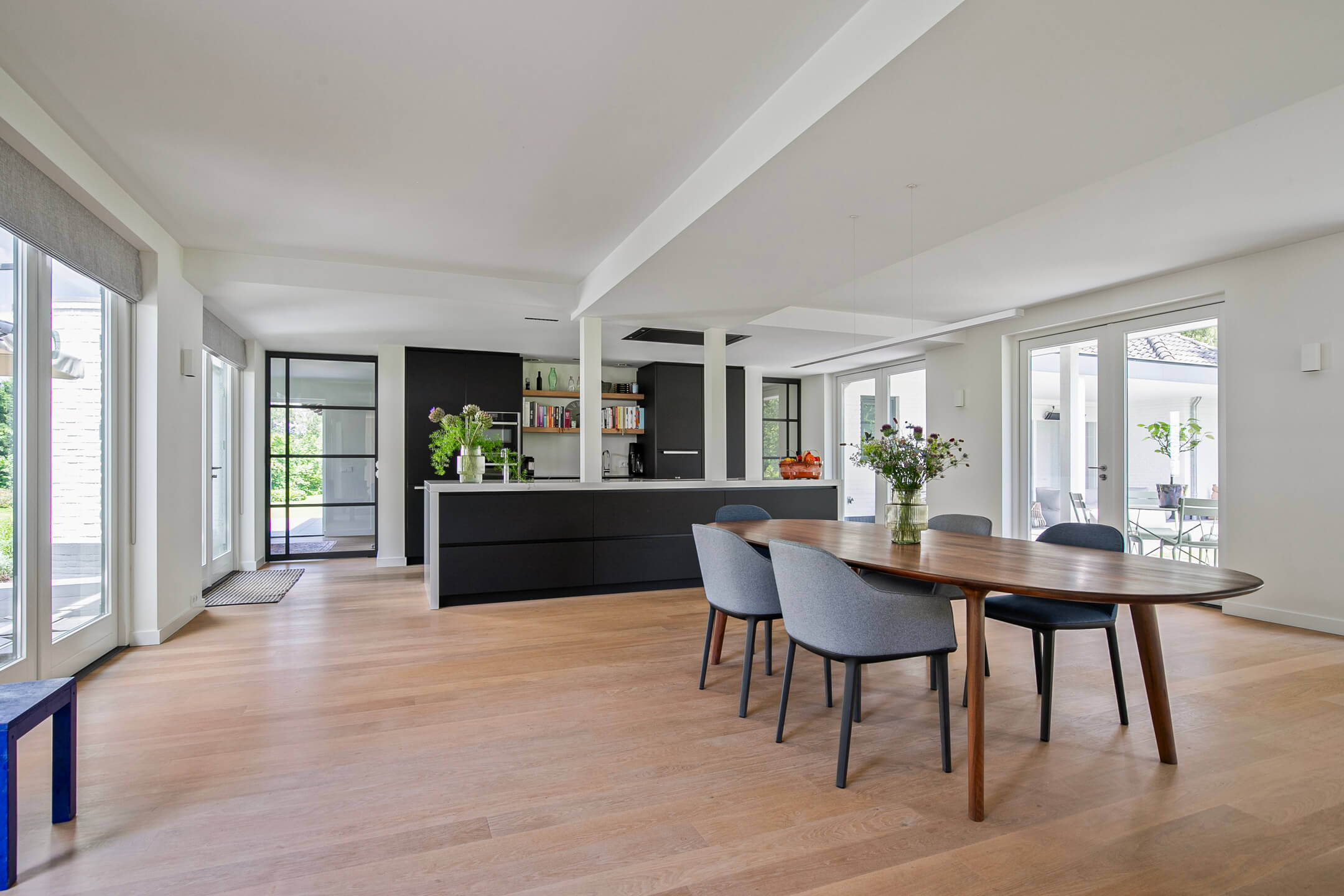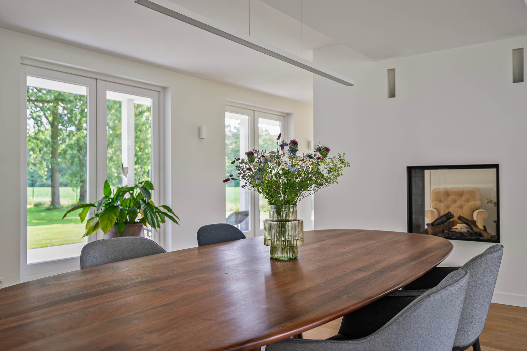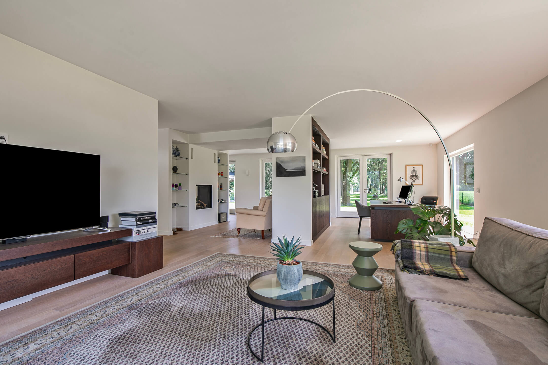 De open verbinding met de zitkamer en woonkamer – compleet met doorkijkhaard – maakt de leefruimte licht, warm en uitnodigend. De werkplek in de woon- en werkkamer biedt rust en inspiratie dankzij het uitzicht over het weelderige perceel.