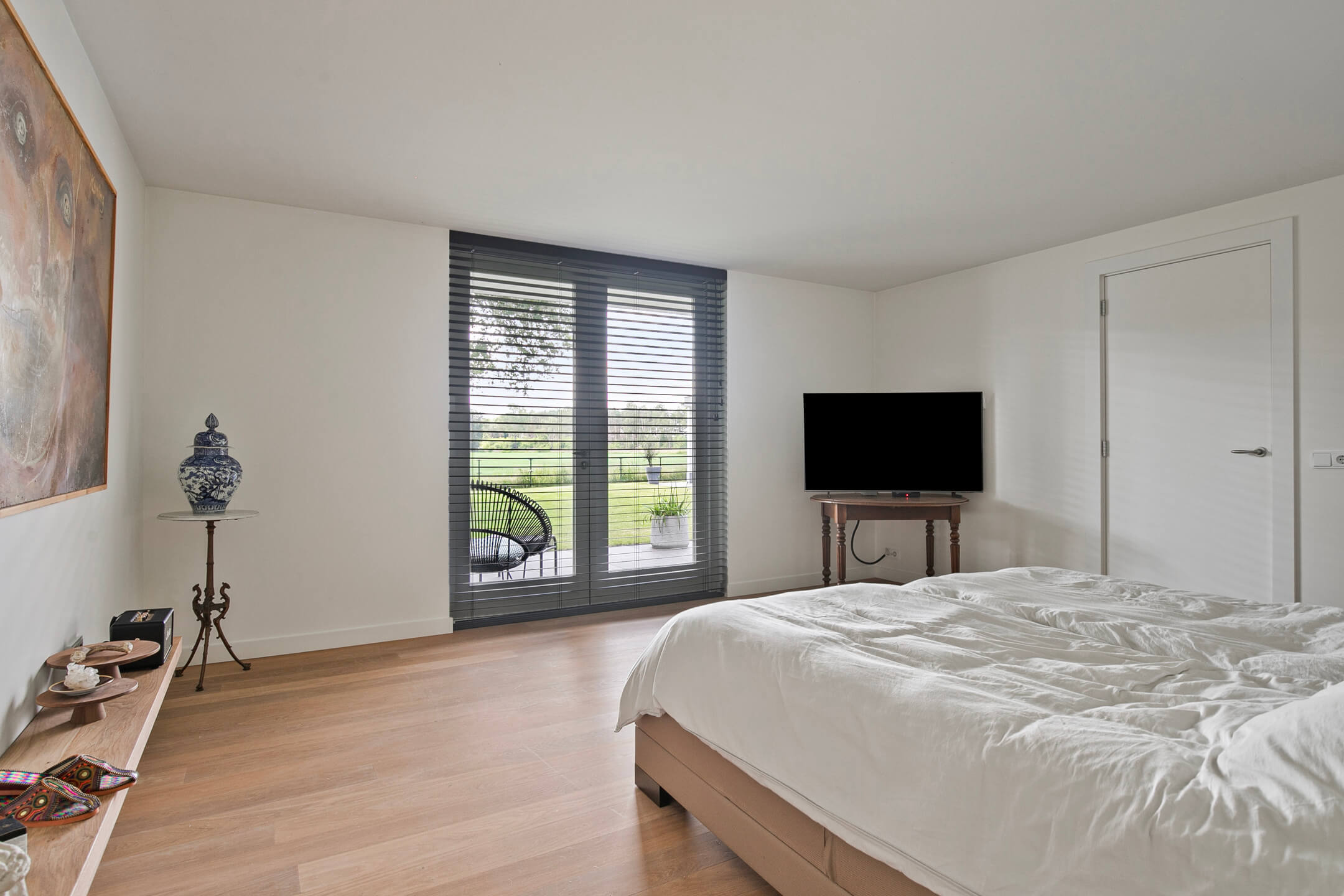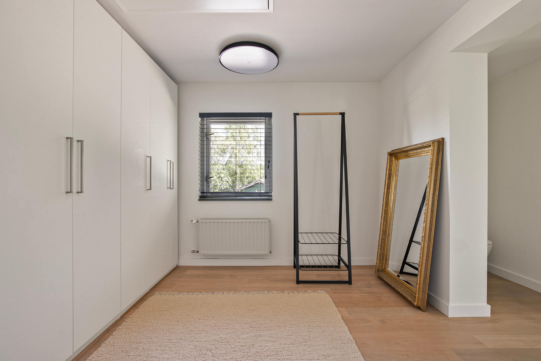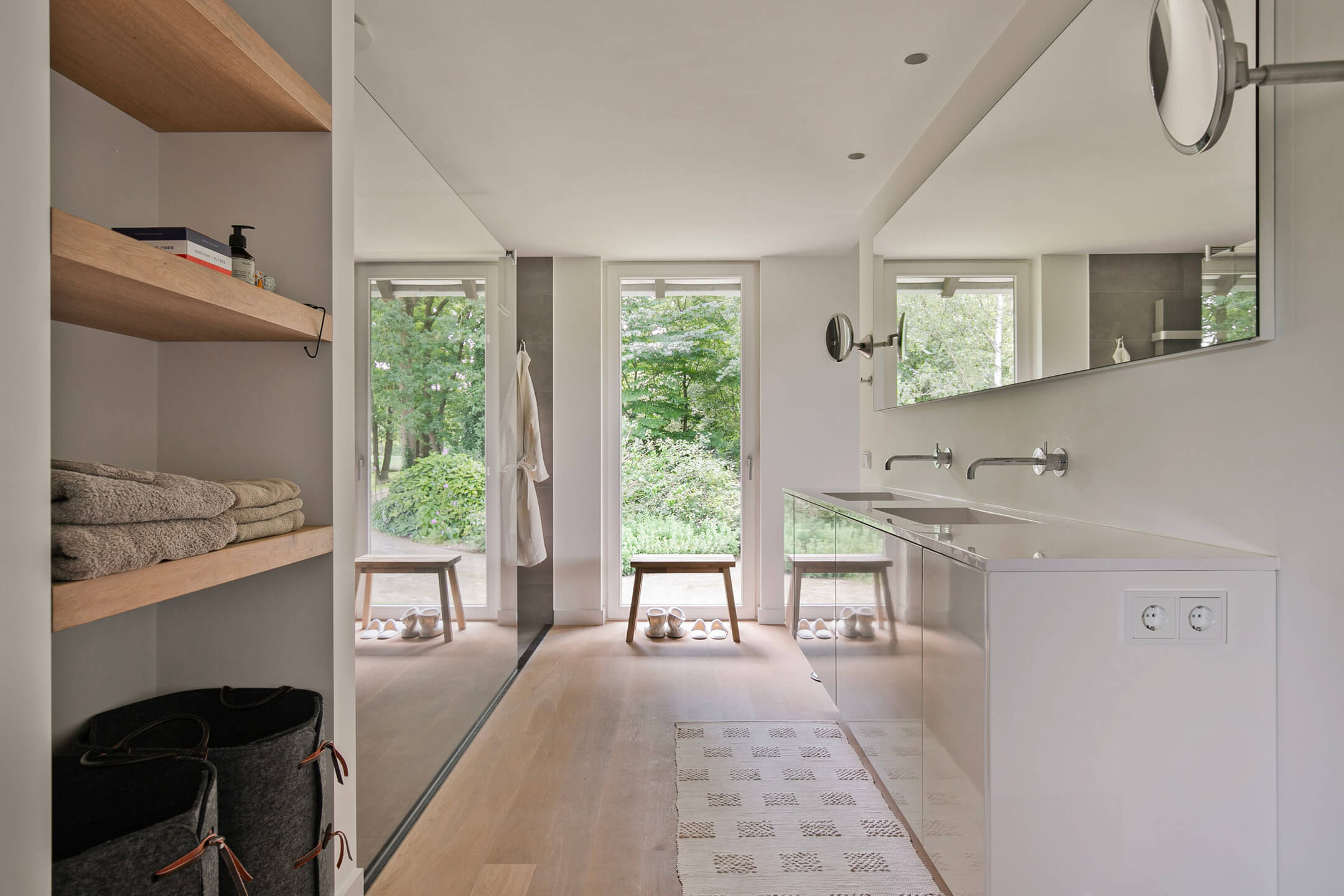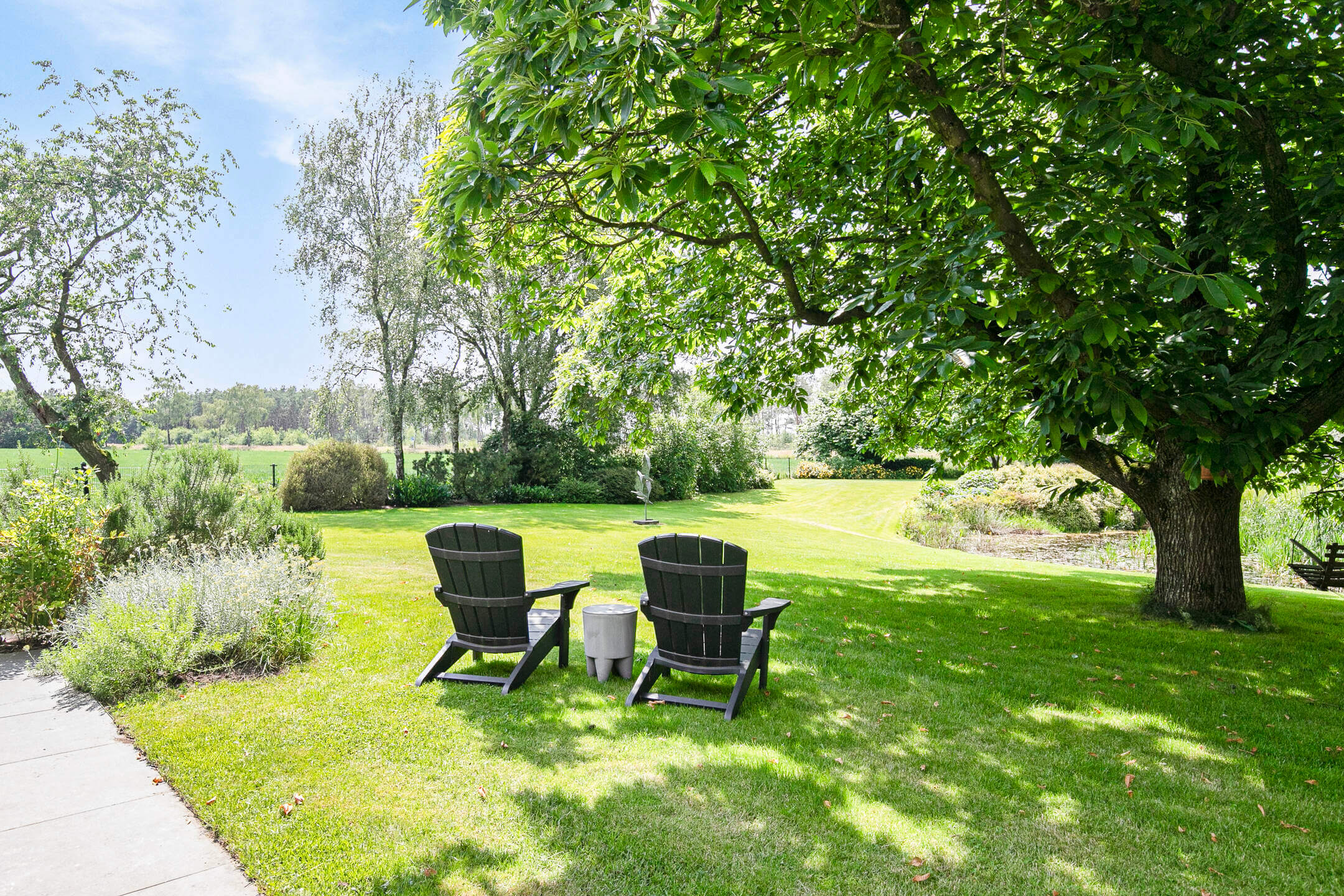 De open verbinding met de zitkamer en woonkamer – compleet met doorkijkhaard – maakt de leefruimte licht, warm en uitnodigend. De werkplek in de woon- en werkkamer biedt rust en inspiratie dankzij het uitzicht over het weelderige perceel.