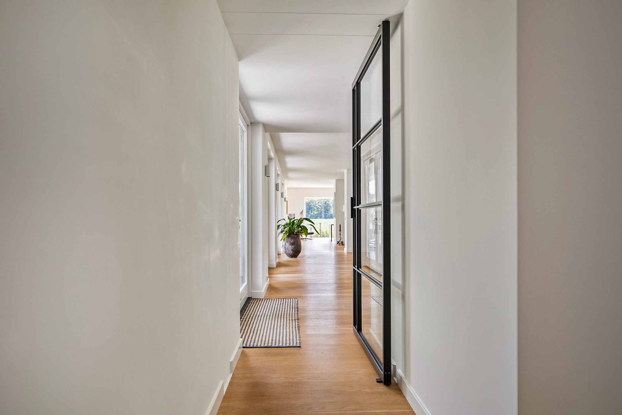 Via de overdekte entree betreedt u de ruime hal met garderobe en meterkast. Vanuit de centrale gang bereikt u diverse vertrekken: de stijlvolle leefkeuken, de sfeervolle woonkamer, drie slaapkamers, twee badkamers, een wasruimte, wijnkelder en een werkplek.