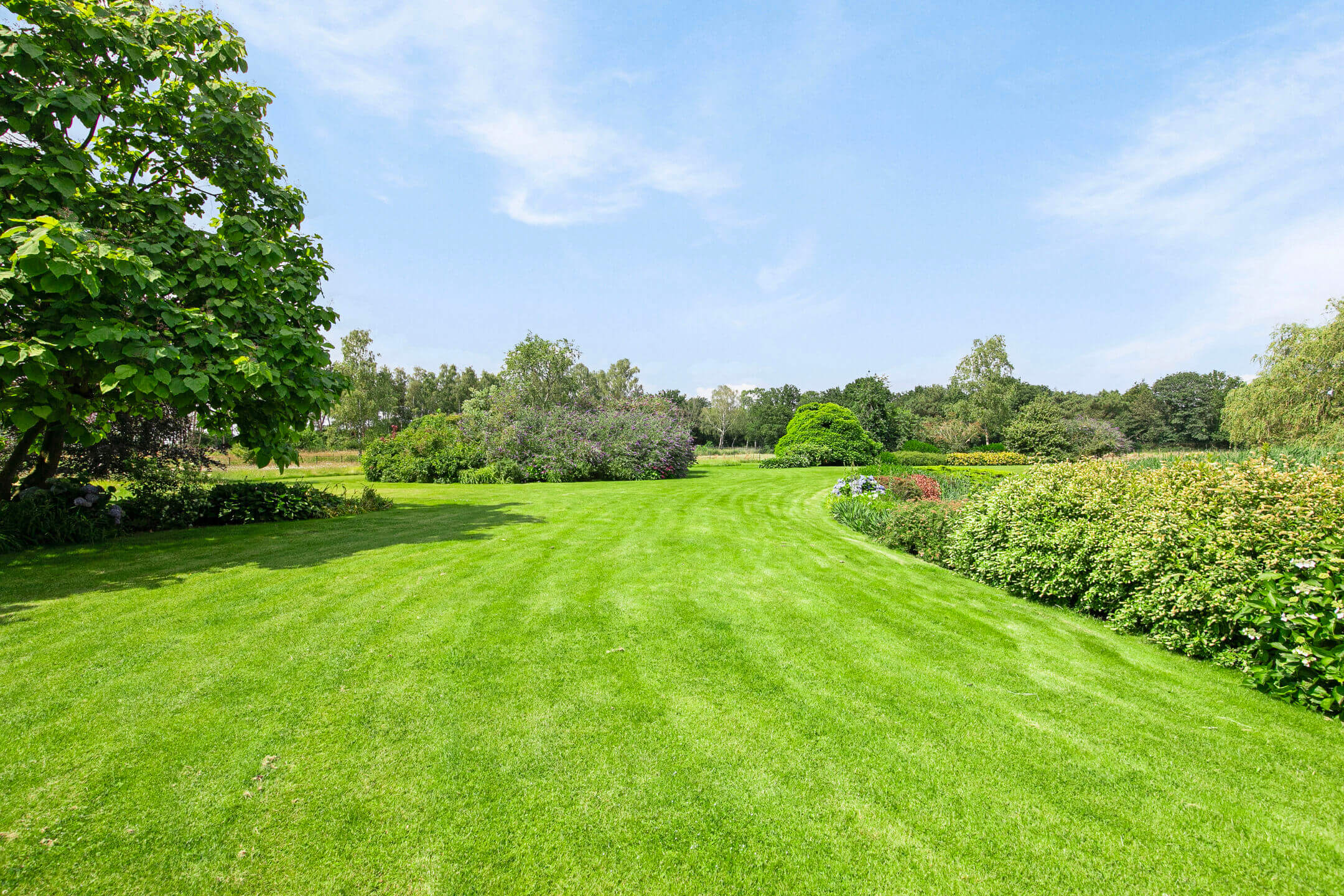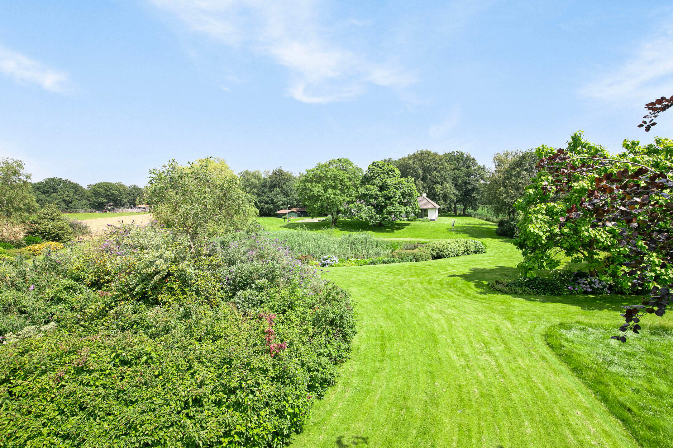 De prachtige tuin is met zorg en liefde aangelegd – een oase van rust met vijverpartijen, volwassen bomen, een glooiend gazon en een bosrijke weide. Hier kunt u ontspannen in de zon, een boek lezen op één van de terrassen of wandelen door uw eigen privébos.