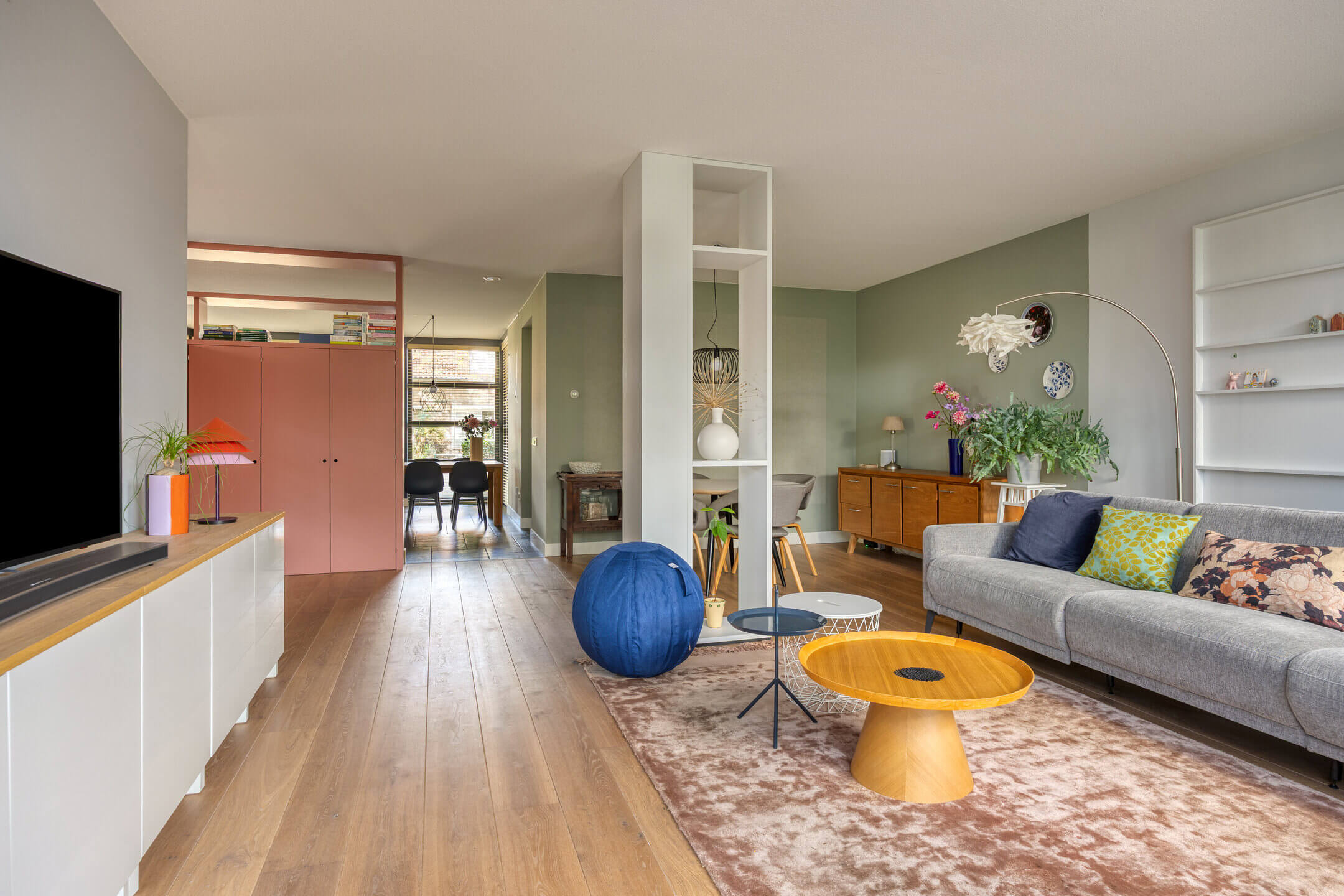 De woonkamer ademt warmte en sfeer uit. Een stijlvolle open kast vormt een speels element in de ruimte. Aan de achterzijde zorgen grote glaspartijen met tuindeuren voor een prachtige verbinding met de tuin en de overkapping, waar u het hele jaar door heerlijk beschut kunt zitten.