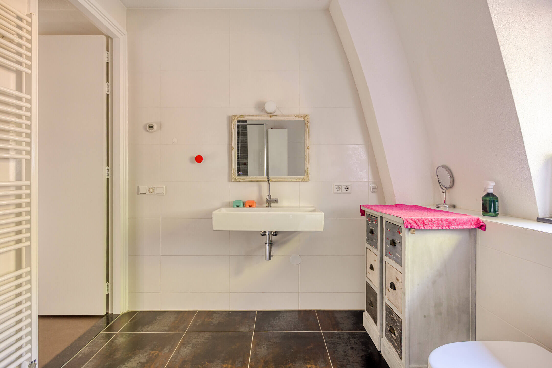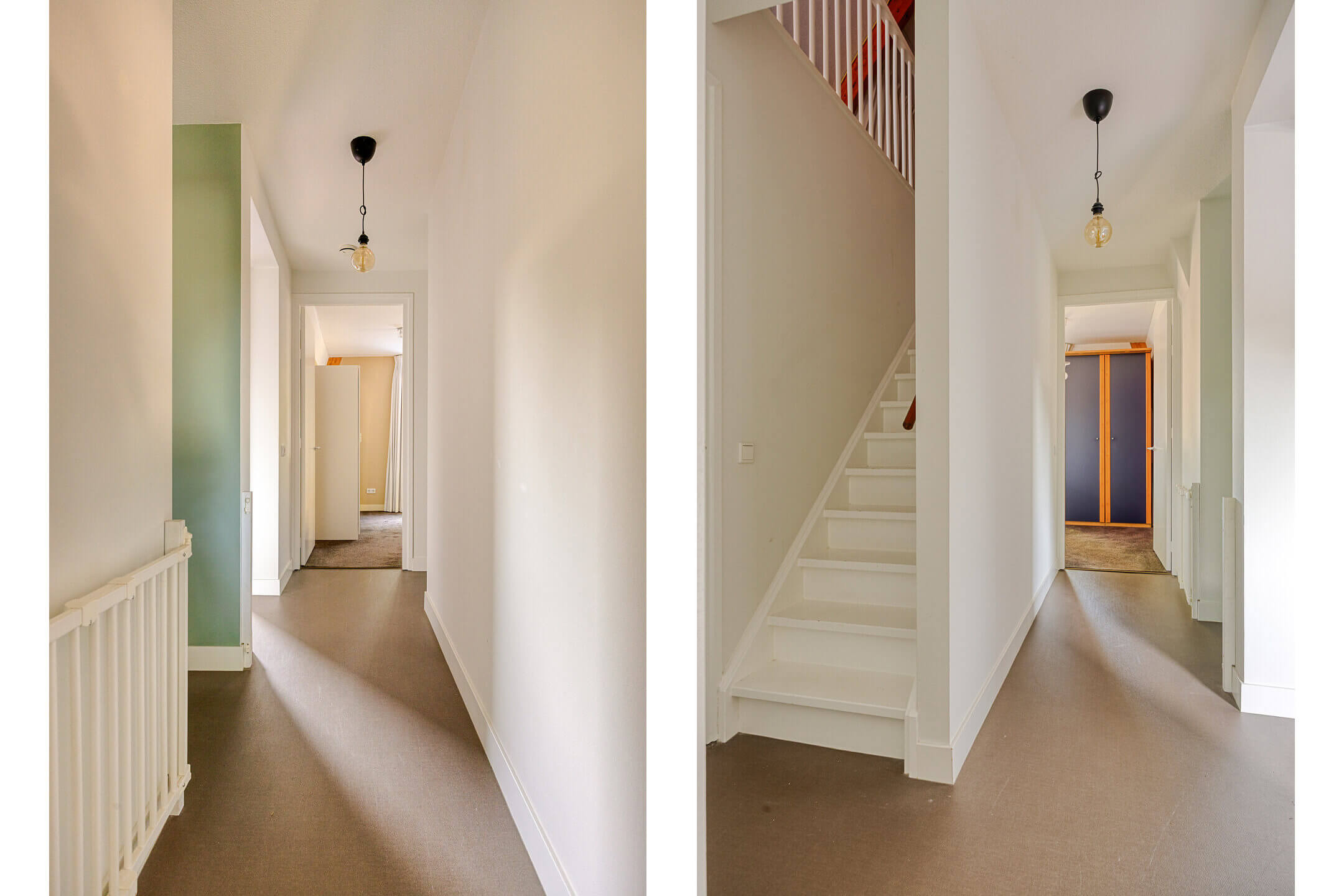 De tweede verdieping is bereikbaar via een vaste trap en ingedeeld met een royale overloop voorzien van witgoedaansluitingen en een wastafel. Daarnaast bevindt zich hier een vierde kamer met dakraam. Deze kamer is heerlijk licht en open tot in de nok, wat zorgt voor een ruimtelijk gevoel.