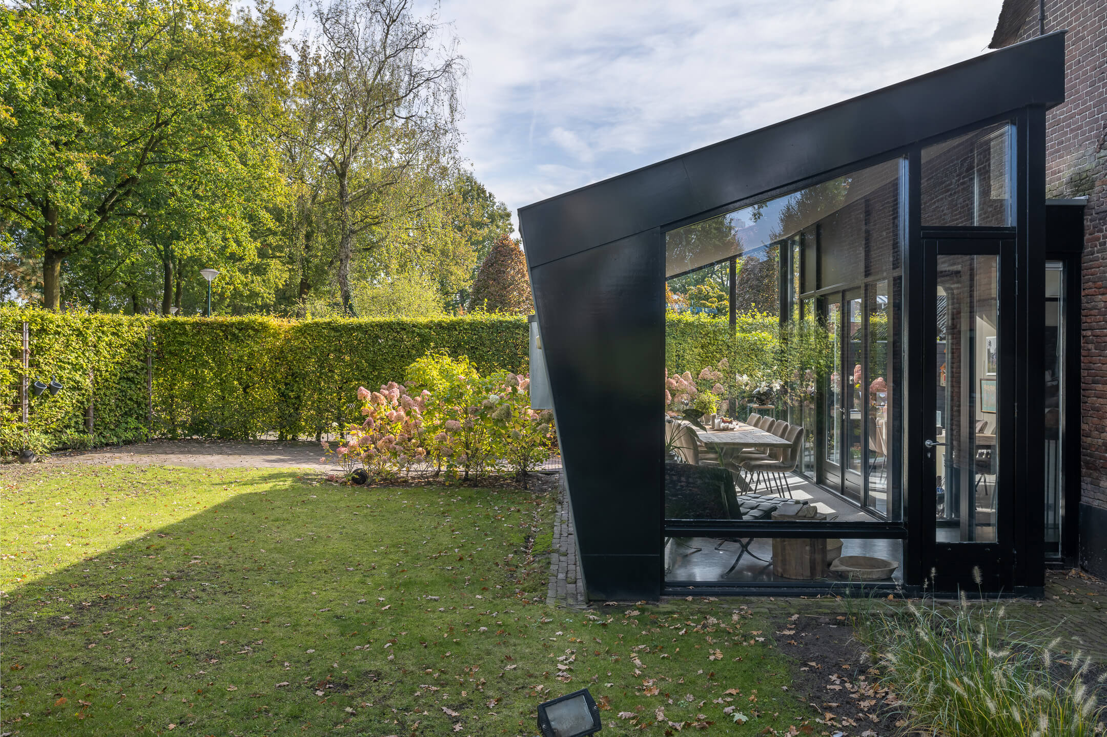 De sfeervolle aanbouw is ingericht als eetkamer en wordt gekenmerkt door het vele daglicht dat de ruimte binnenvalt. Heerlijk om gezellige avonden met vrienden of familie door te brengen. Aan de achterzijde van het woongedeelte is een riante overkapping gesitueerd. De overkapping is bereikbaar via de woonkamer, leefkeuken en de eetkamer.