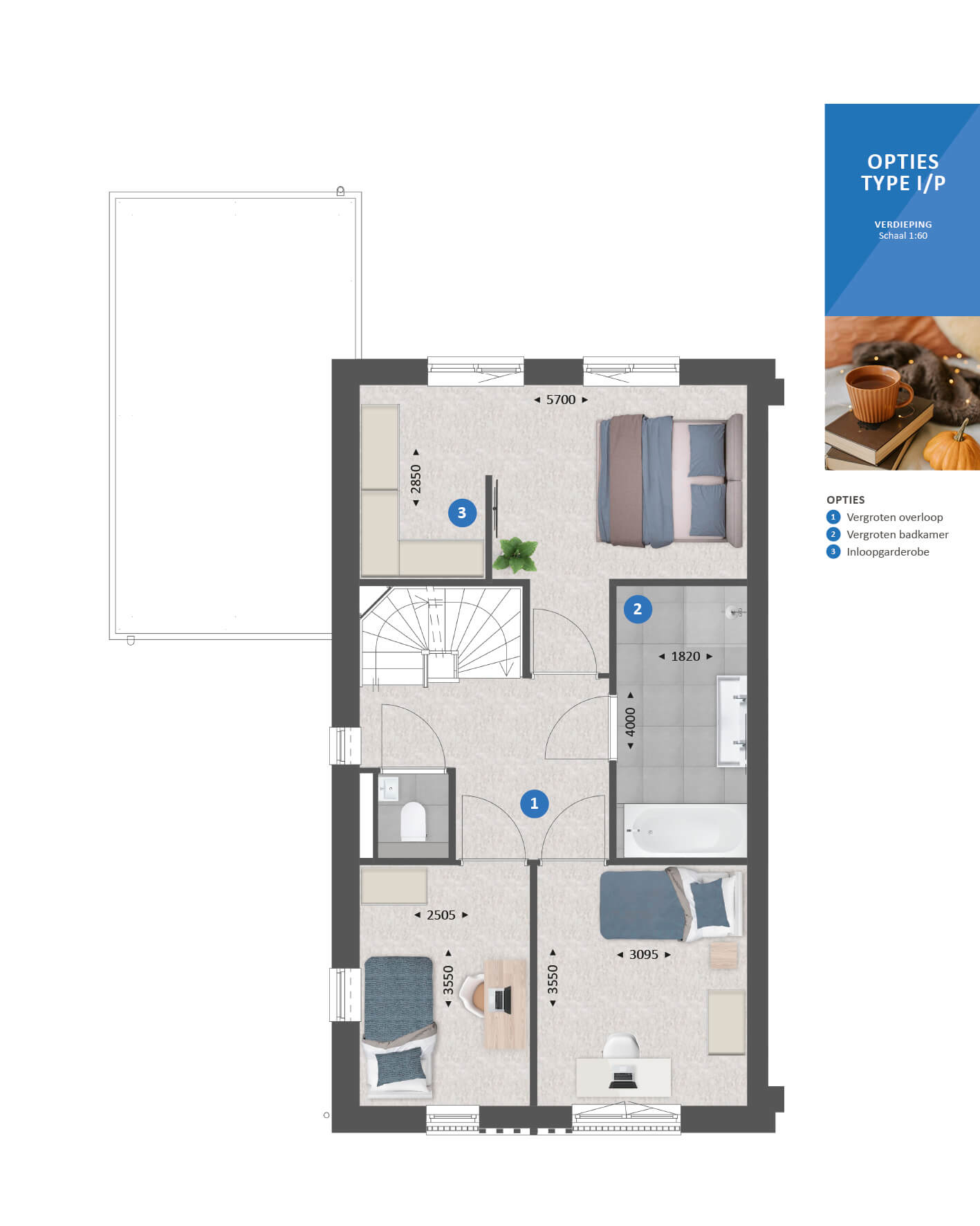 Ook de verdiepingen zijn naar wens in te delen. Op de eerste verdieping kun je de badkamer vergroten om ruimte te maken voor een ligbad, of twee slaapkamers samenvoegen tot één royale hoofdslaapkamer. Op de tweede verdieping richt je met diverse indelingsopties een volwaardige woonlaag in, met bijvoorbeeld twee extra slaapkamers, een tweede badkamer en een praktische was-/bergruimte.