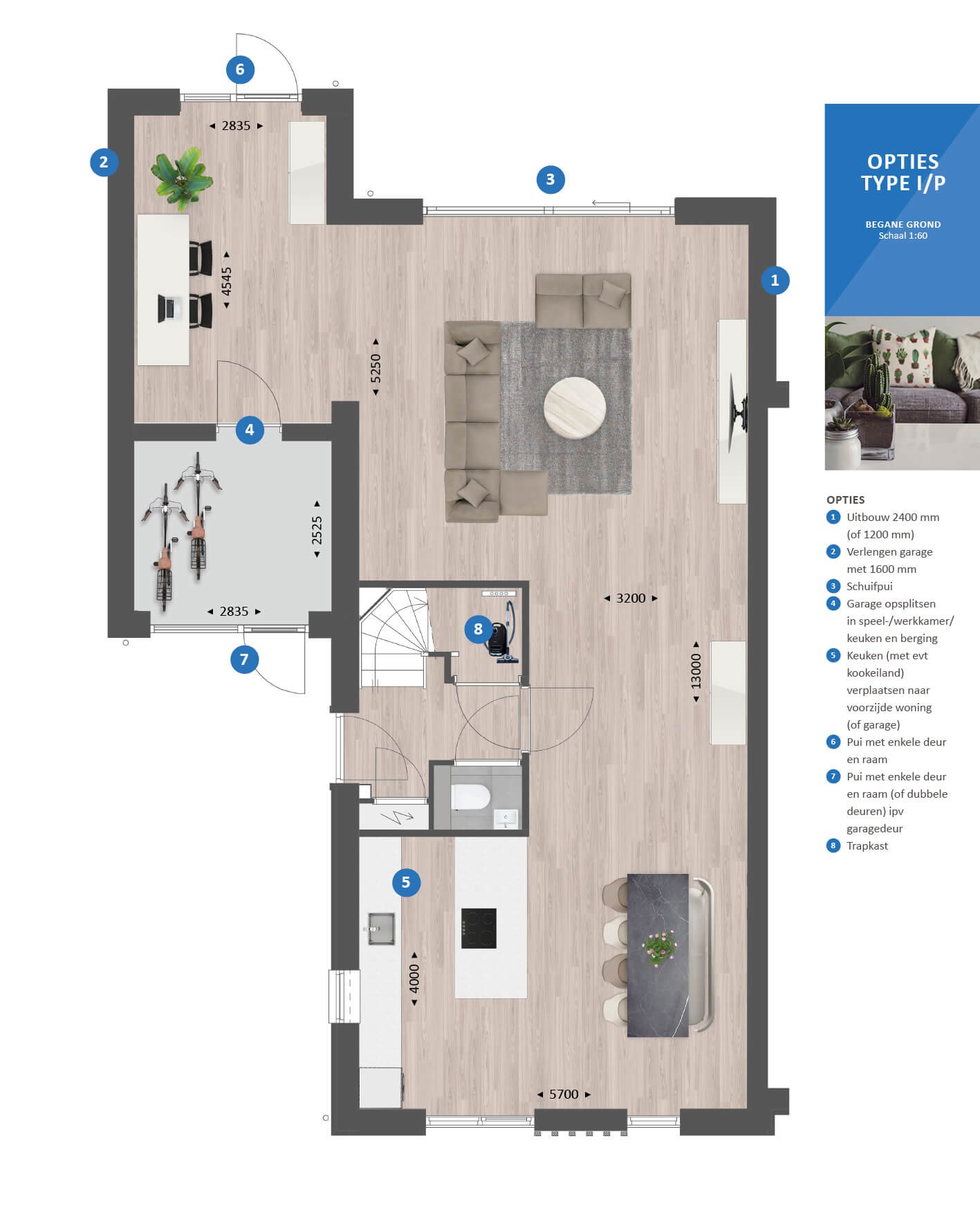 Er zijn volop mogelijkheden om deze woning naar jouw wensen aan te passen. Op de begane grond kun je kiezen voor een uitbouw van 1,20 of 2,40 meter, waarmee je direct meer leefruimte creëert. Wil je liever de keuken aan de voorzijde? Ook dat is mogelijk. Daarnaast kun je de garage verlengen en/of opsplitsen in een berging en een extra ruimte die je bij de woning betrekt – ideaal voor bijvoorbeeld een werkkamer, speelruimte of hobbyruimte.