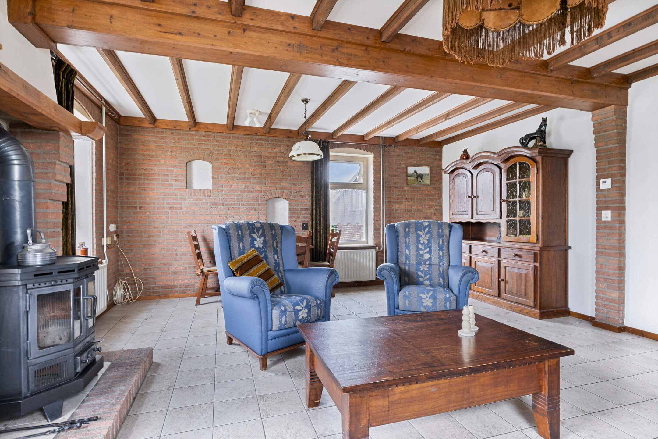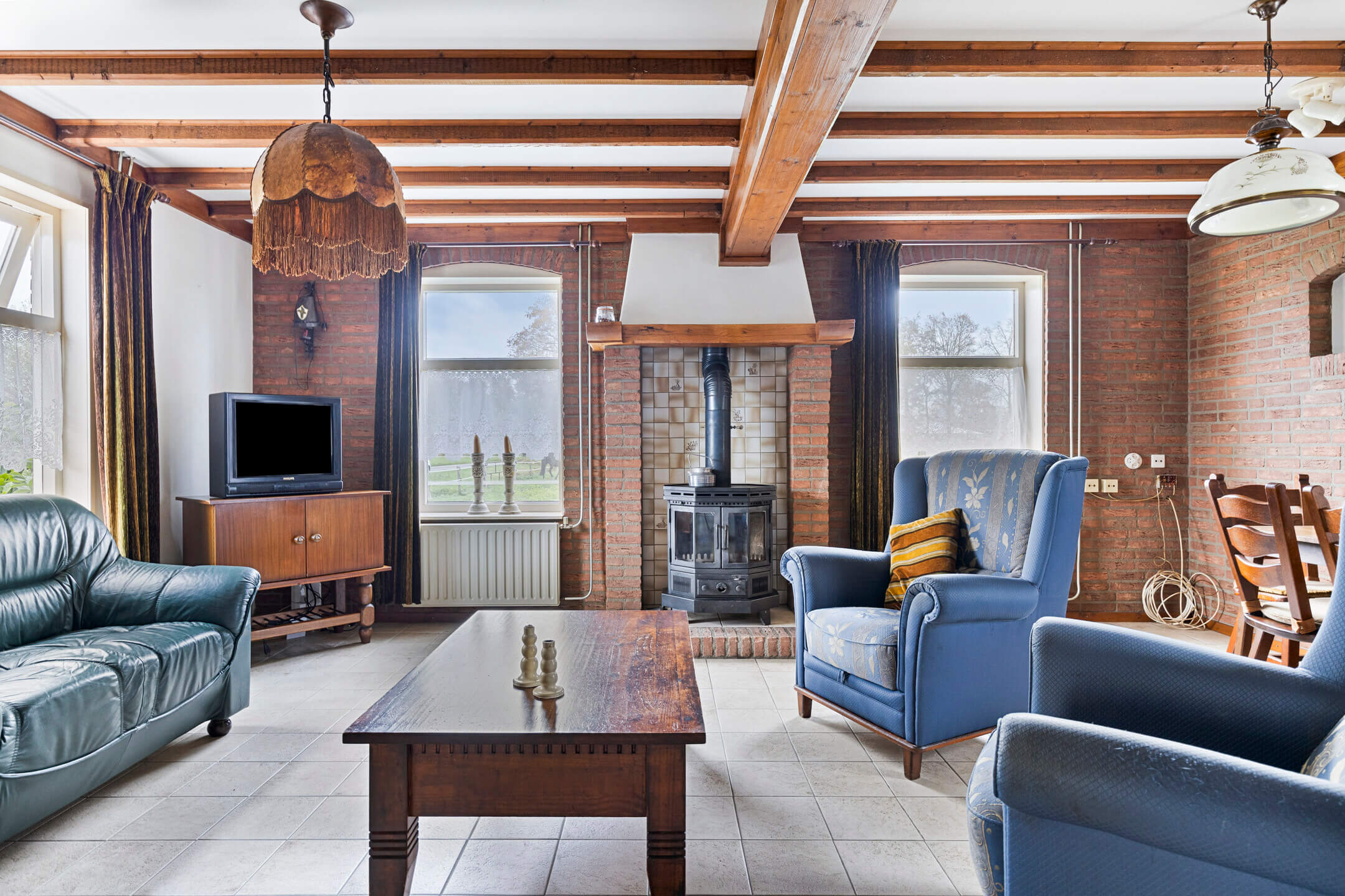 De entree aan de voorzijde geeft toegang tot de hal met meterkast en de ruime woonkamer. Deze leefruimte heeft een warme sfeer dankzij de tegelvloer, het deels schoonmetselwerk, de gestucte wanden en het balkenplafond. De houtkachel vormt een sfeervol middelpunt.