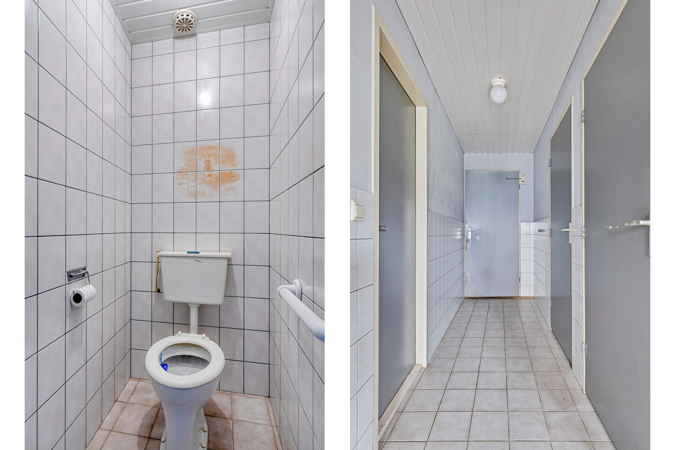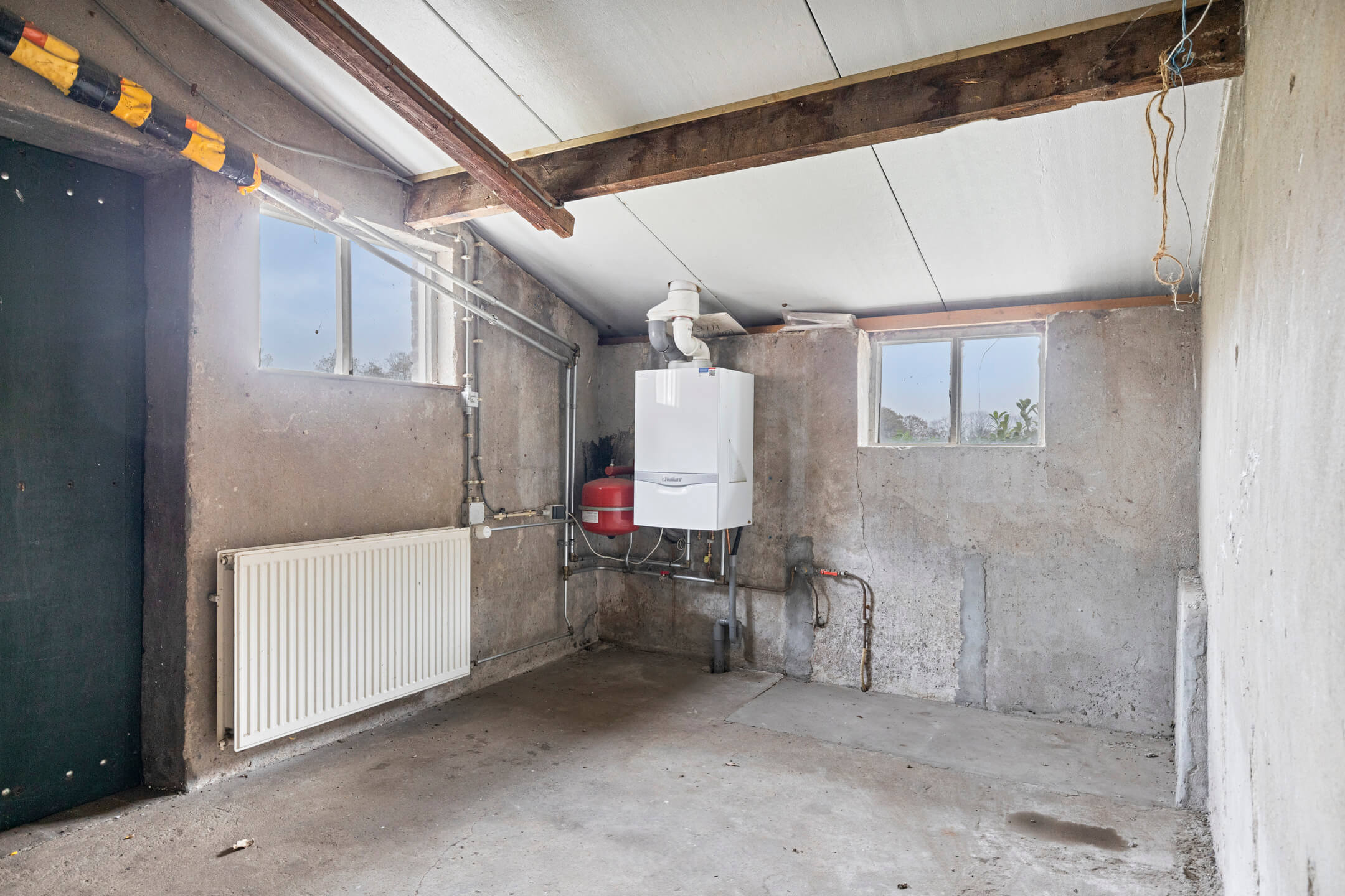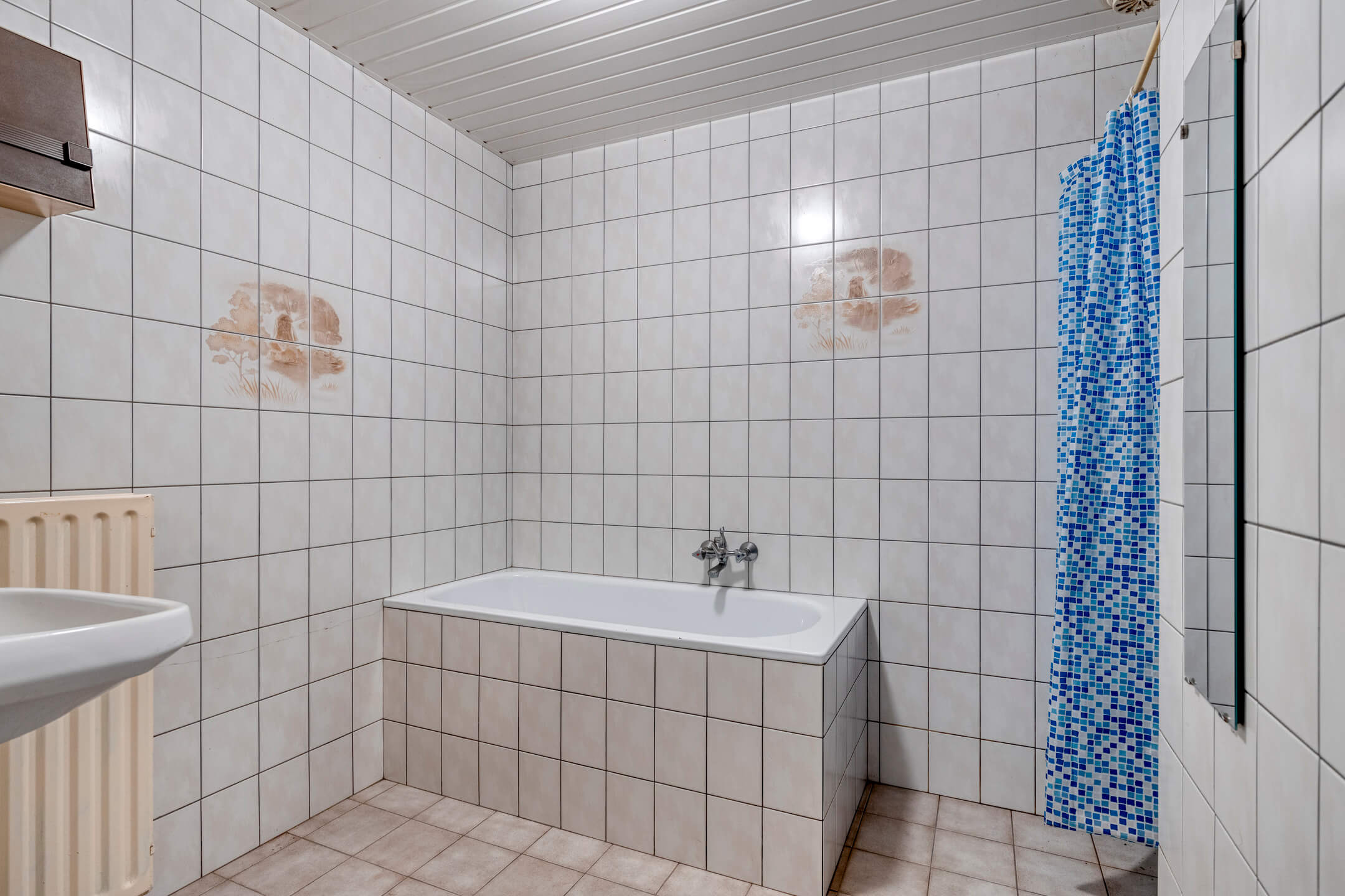 De bijkeuken beschikt over een tegelvloer, vaste kast, klein keukenblok en witgoedaansluitingen. Aangrenzend bevinden zich het toilet, de badkamer (met ligbad, inloopdouche en wastafel) en enkele praktische bergruimtes die vroeger in gebruik waren als stal.
