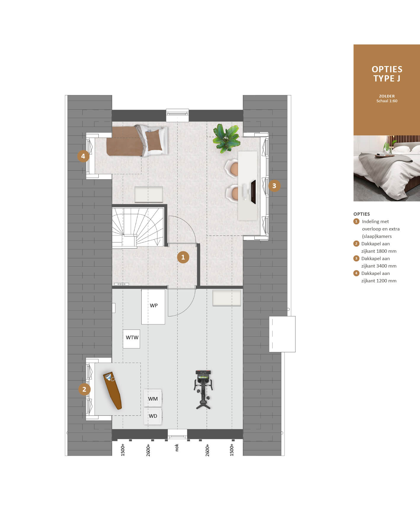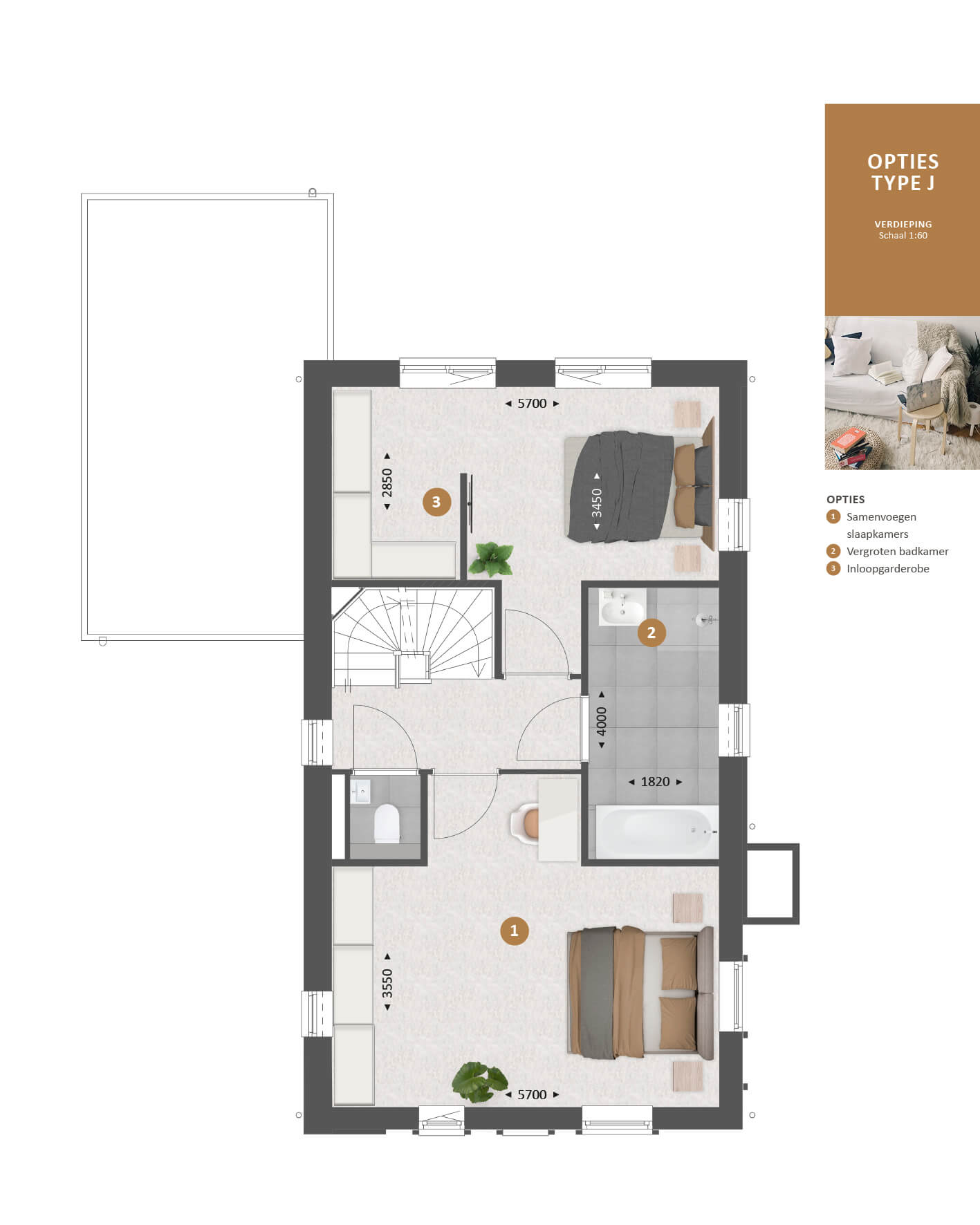 Ook de verdiepingen zijn naar wens in te delen. Op de eerste verdieping kun je de badkamer vergroten om ruimte te maken voor een ligbad, of twee slaapkamers samenvoegen tot één royale hoofdslaapkamer. Op de tweede verdieping richt je met diverse indelingsopties een volwaardige woonlaag in, met bijvoorbeeld twee extra slaapkamers, een tweede badkamer en een praktische was-/bergruimte.