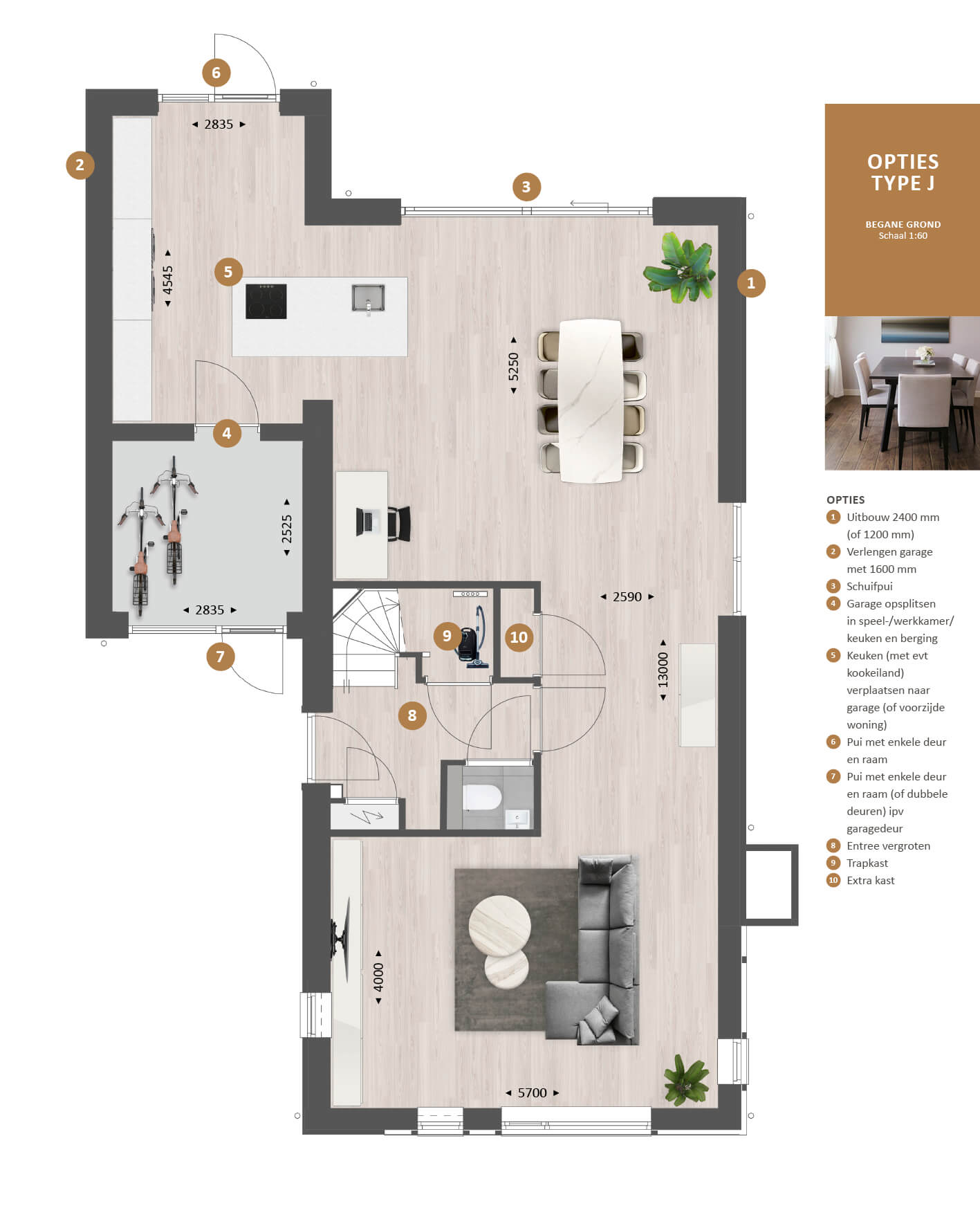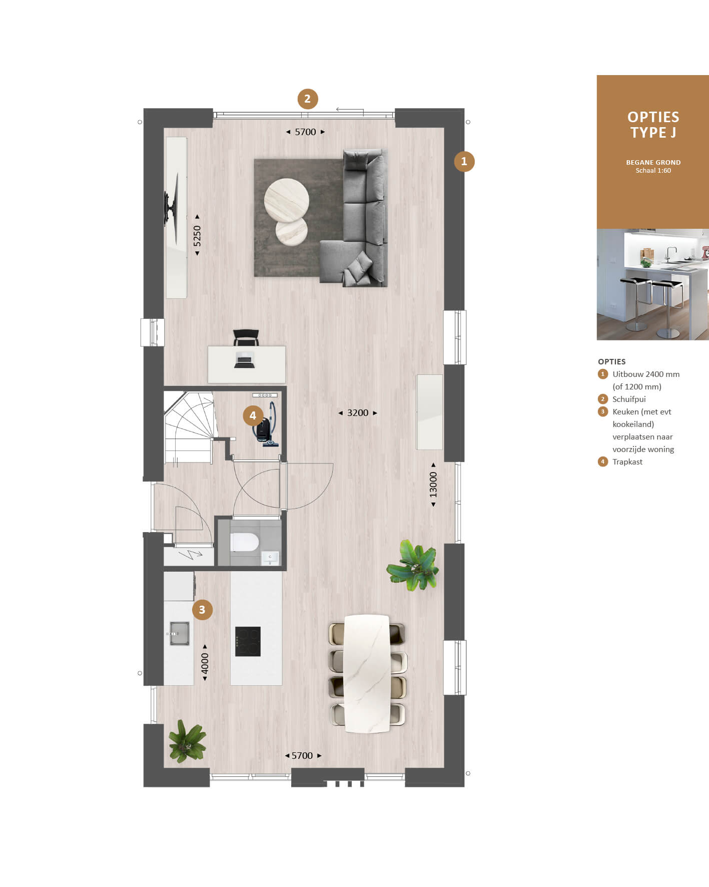Er zijn volop mogelijkheden om deze woning naar jouw wensen aan te passen. Op de begane grond kun je kiezen voor een uitbouw van 1,20 of 2,40 meter, waarmee je direct meer leefruimte creëert. Wil je liever de keuken aan de voorzijde? Ook dat is mogelijk. Daarnaast kun je de garage verlengen en/of opsplitsen in een berging en een extra ruimte die je bij de woning betrekt – ideaal voor bijvoorbeeld een werkkamer, speelruimte of hobbyruimte.