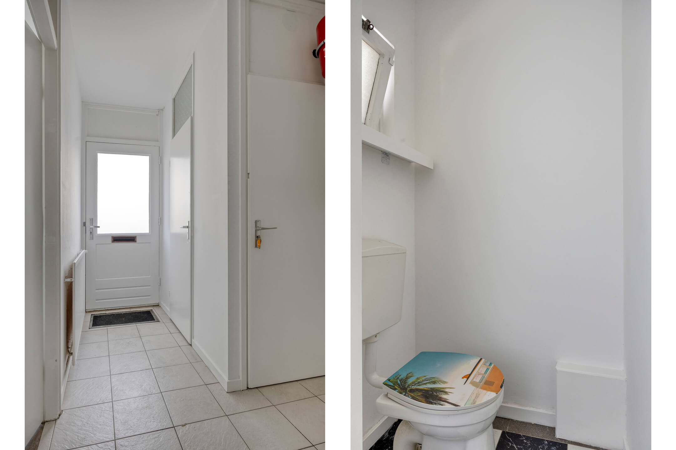 Entree/hal met toilet, trapopgang en toegang tot de woonkamer en keuken. De lichte (en uitgebouwde) woonkamer beschikt over een ruime trapkast met aansluitingen voor witgoedapparatuur. De keuken biedt voldoende werk- en opbergruimte en kijkt uit over het speelveldje aan de voorzijde van de woning.