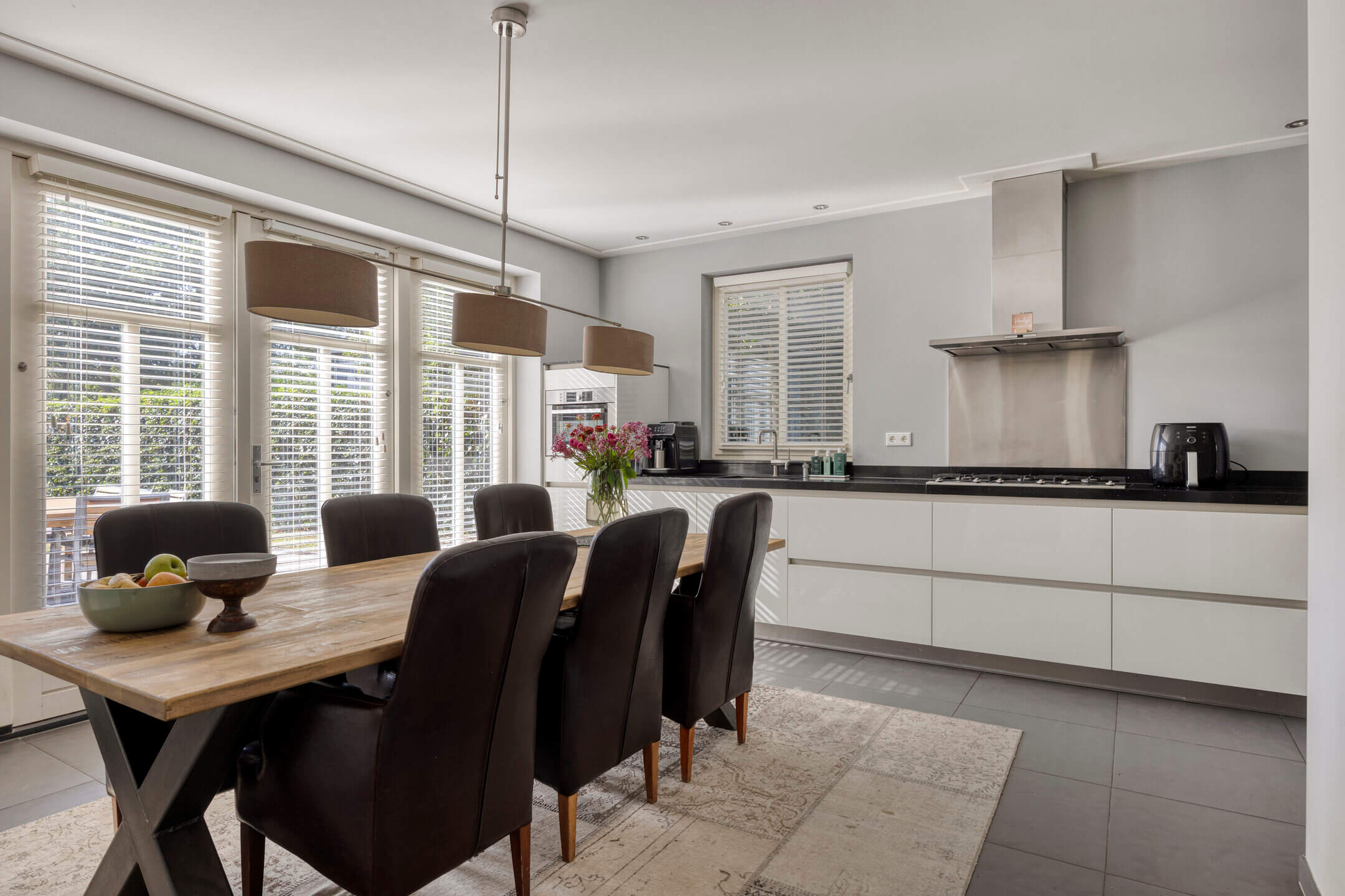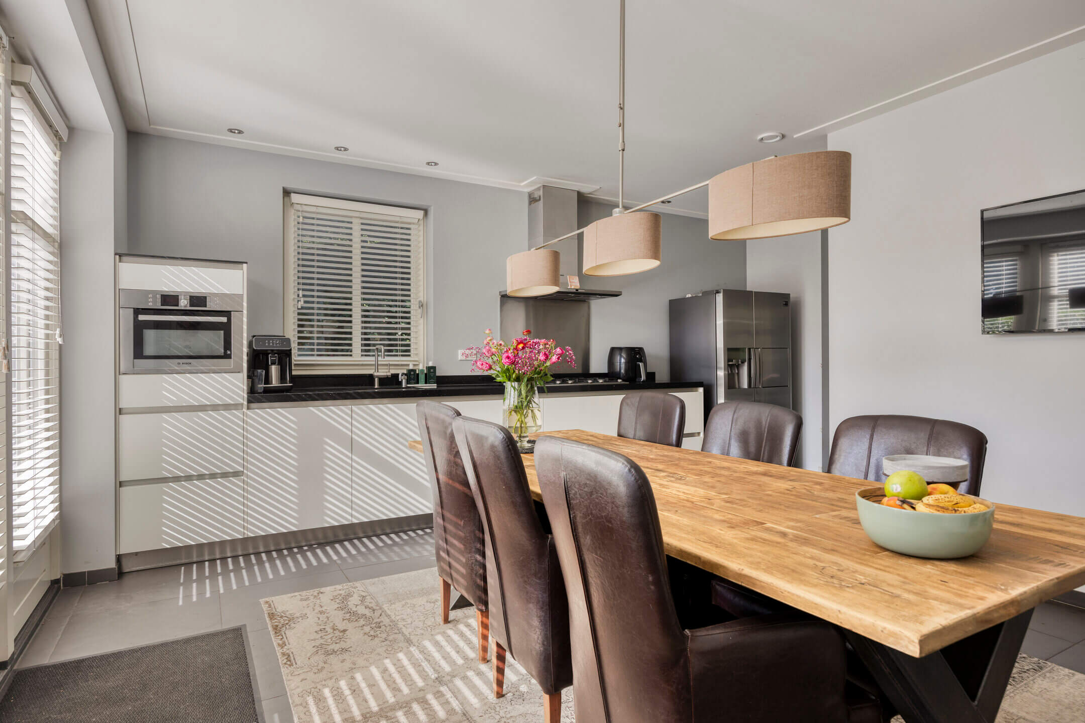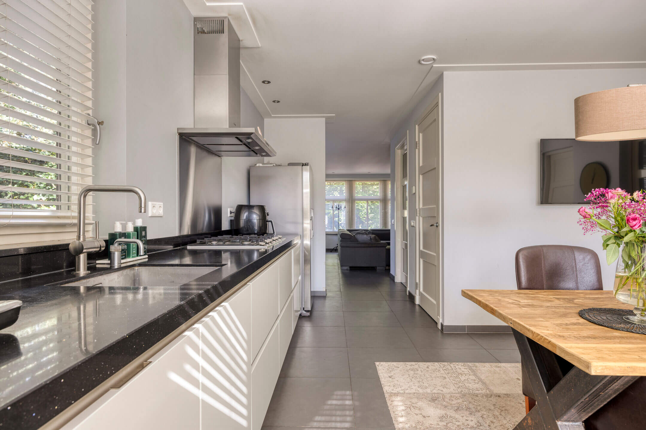 In de woonkamer zorgt een erker aan de voorzijde voor een prachtige lichtinval. De ruimte rondom de haard nodigt uit tot lange avonden ontspannen zitten. Vanuit de woonkamer loopt u door naar de royale woonkeuken, die van alle gemakken is voorzien: een 6-pits gasfornuis, rvs afzuigkap, oven, vaatwasser, Quooker en een spoelbak. Via een loopdeur bereikt u het terras – perfect voor binnen-buiten leven.