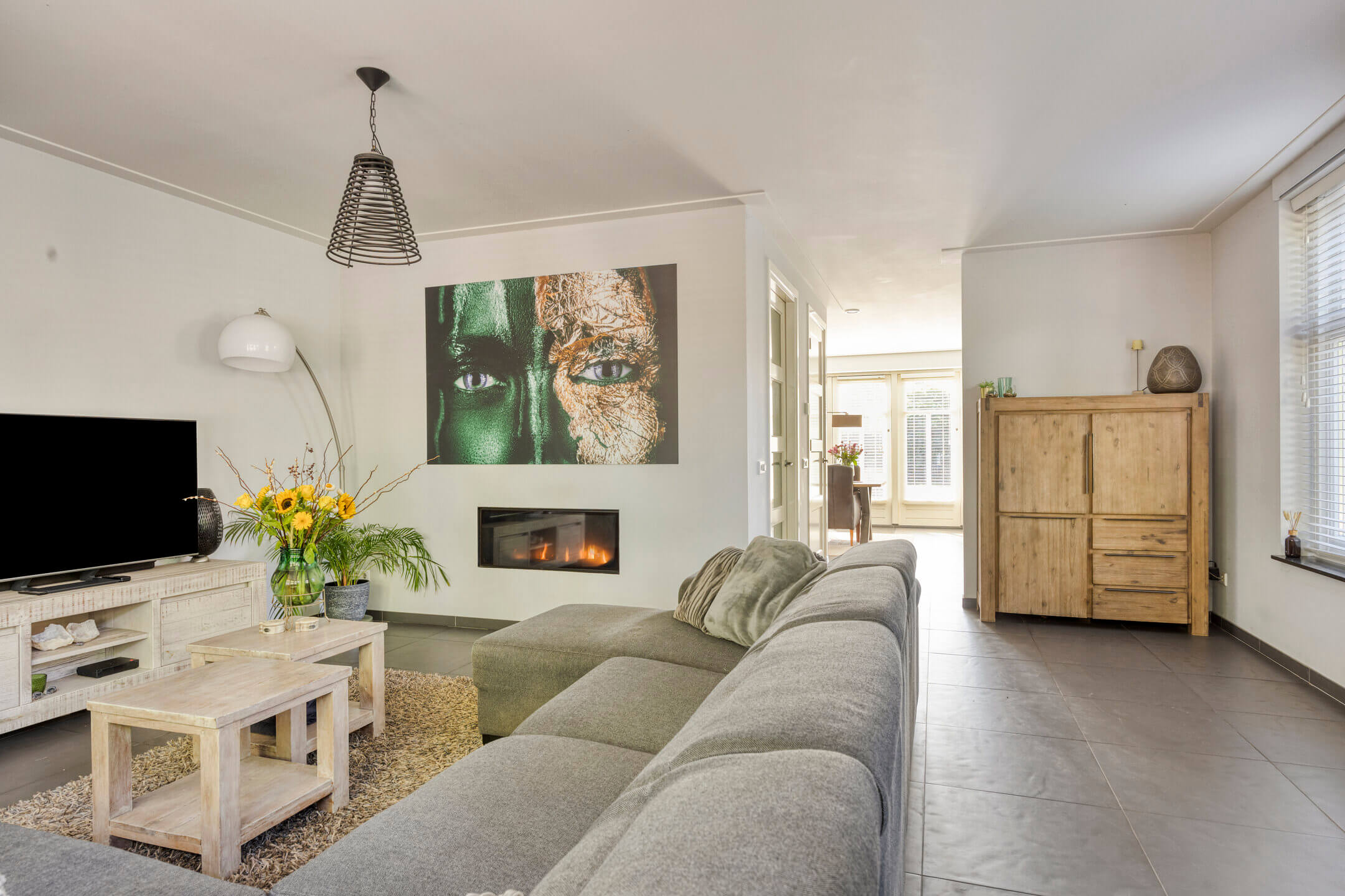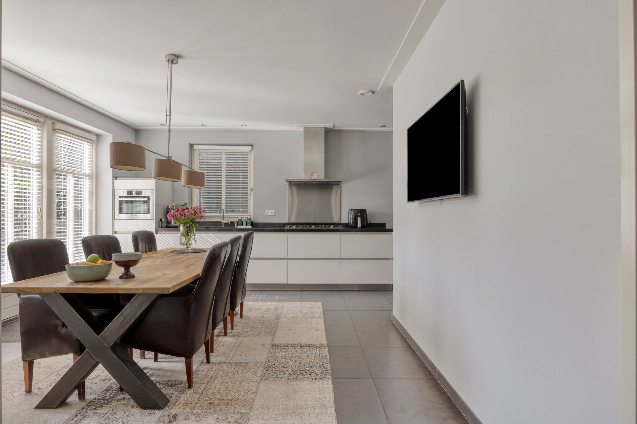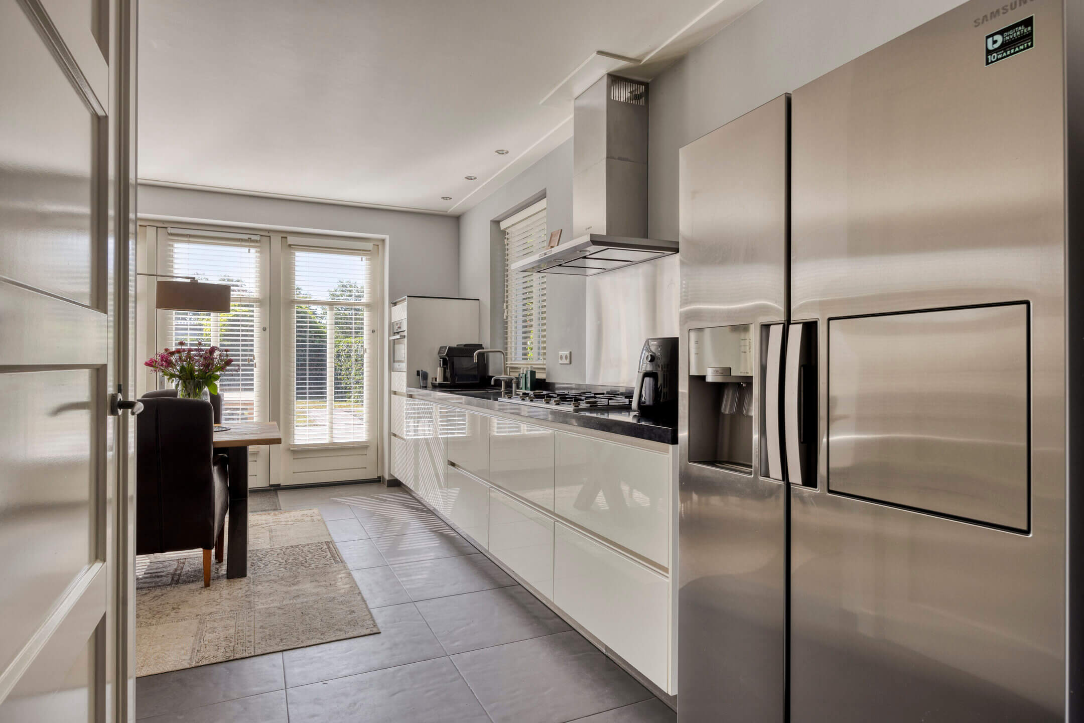 In de woonkamer zorgt een erker aan de voorzijde voor een prachtige lichtinval. De ruimte rondom de haard nodigt uit tot lange avonden ontspannen zitten. Vanuit de woonkamer loopt u door naar de royale woonkeuken, die van alle gemakken is voorzien: een 6-pits gasfornuis, rvs afzuigkap, oven, vaatwasser, Quooker en een spoelbak. Via een loopdeur bereikt u het terras – perfect voor binnen-buiten leven.