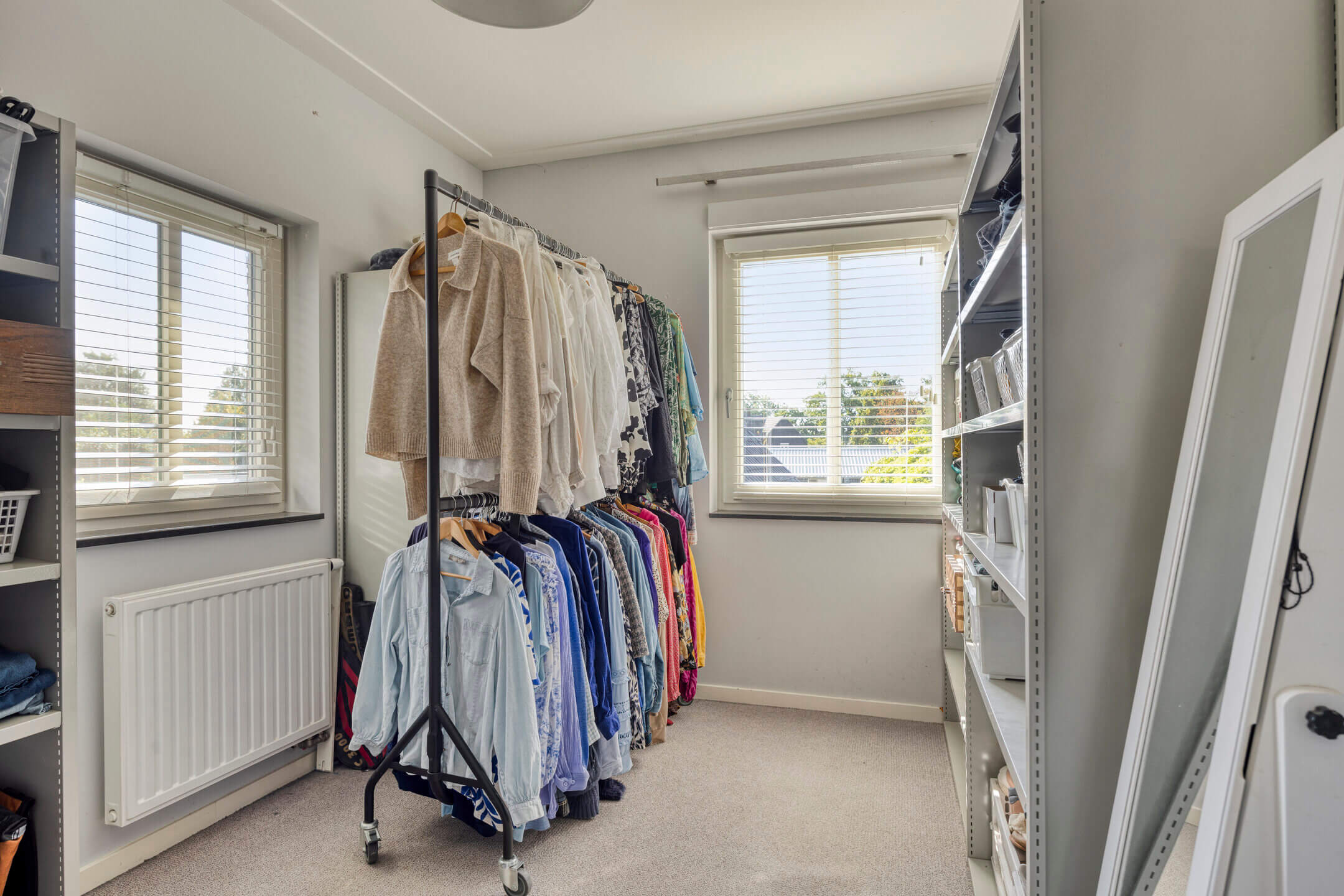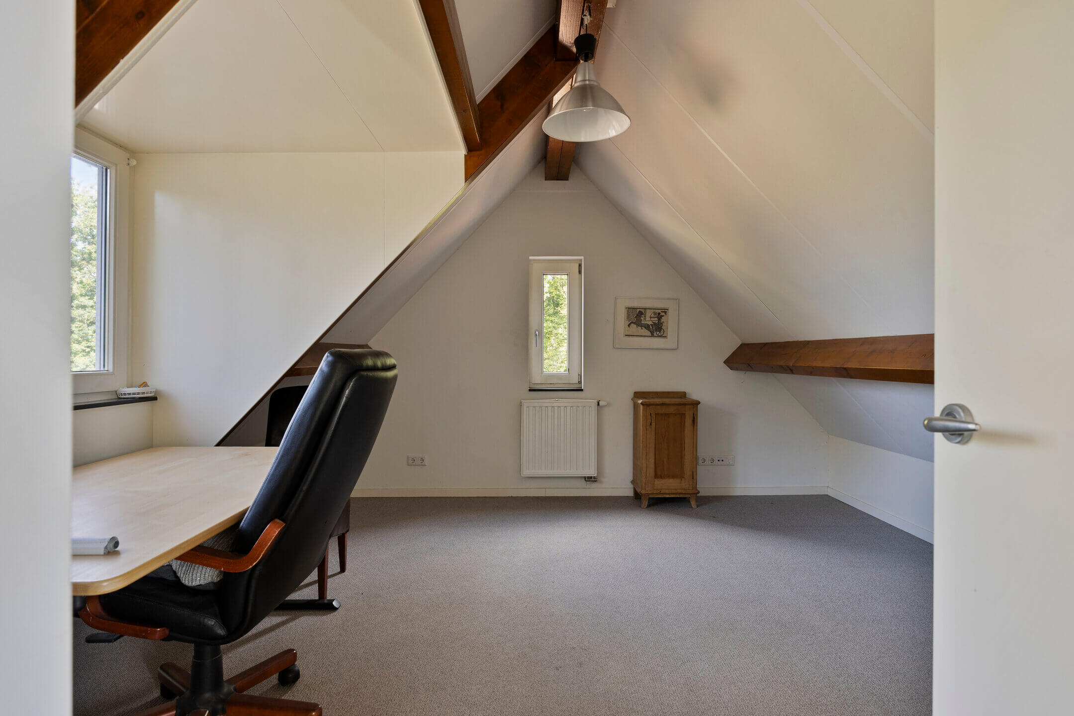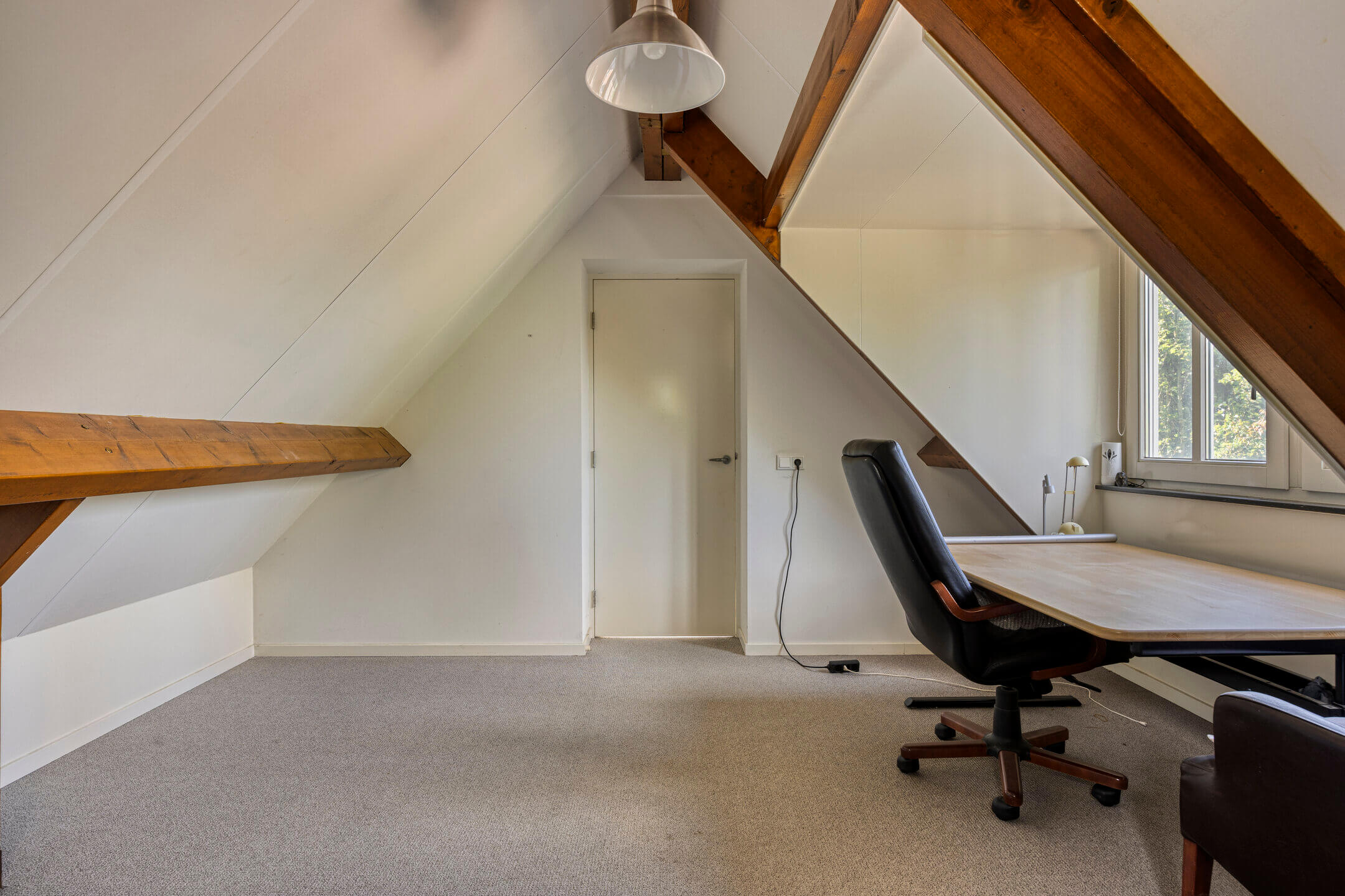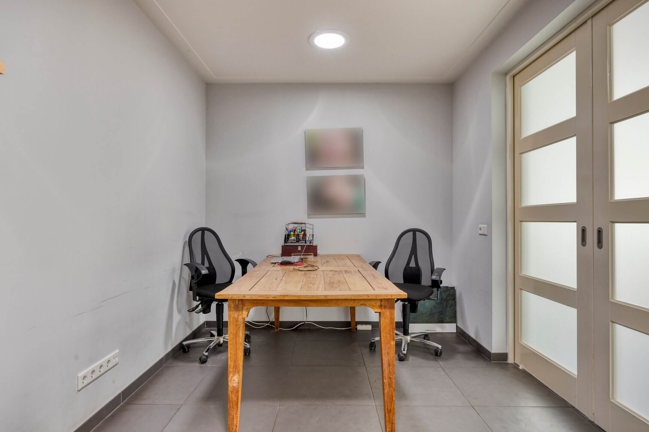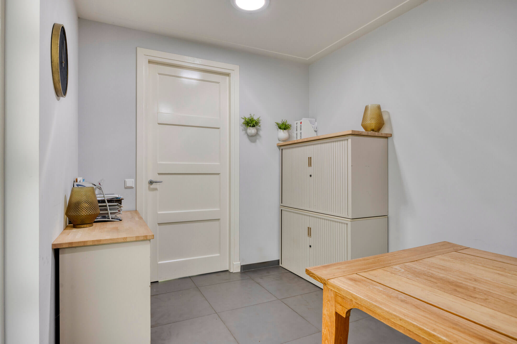 Aansluitend aan de keuken vindt u een praktische proviandkast onder de trap en een multifunctionele kantoorruimte, afgesloten met stijlvolle schuifdeuren. Deze ruimte is ideaal als werkplek, speelkamer of hobbyruimte. Het kantoor is ook vanuit de hal te bereiken.