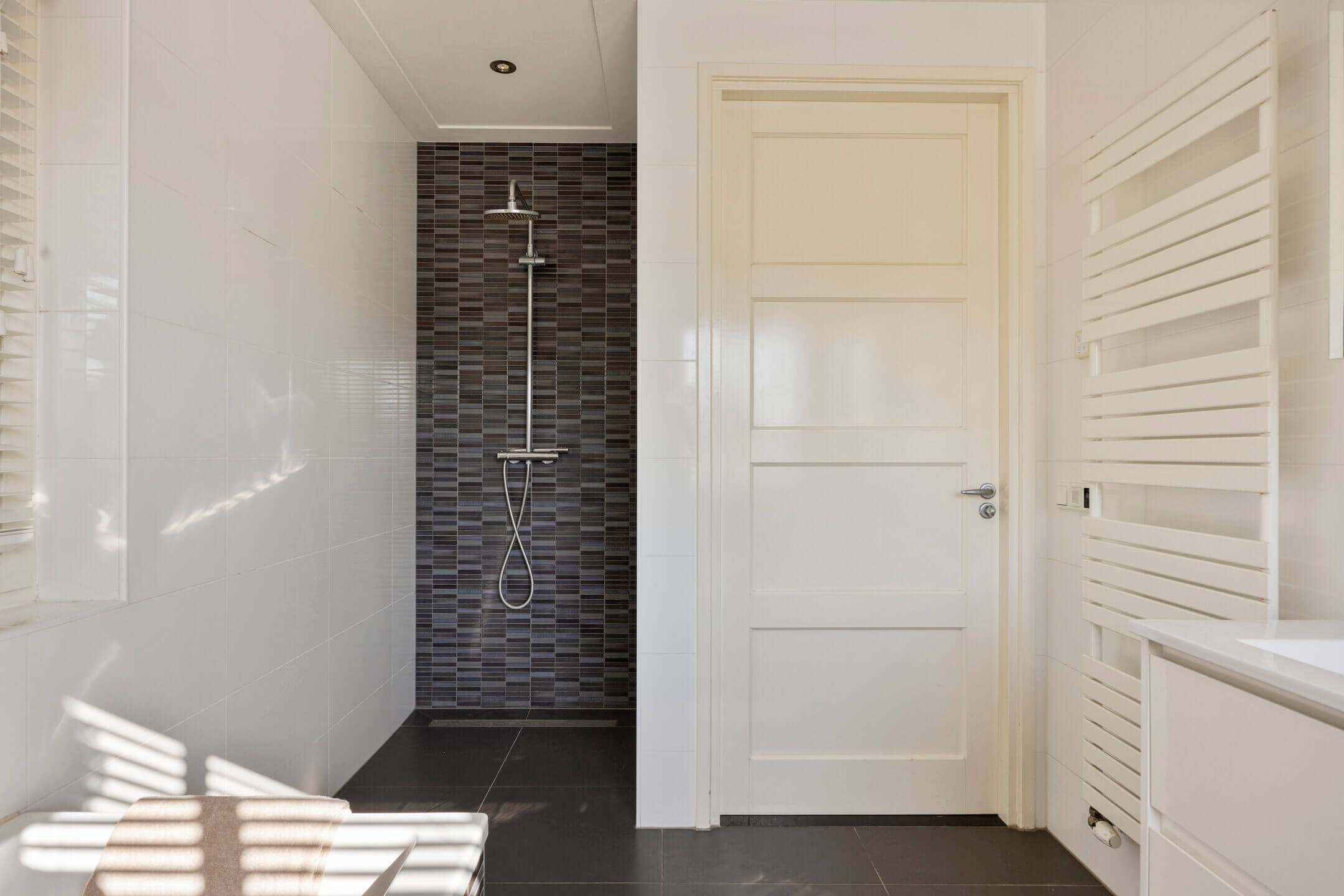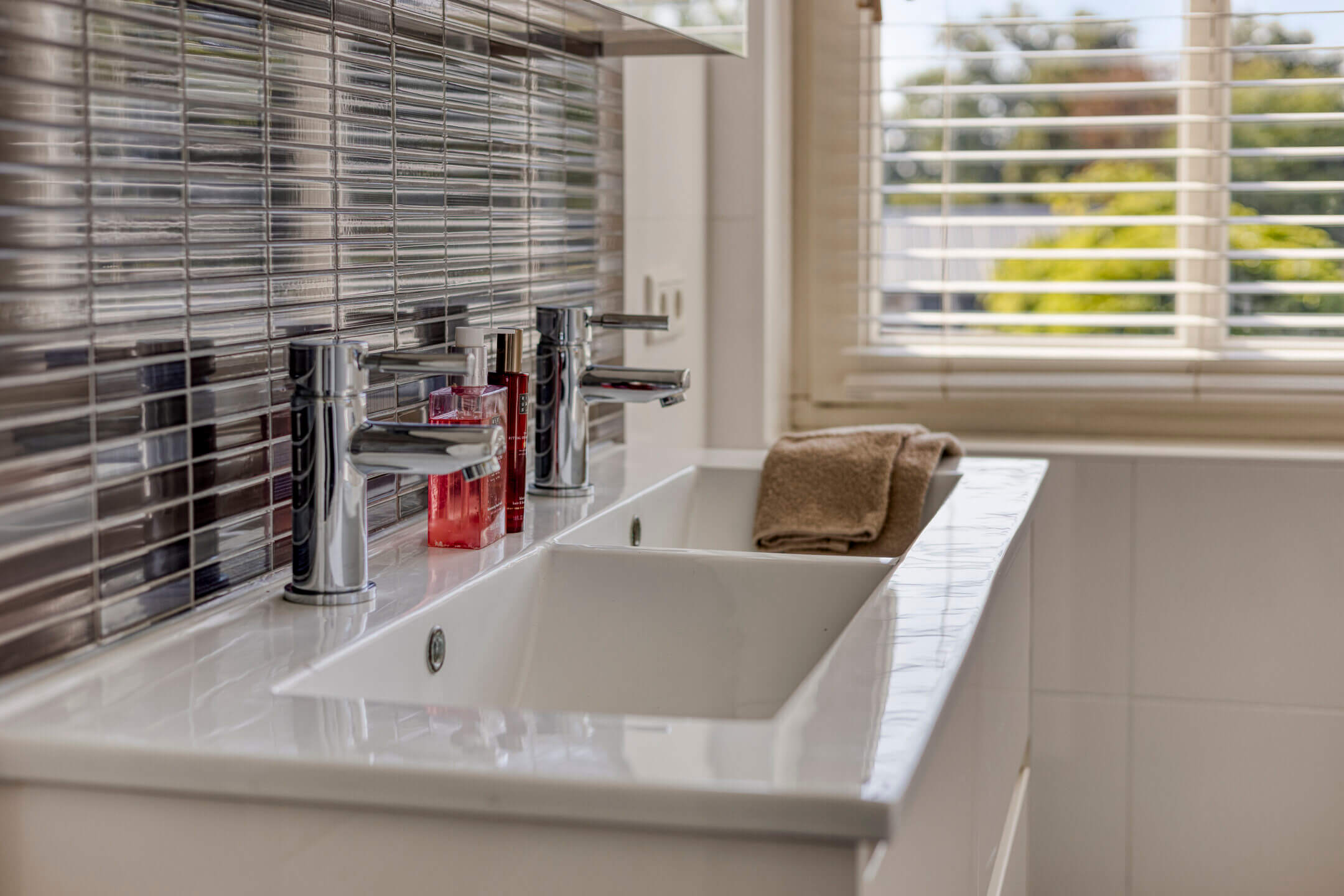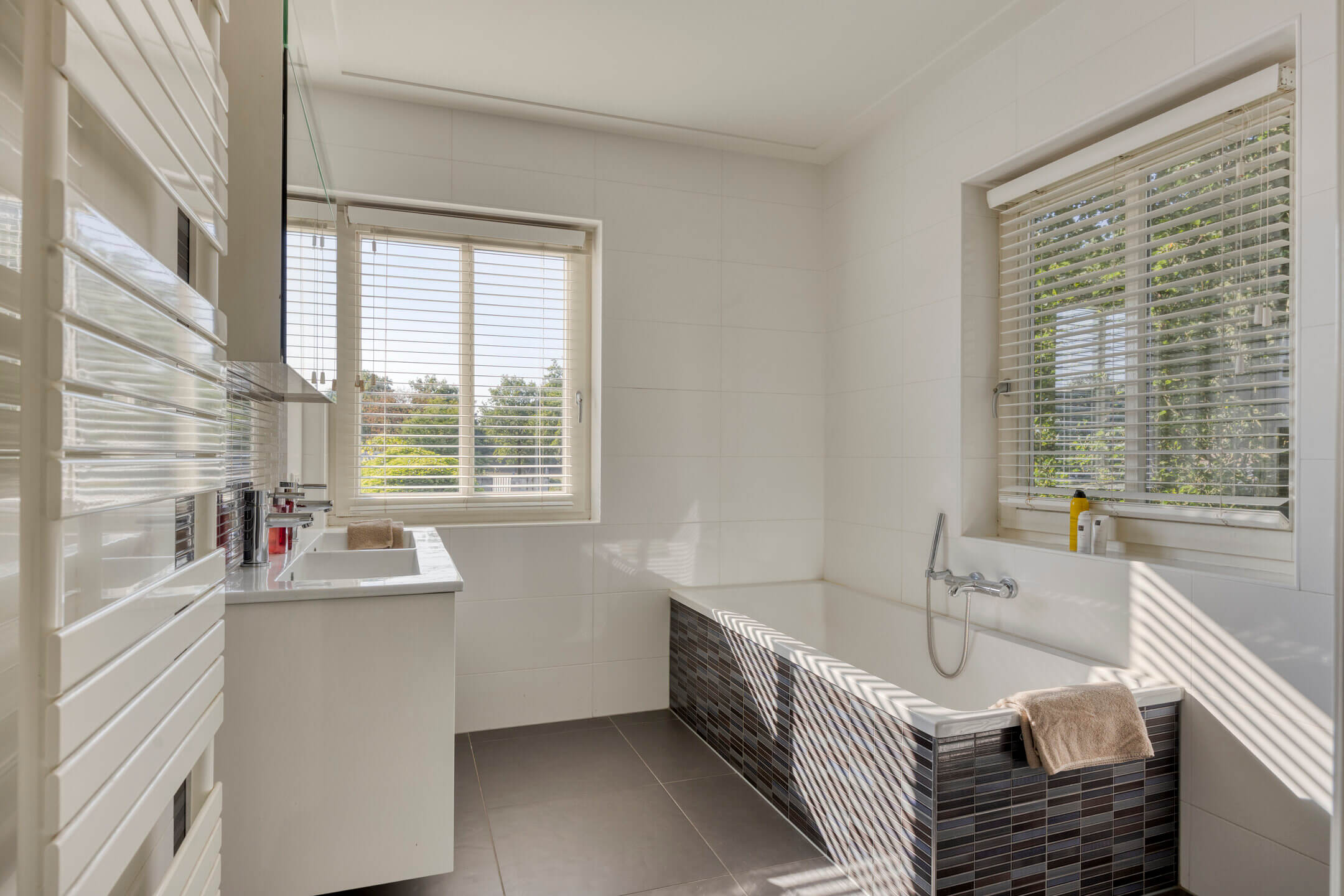 De badkamer is een oase van rust, met strak grijstinten tegelwerk, een ligbad, dubbele wastafel met spiegelkast en een ruime inloopdouche. Vanuit het raam kijkt u heerlijk uit over de tuin.