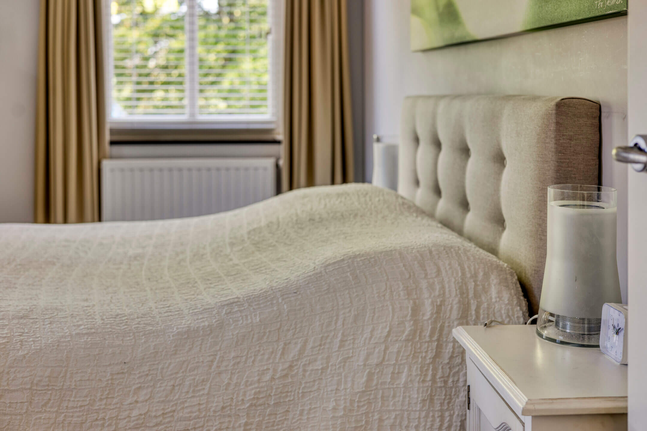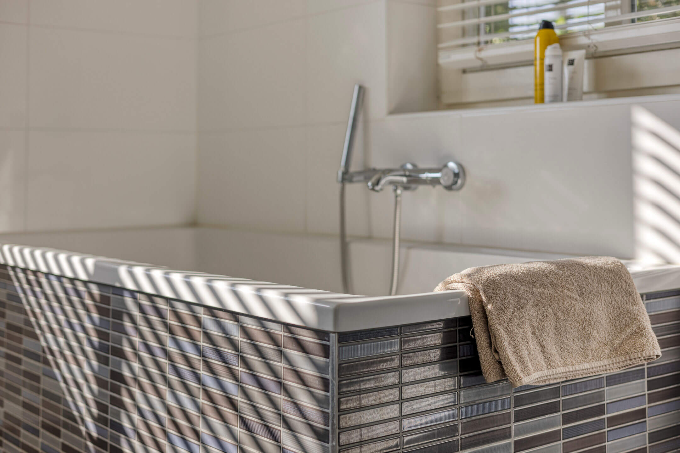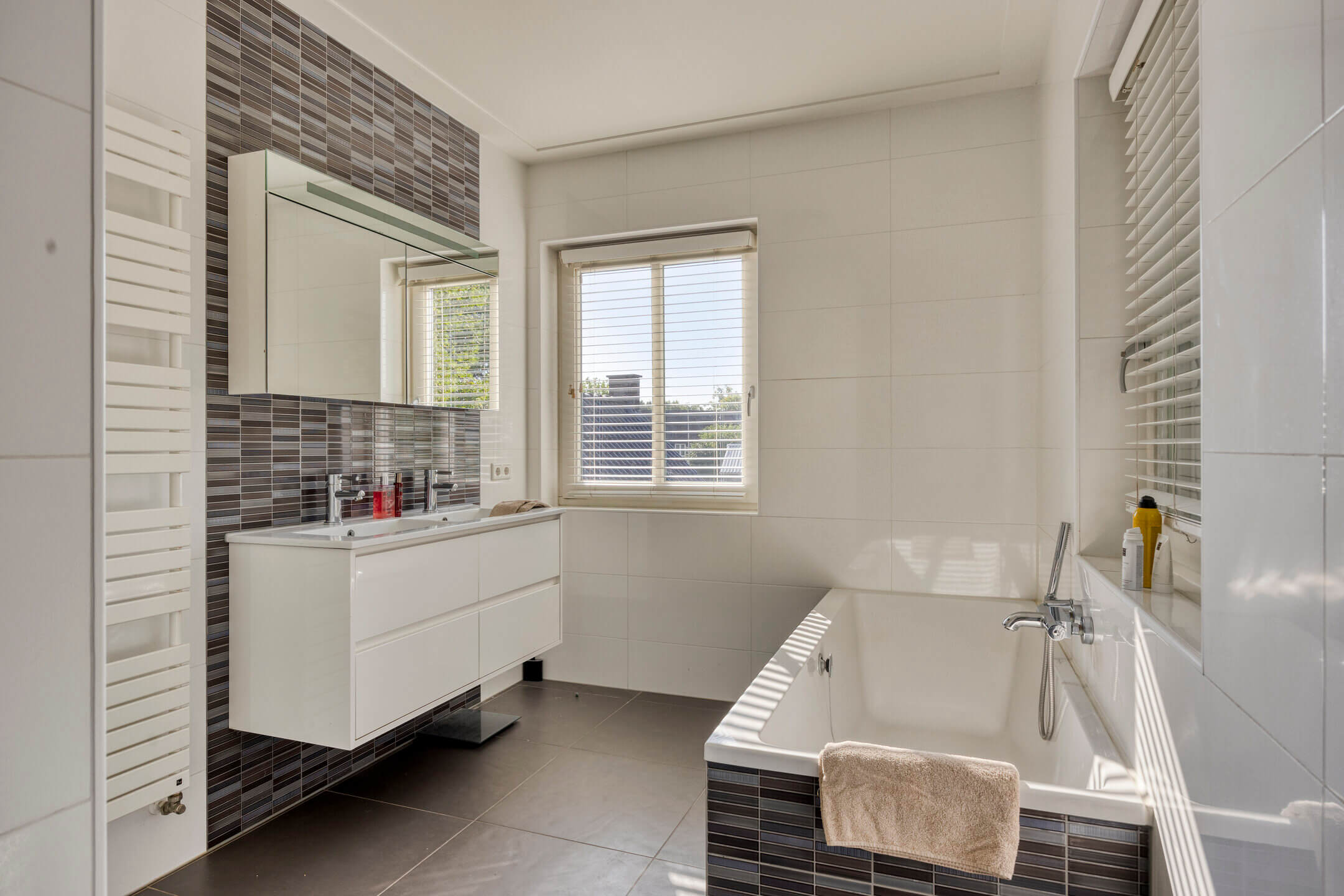 De badkamer is een oase van rust, met strak grijstinten tegelwerk, een ligbad, dubbele wastafel met spiegelkast en een ruime inloopdouche. Vanuit het raam kijkt u heerlijk uit over de tuin.