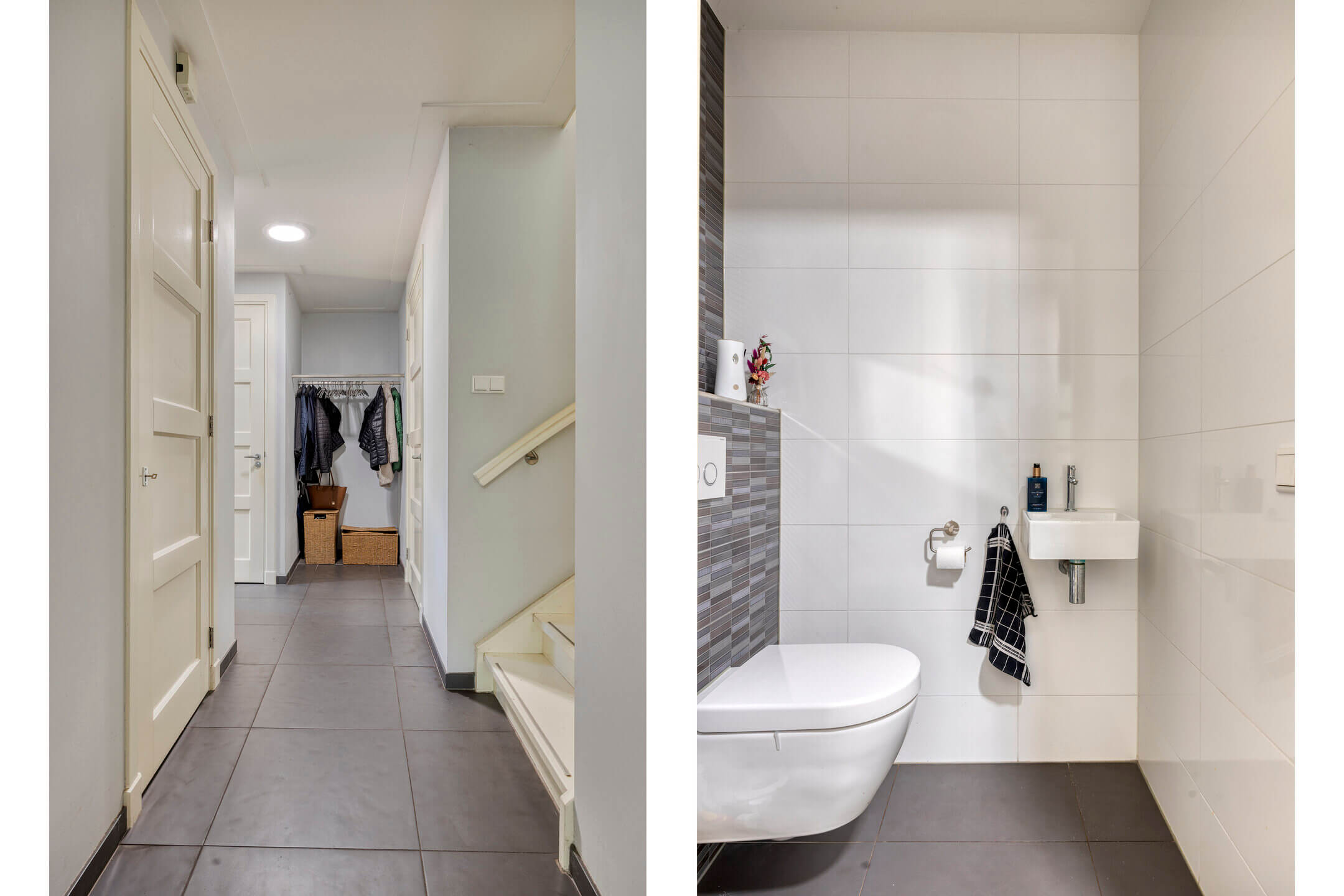 De stijlvolle entree geeft direct een warm welkom en biedt toegang tot het moderne, volledig betegelde toilet met hangcloset en fonteintje, een royaal kantoor en de sfeervolle woonkamer. De gehele begane grond is voorzien van een fraaie, doorlopende tegelvloer met vloerverwarming – comfortabel én strak afgewerkt. In de hal, het kantoor en de bijkeuken zorgen lichtkokers voor extra natuurlijk daglicht in de woning.